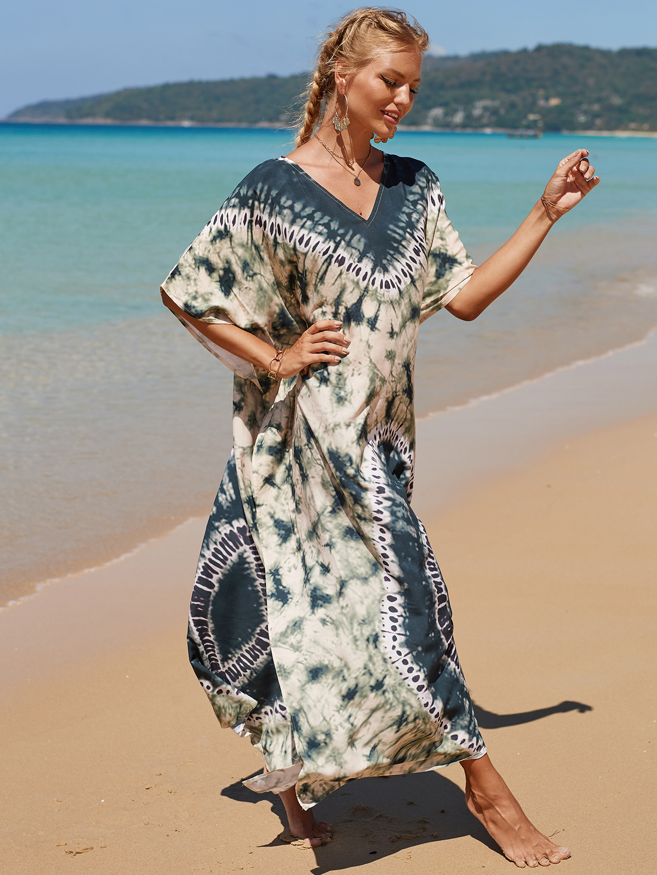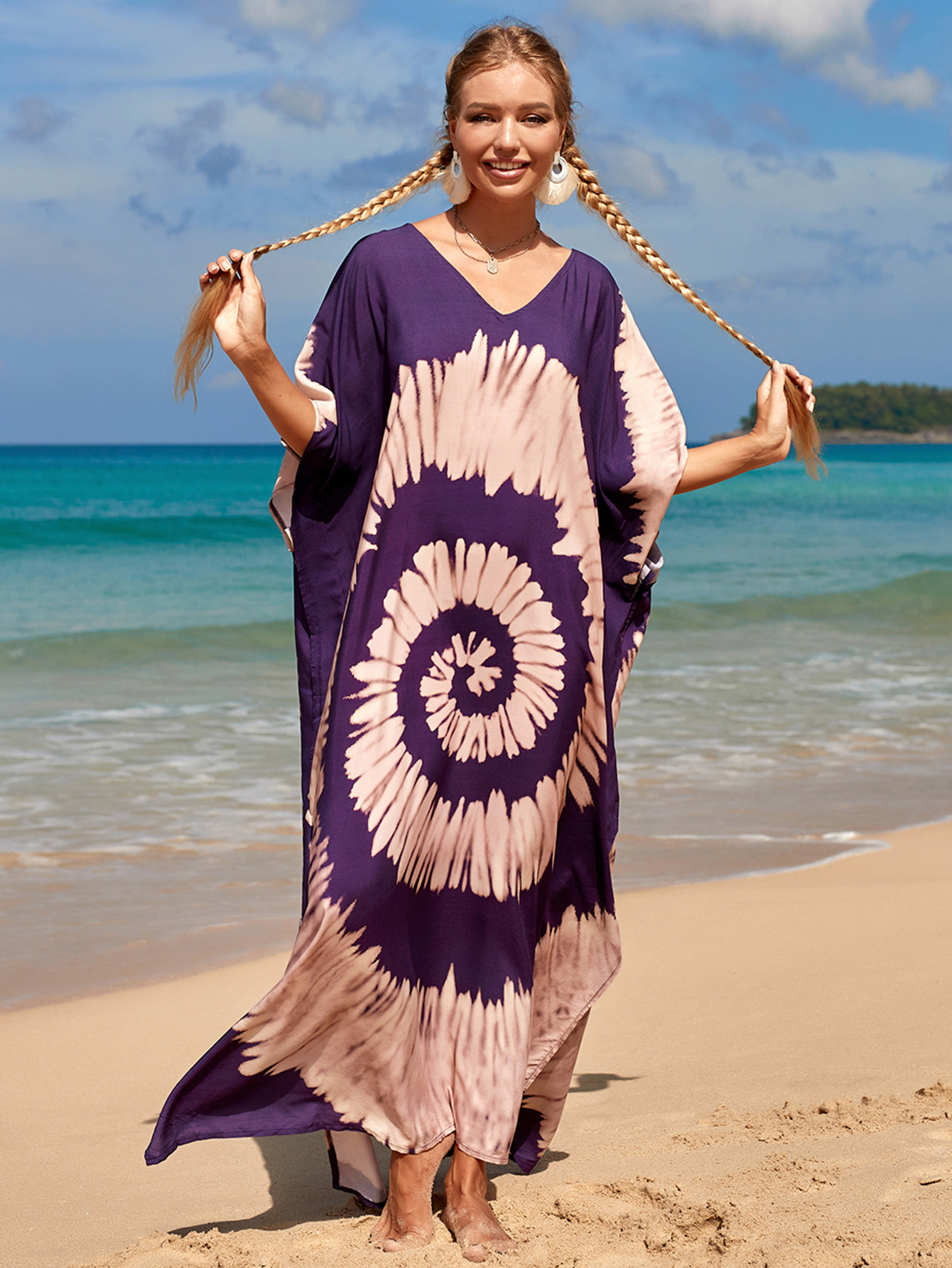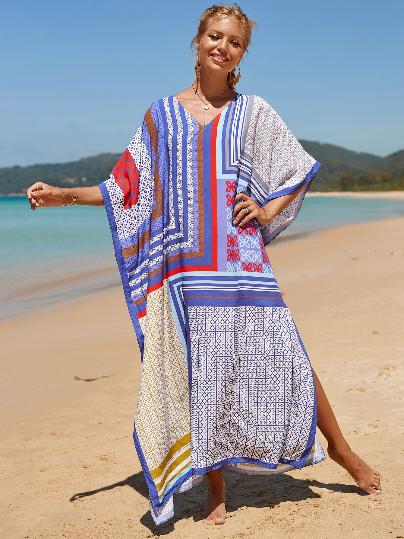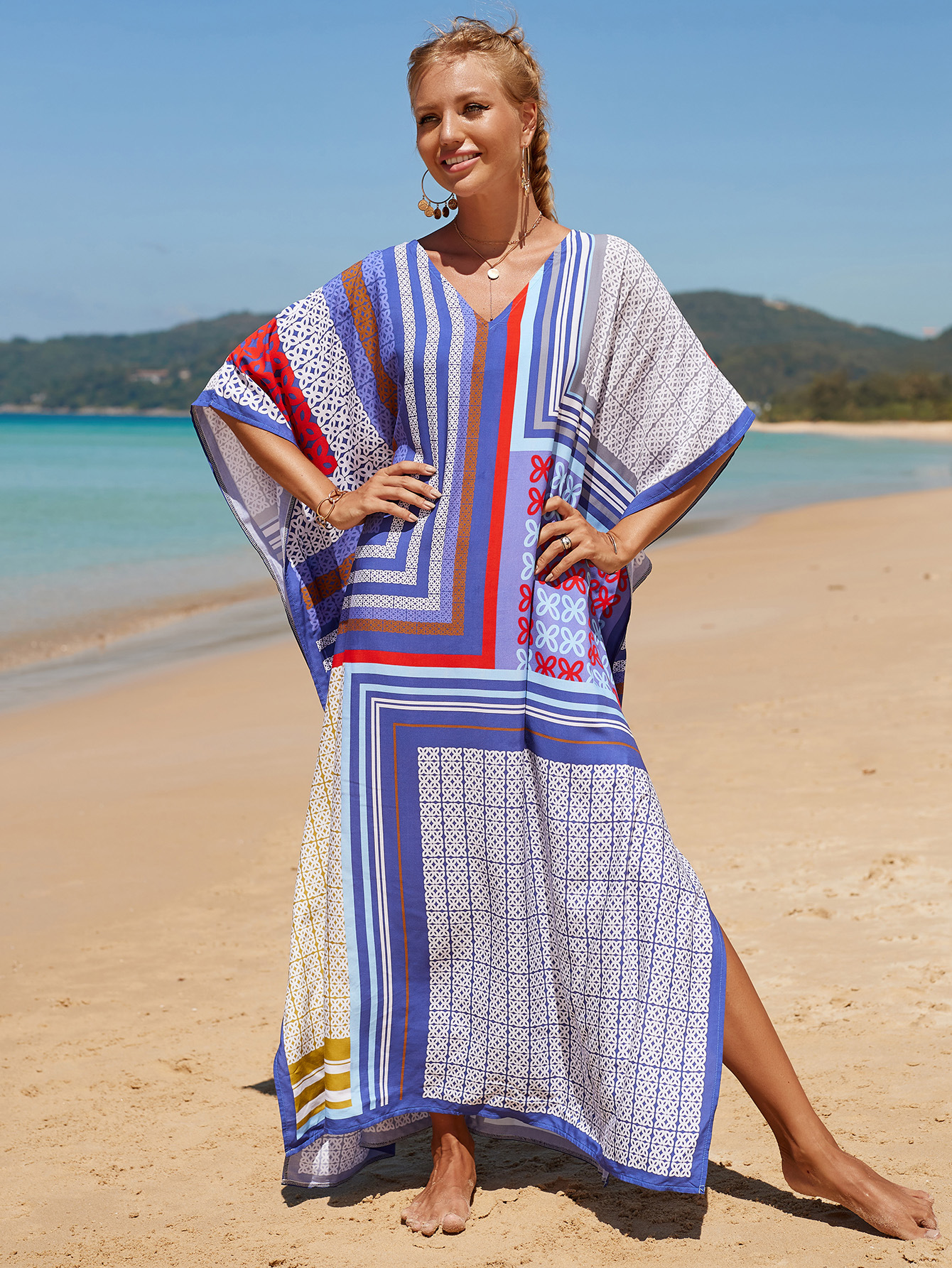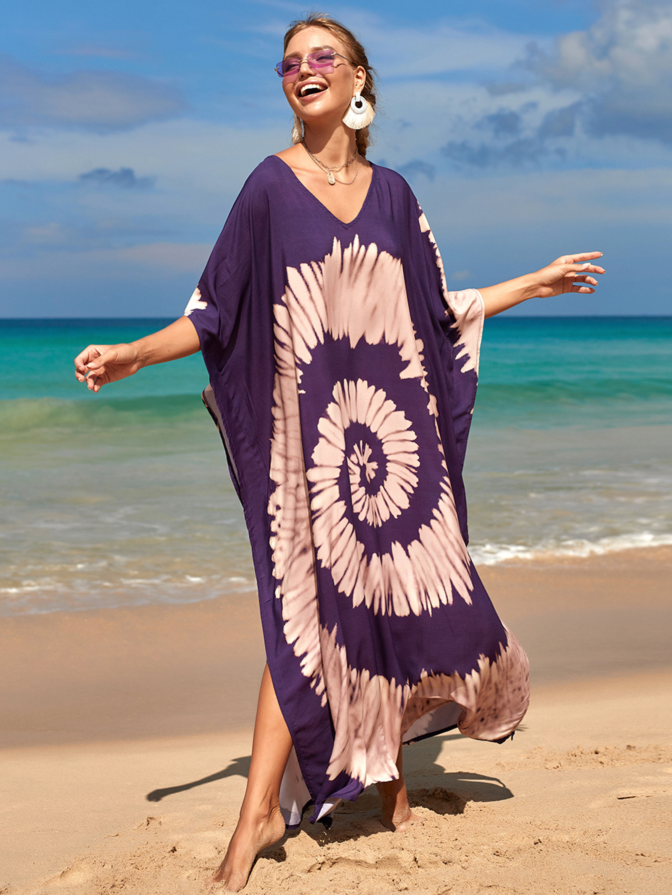 欧美新款人棉印花沙滩裙宽松长袍海边度假比基尼泳衣罩衫防晒衫女 English | 投诉