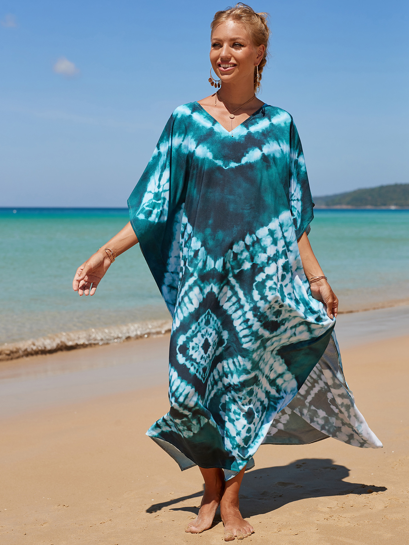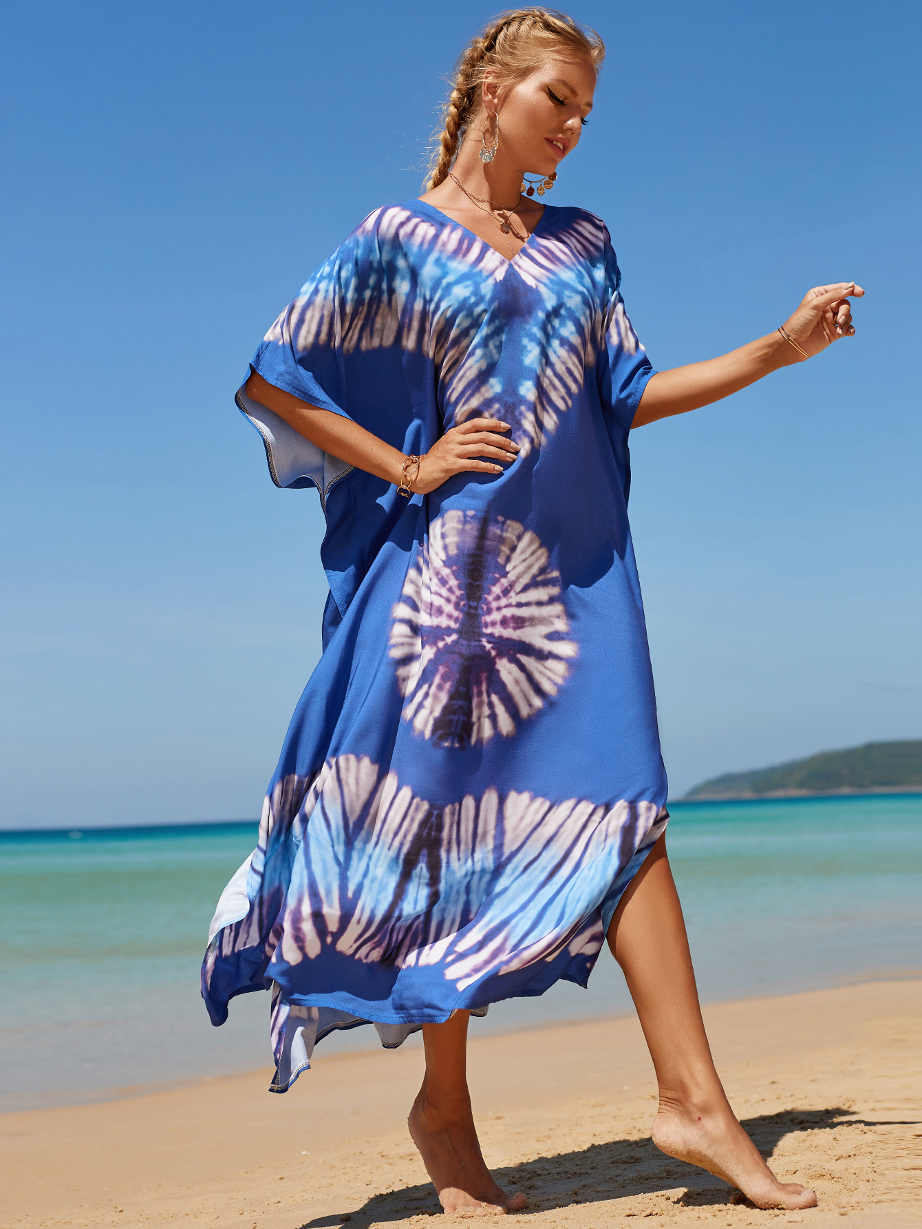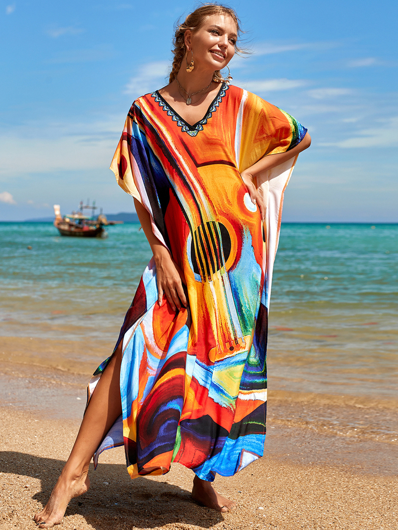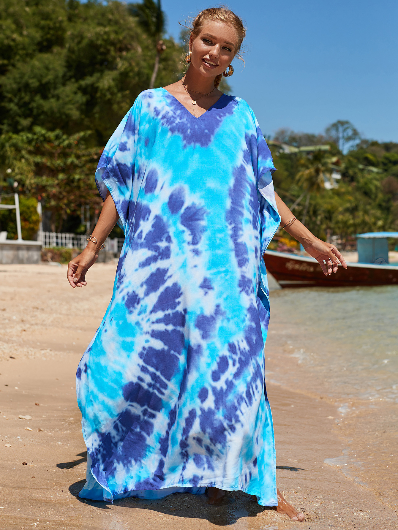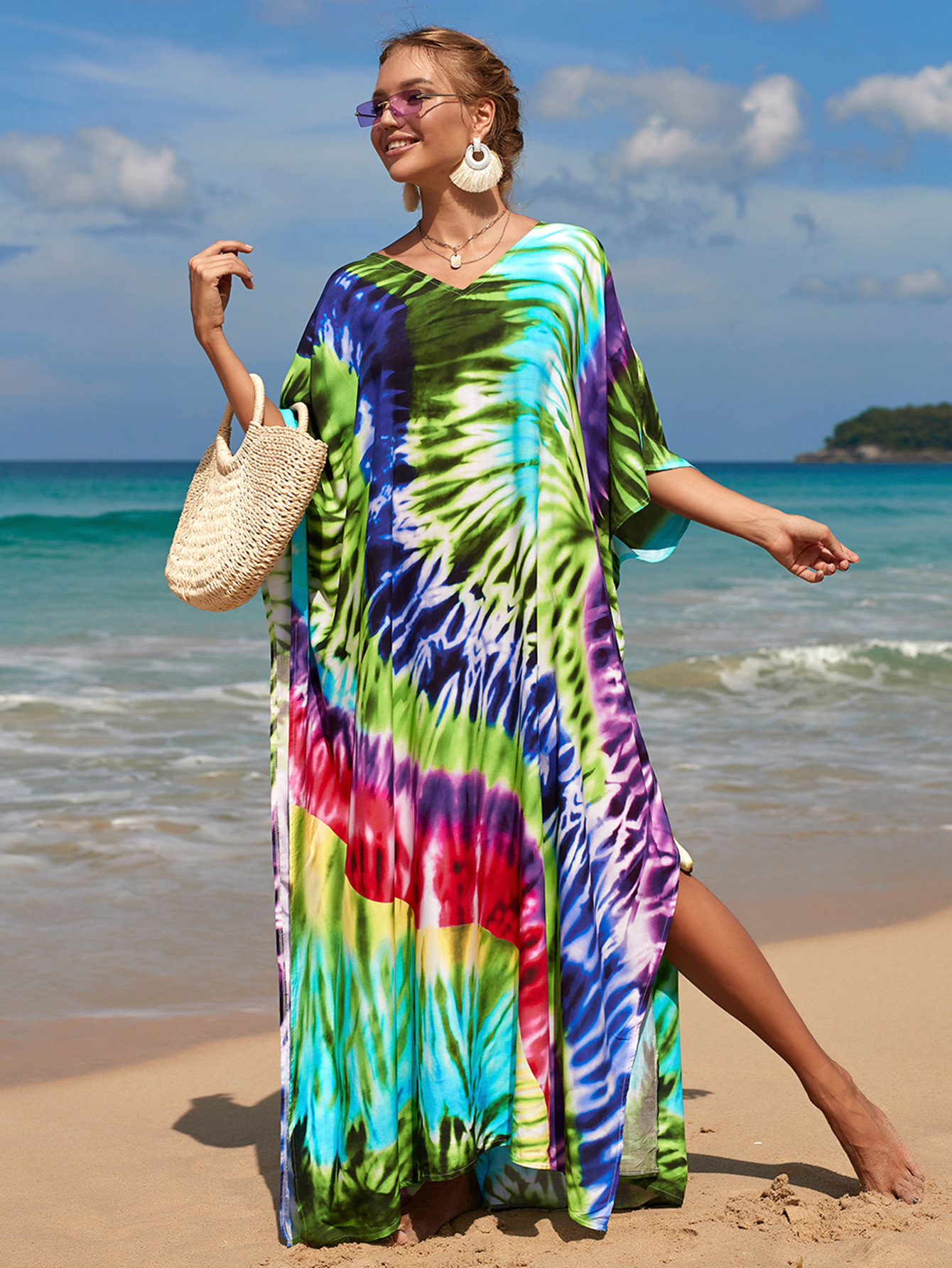 欧美新款人棉印花沙滩裙宽松长袍海边度假比基尼泳衣罩衫防晒衫女 English | 投诉
