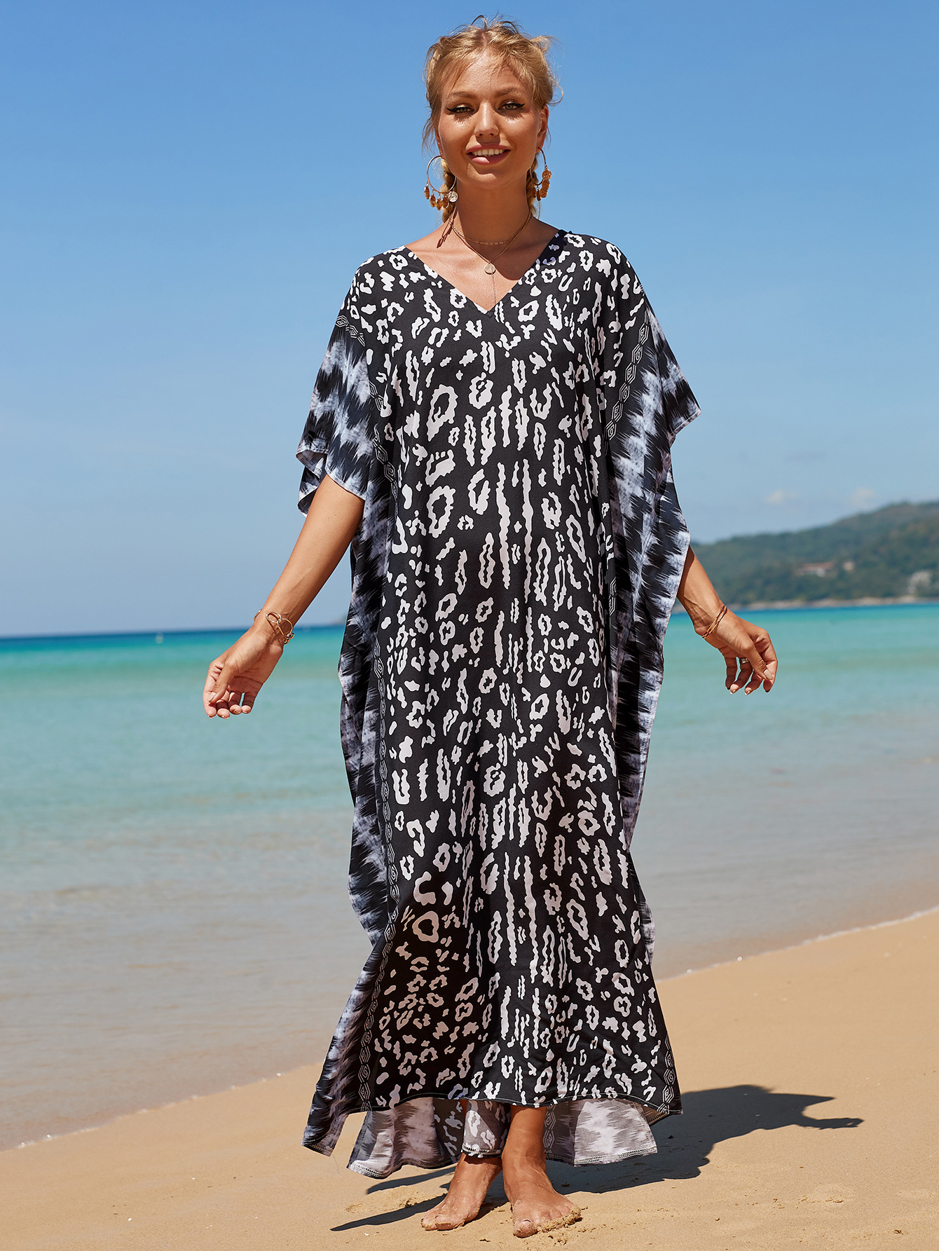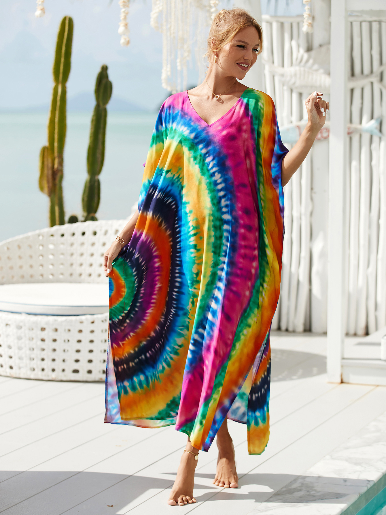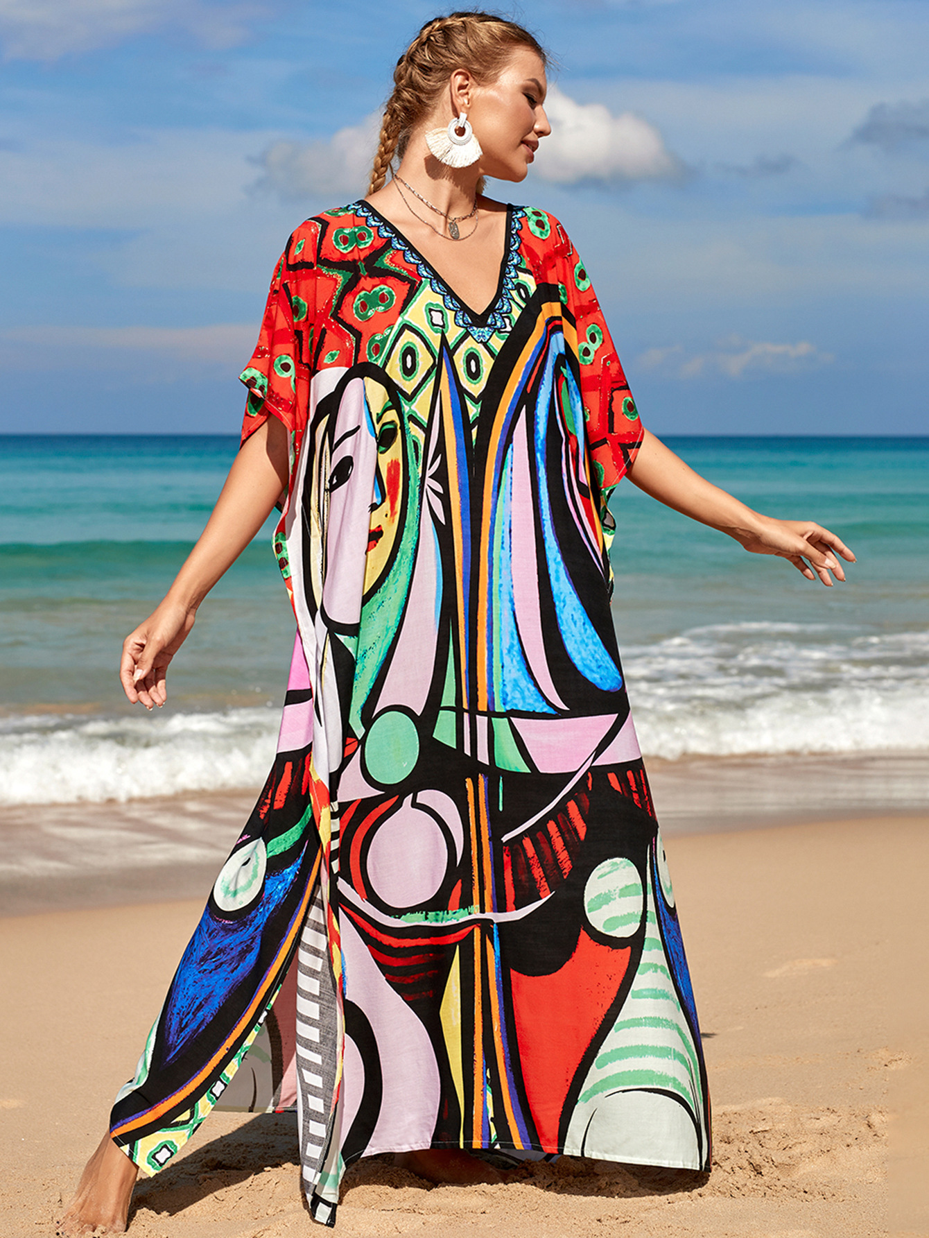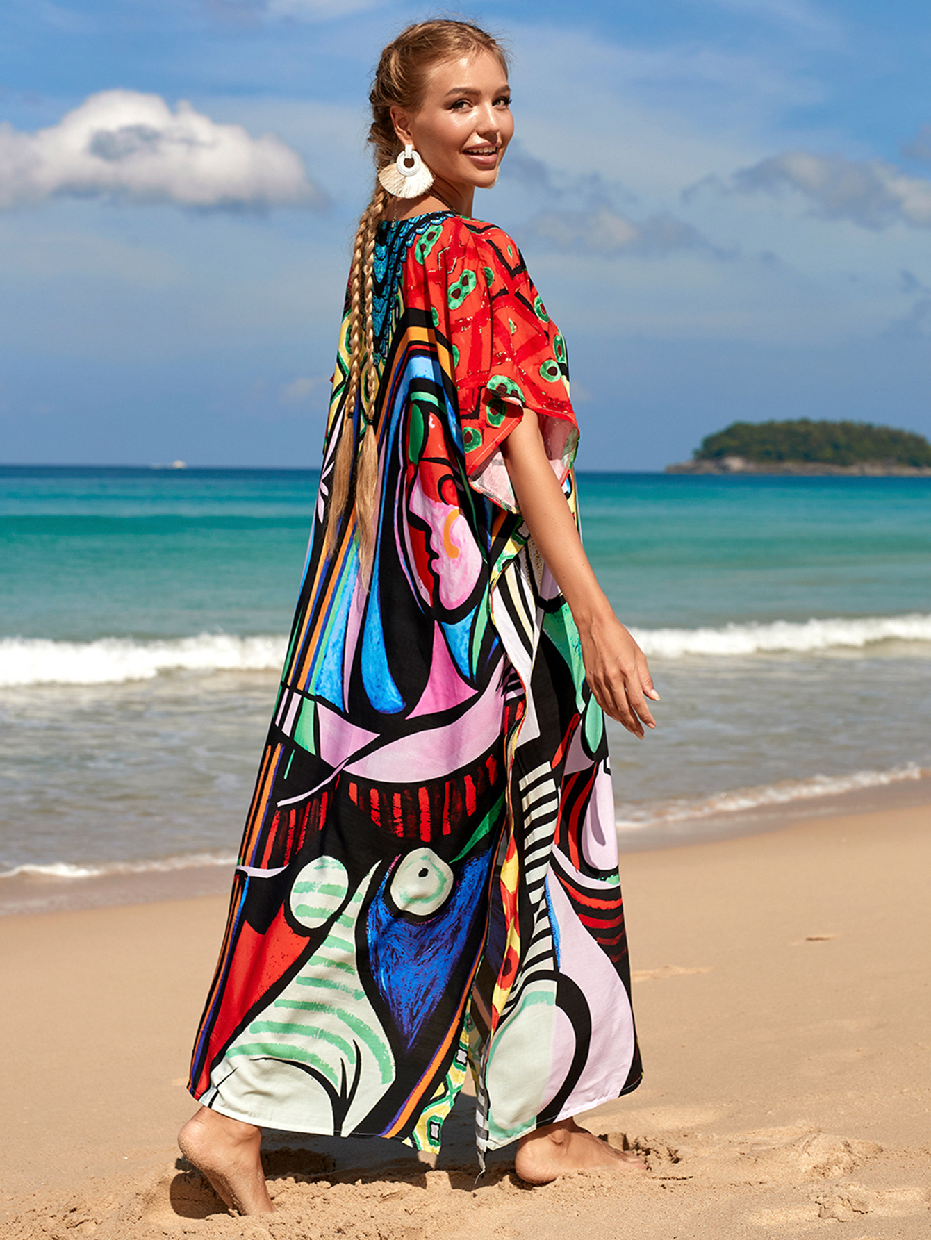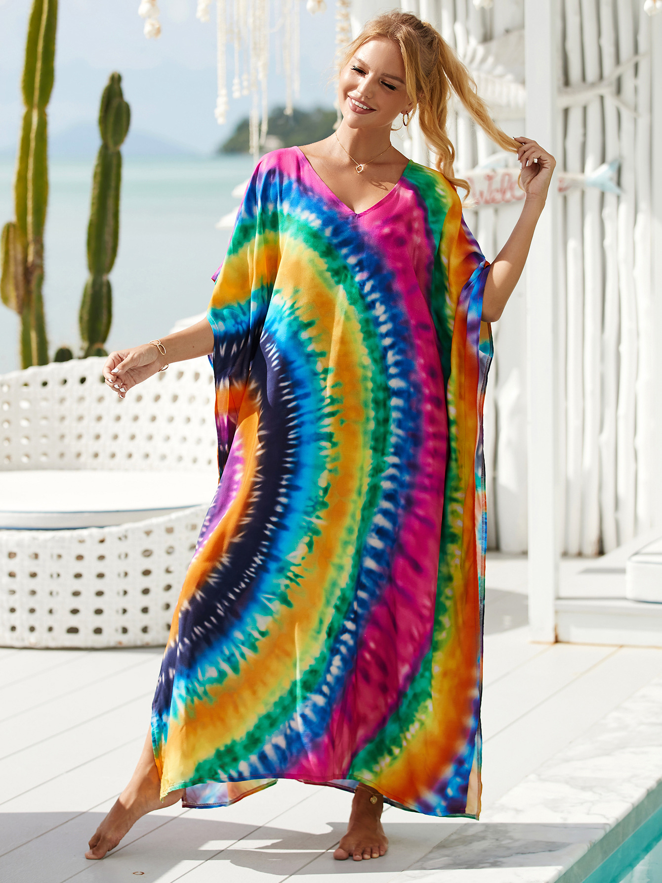 欧美新款人棉印花沙滩裙宽松长袍海边度假比基尼泳衣罩衫防晒衫女