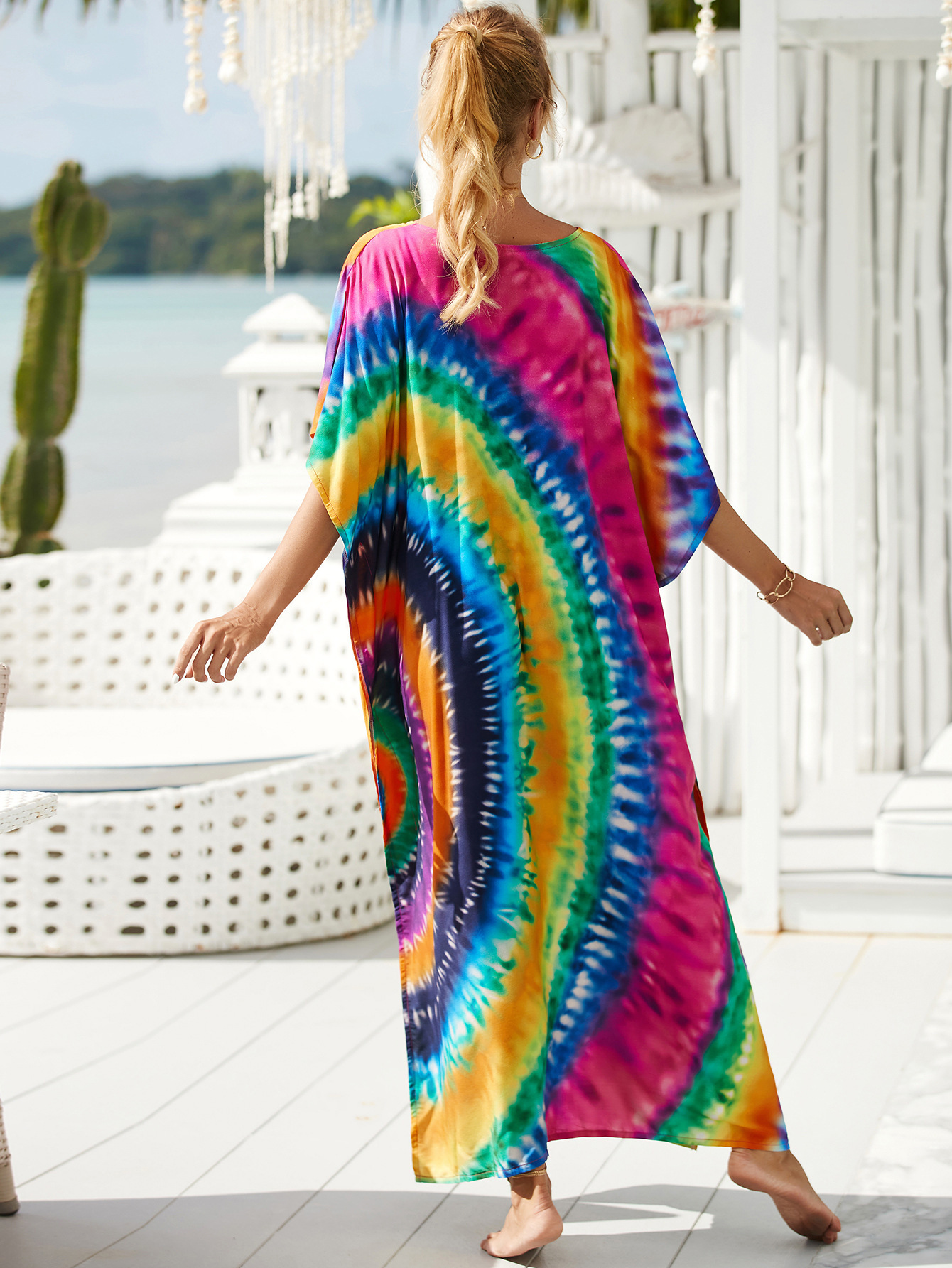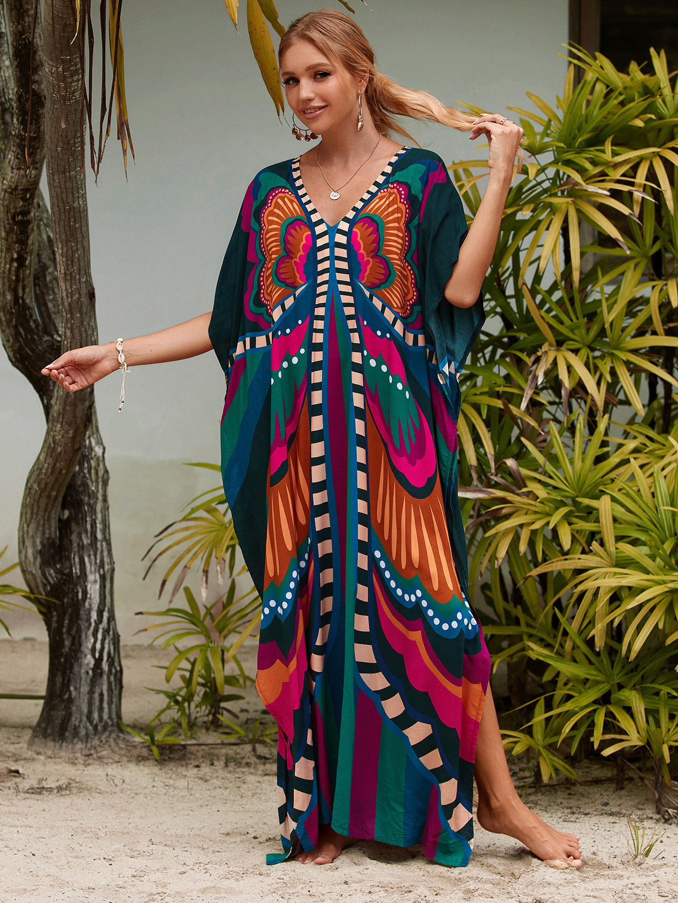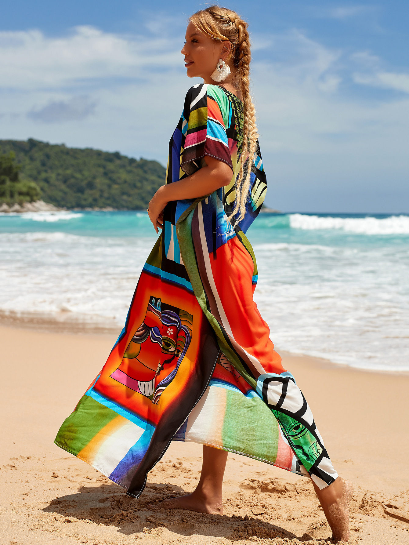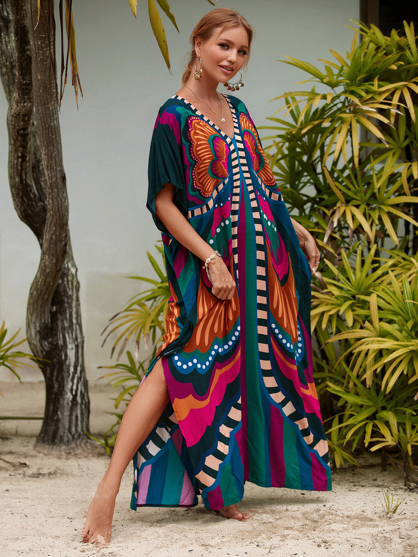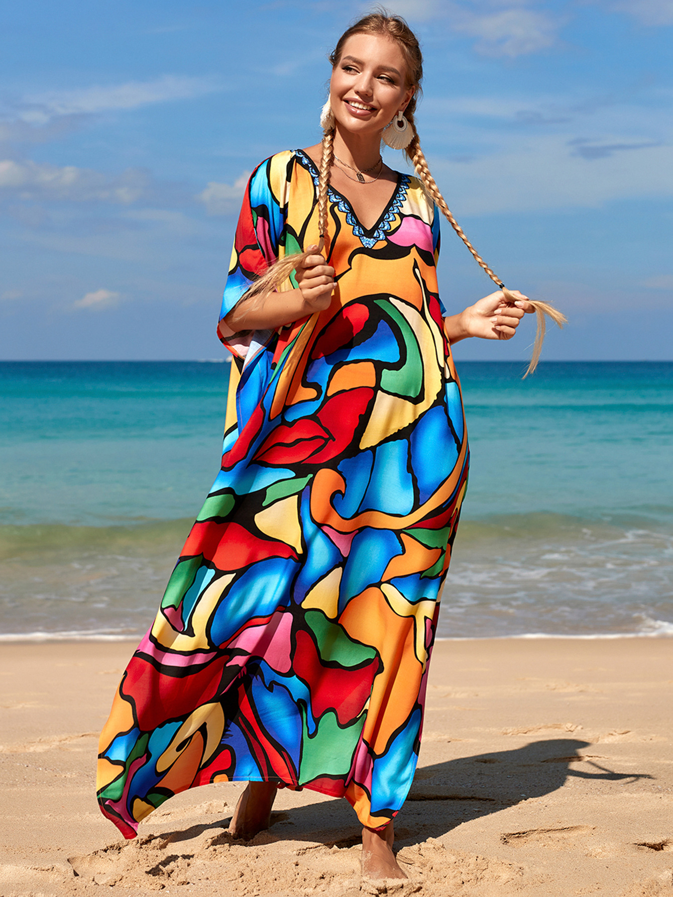 欧美新款人棉印花沙滩裙宽松长袍海边度假比基尼泳衣罩衫防晒衫女