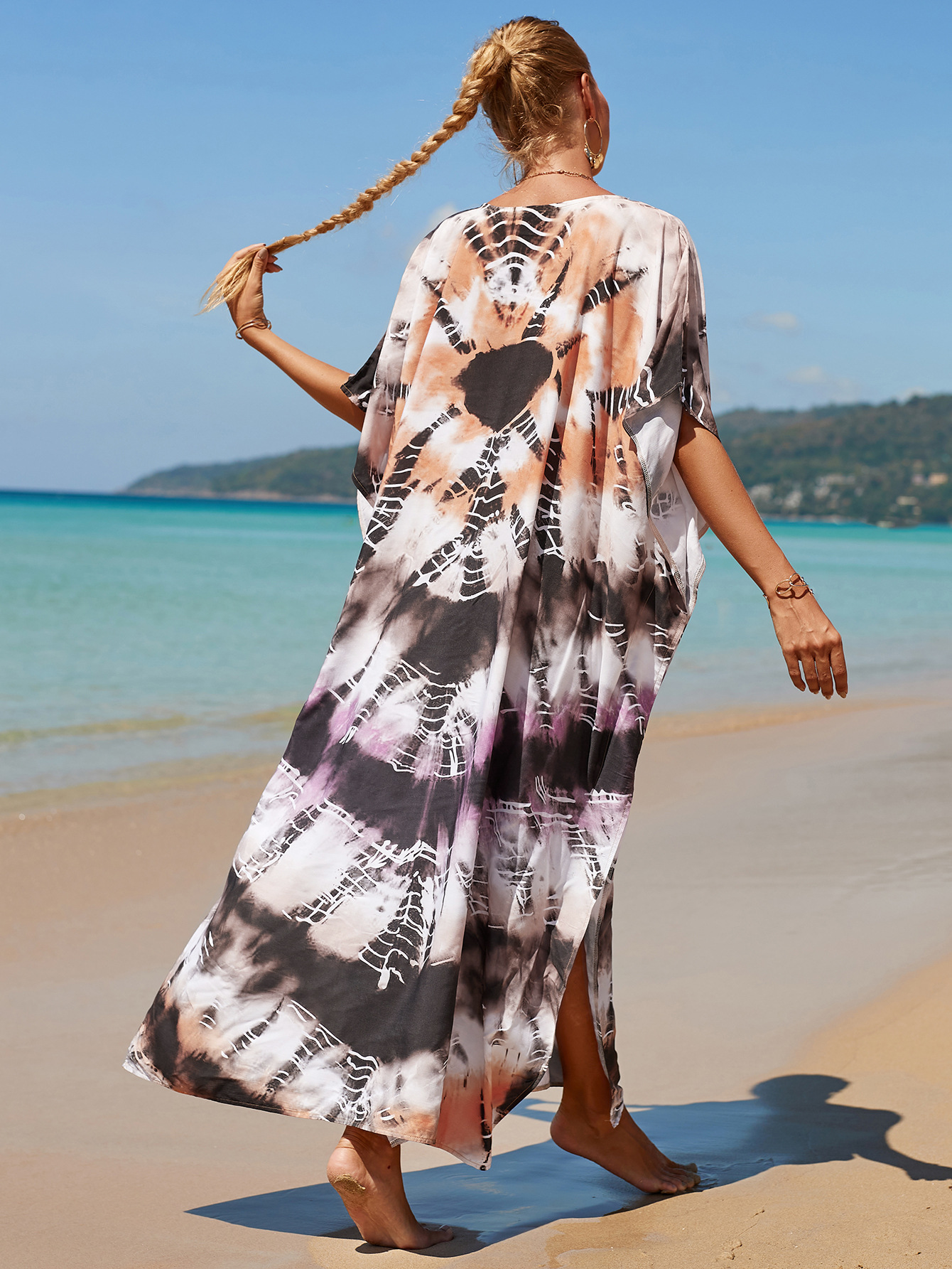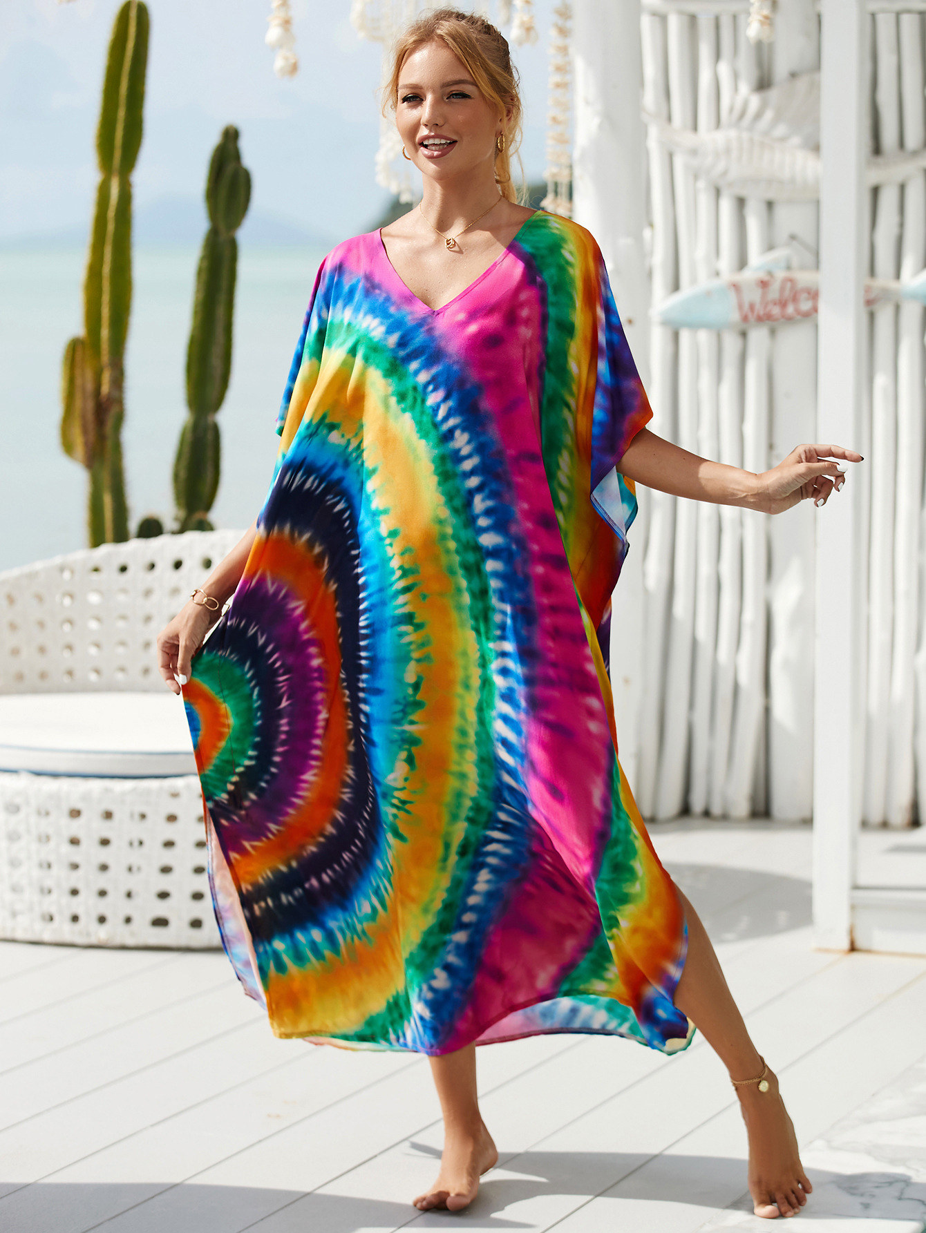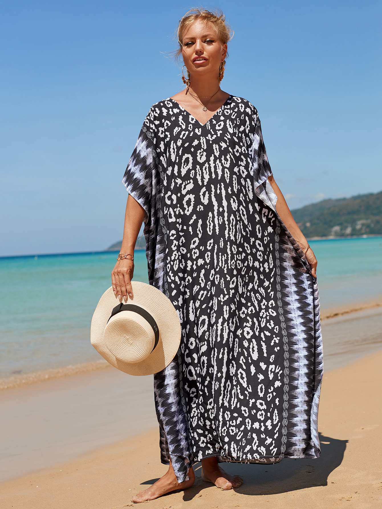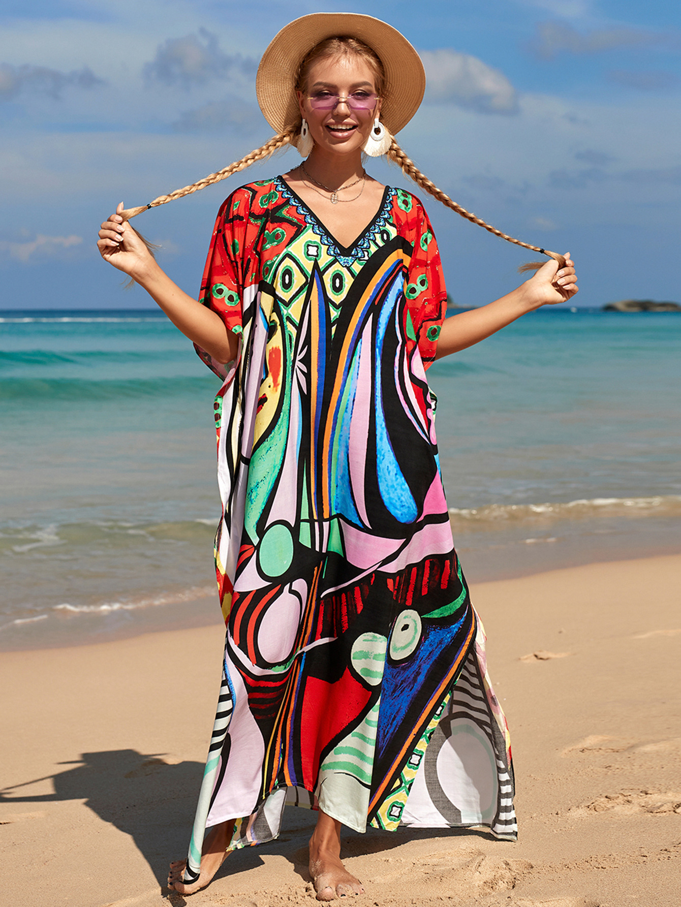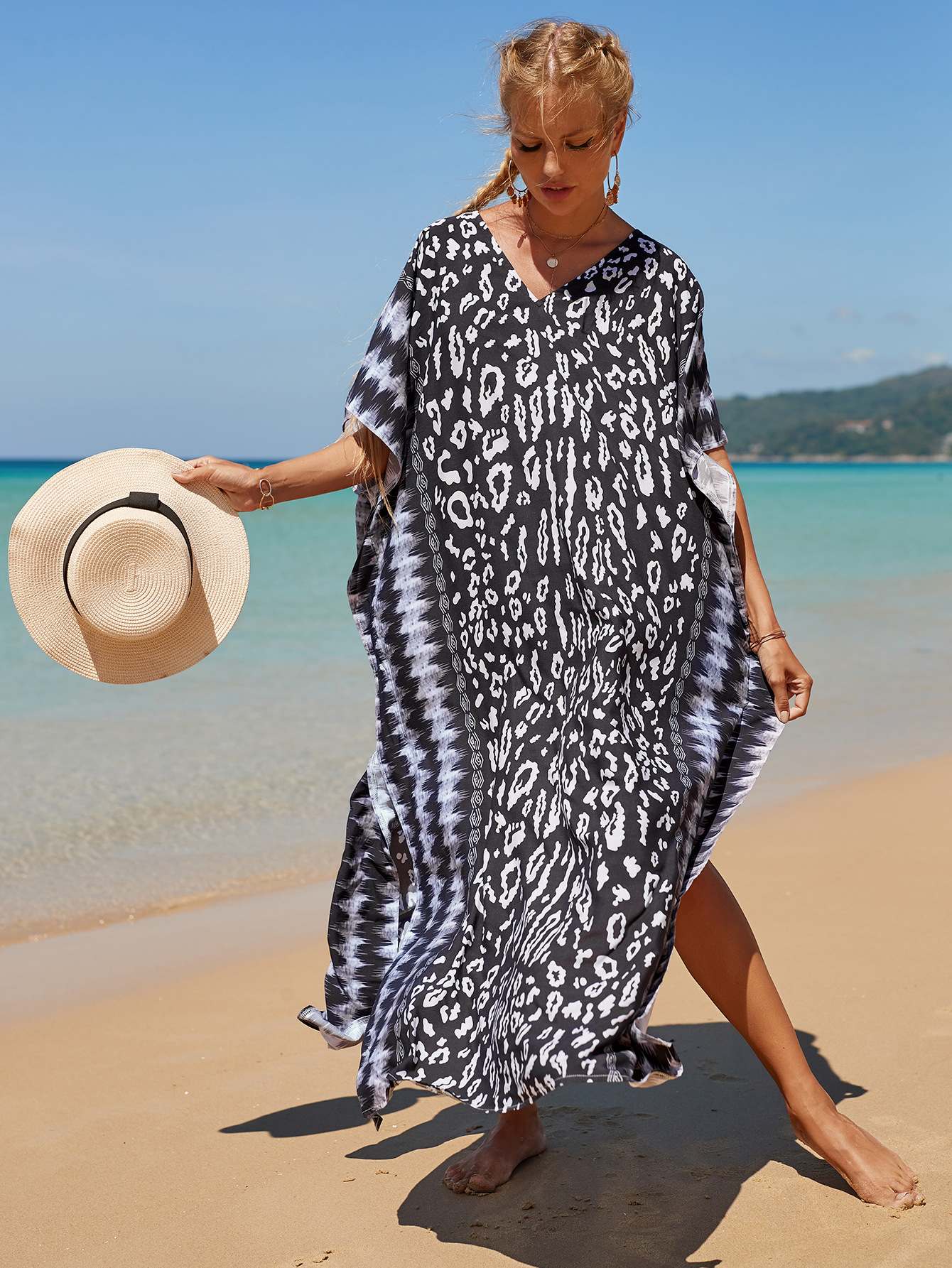 欧美新款人棉印花沙滩裙宽松长袍海边度假比基尼泳衣罩衫防晒衫女