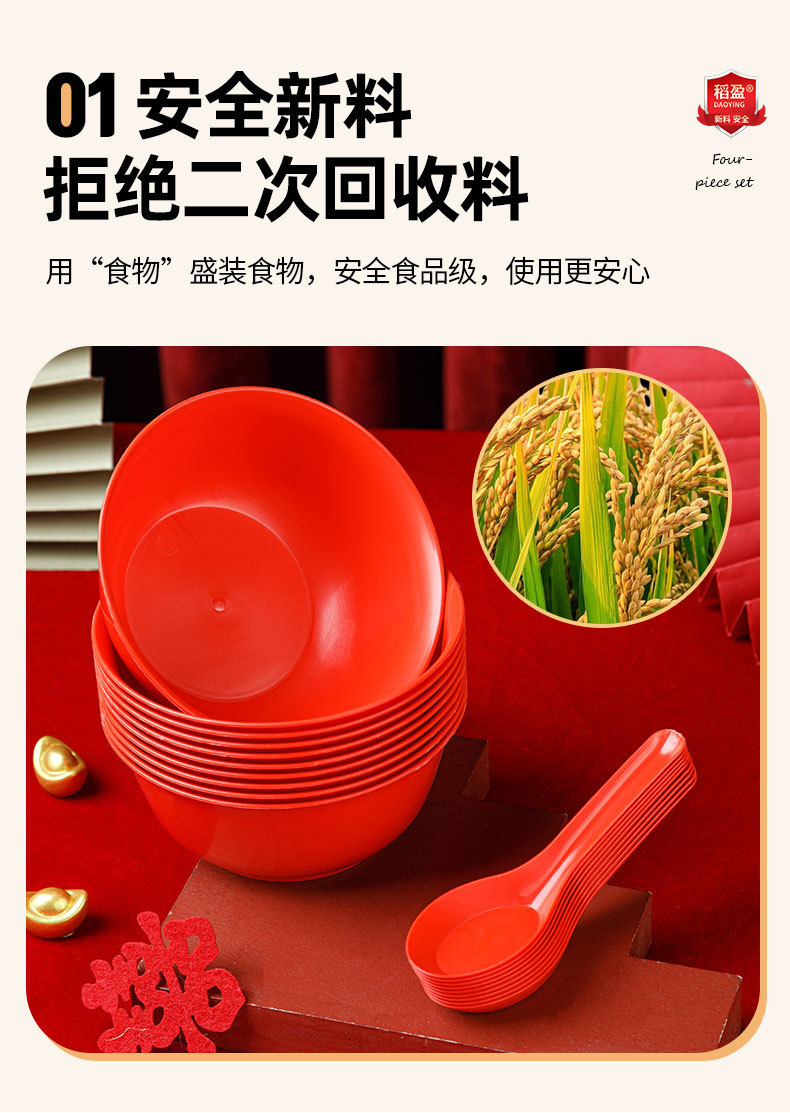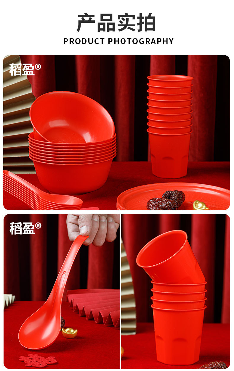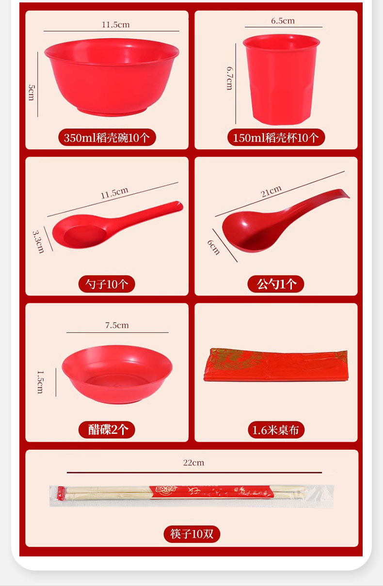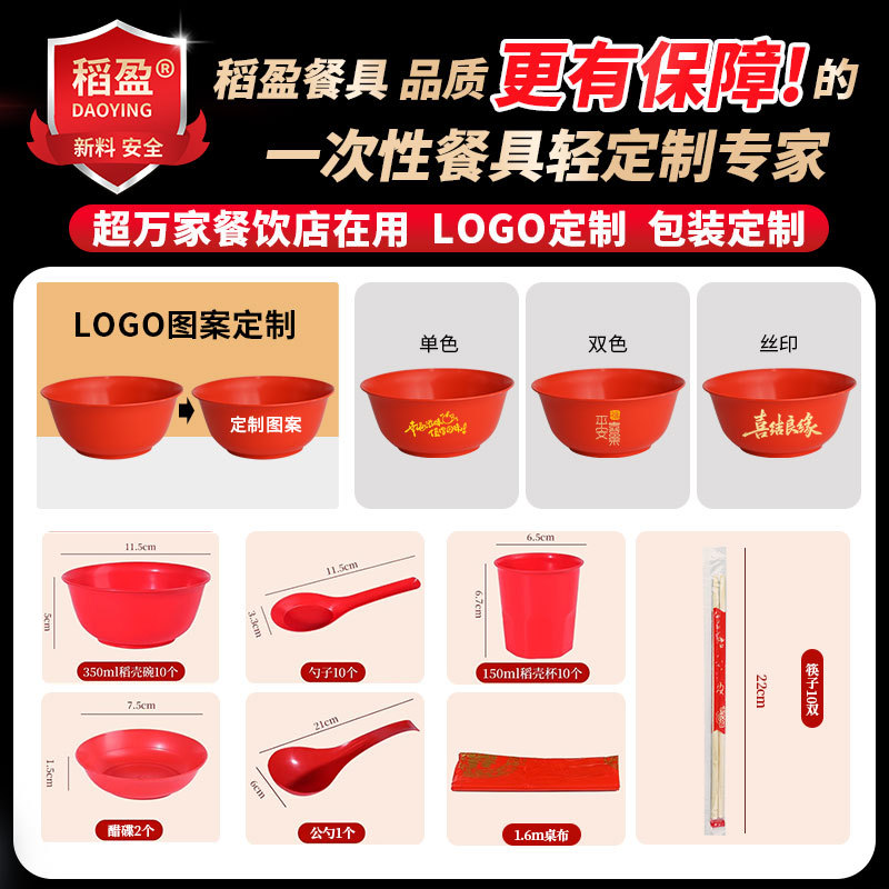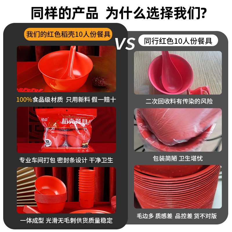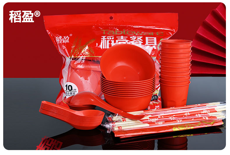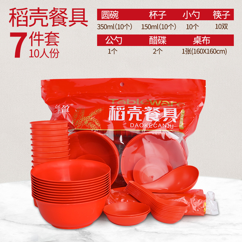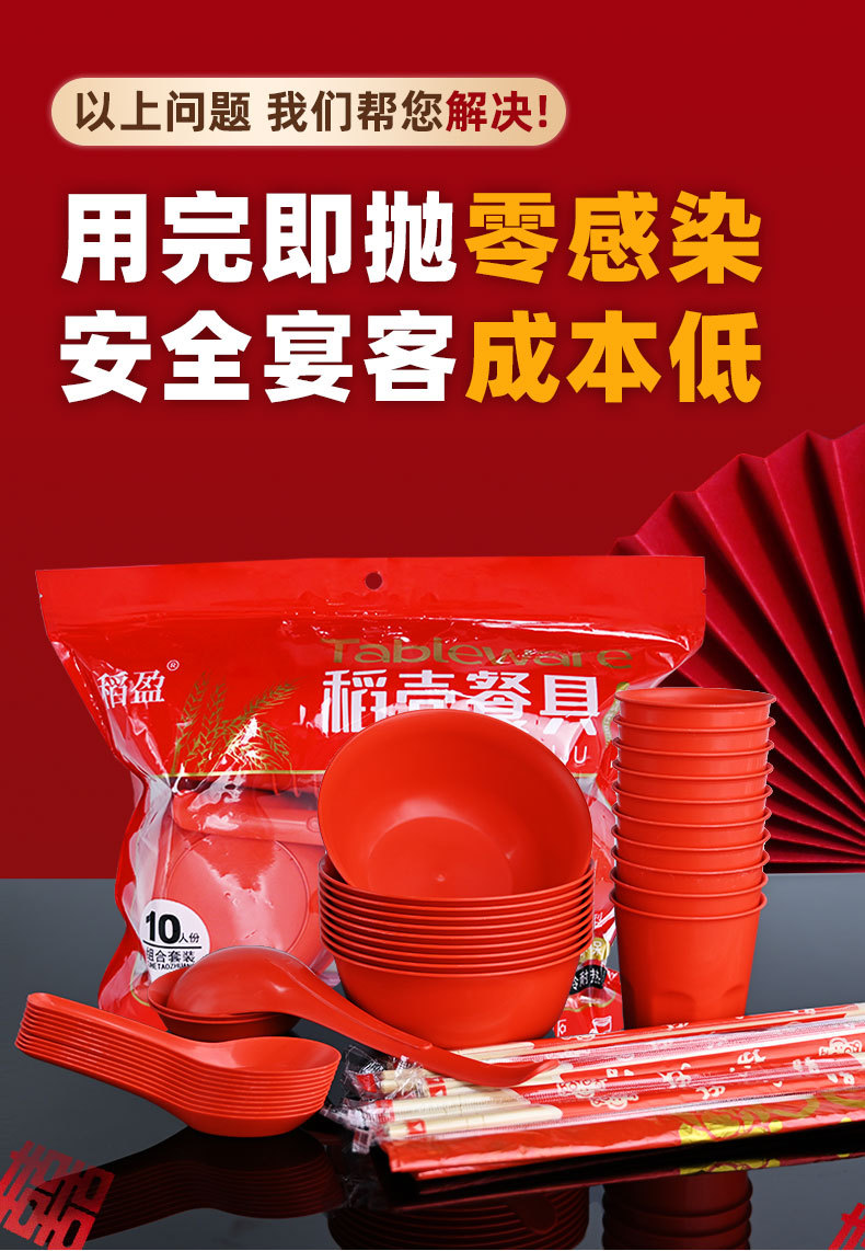 稻壳一次性餐具10人份结婚酒席碗筷套装食品级喜宴碗盘红色饭碗