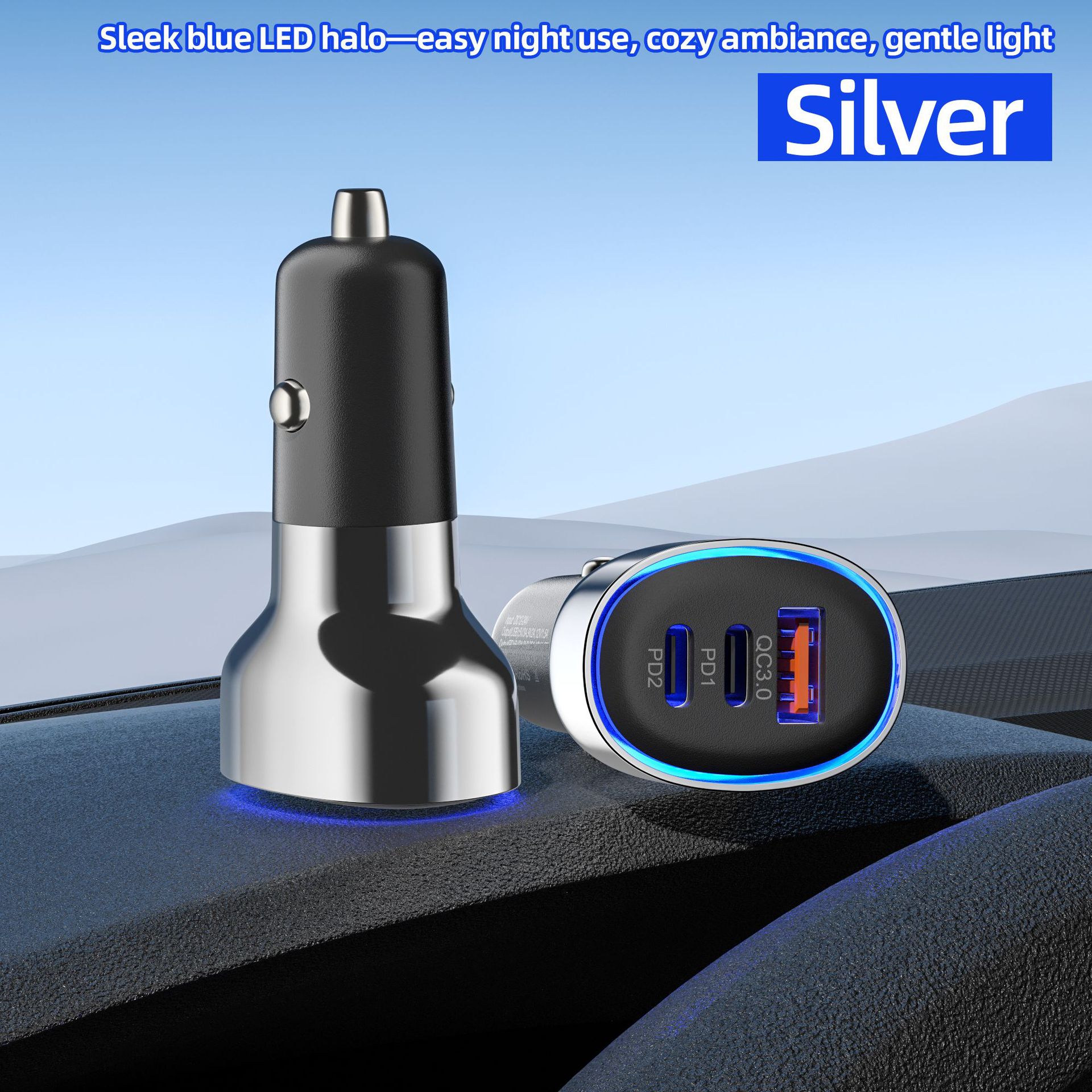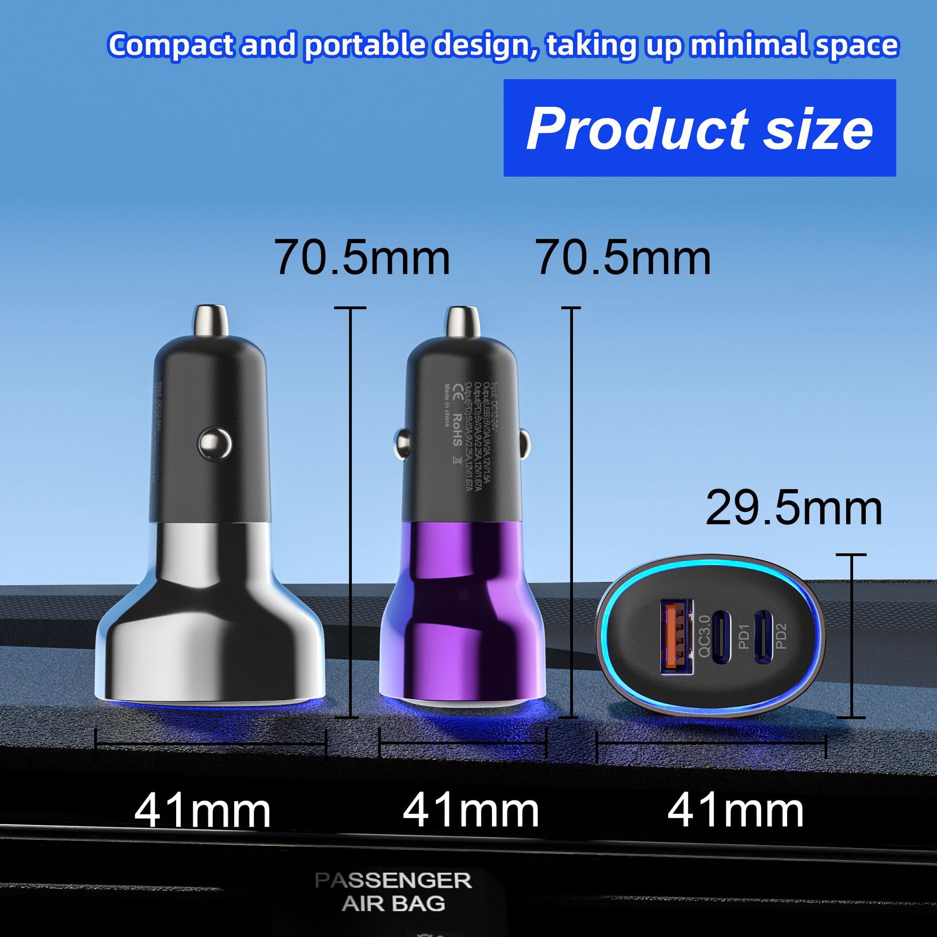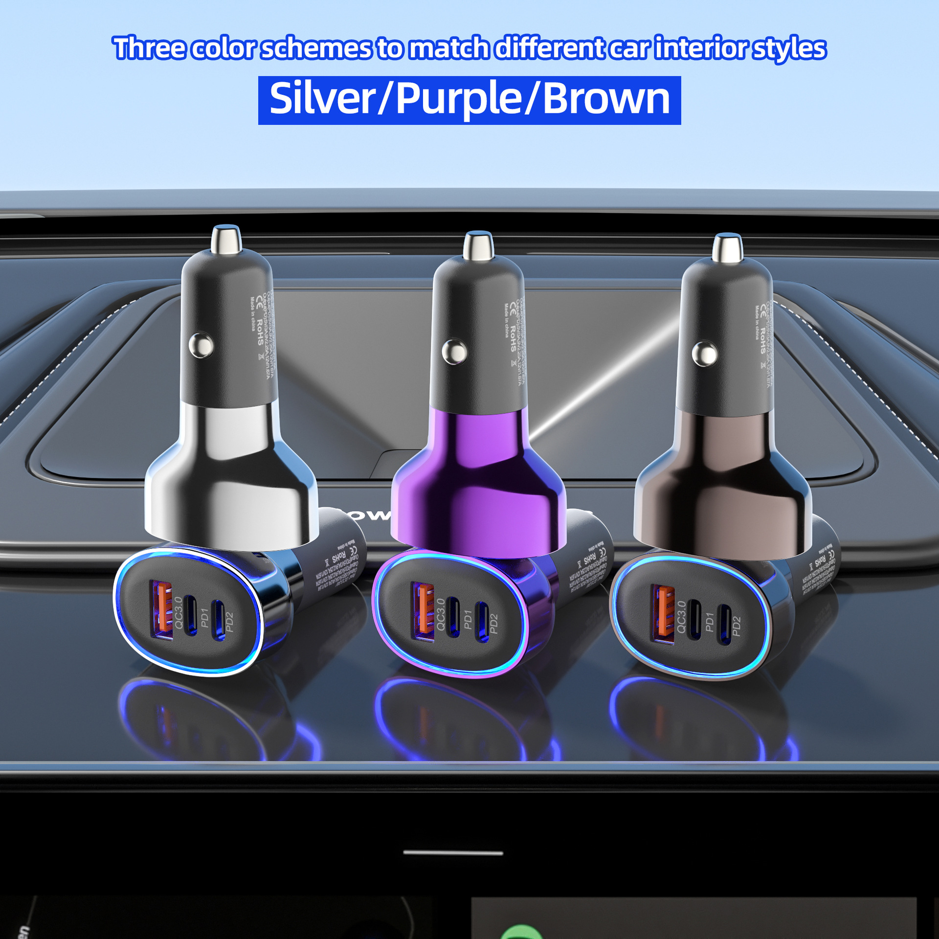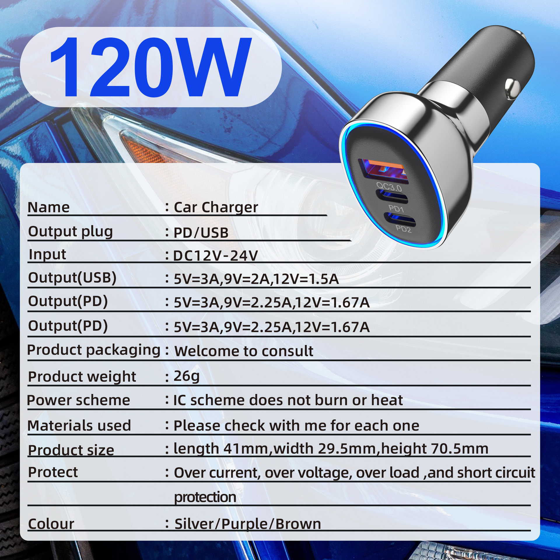 类型: 点烟器 充电类型: 快速充电 是否数显: 否 输出功率: 30 最大输出功率: 30 品牌: / 输出接口: TYPE-C 充电方式: 有线充电 加工定制: 是 货号: 新款ACC电镀蓝光车充 重量: 0.05 kg/个