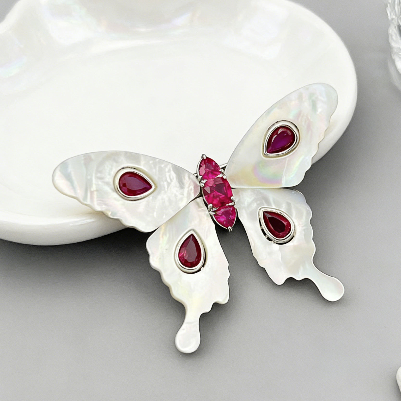 原创设计高级感天然贝母蝴蝶胸针铜合金镶锆红刚玉灵动衣饰女别针