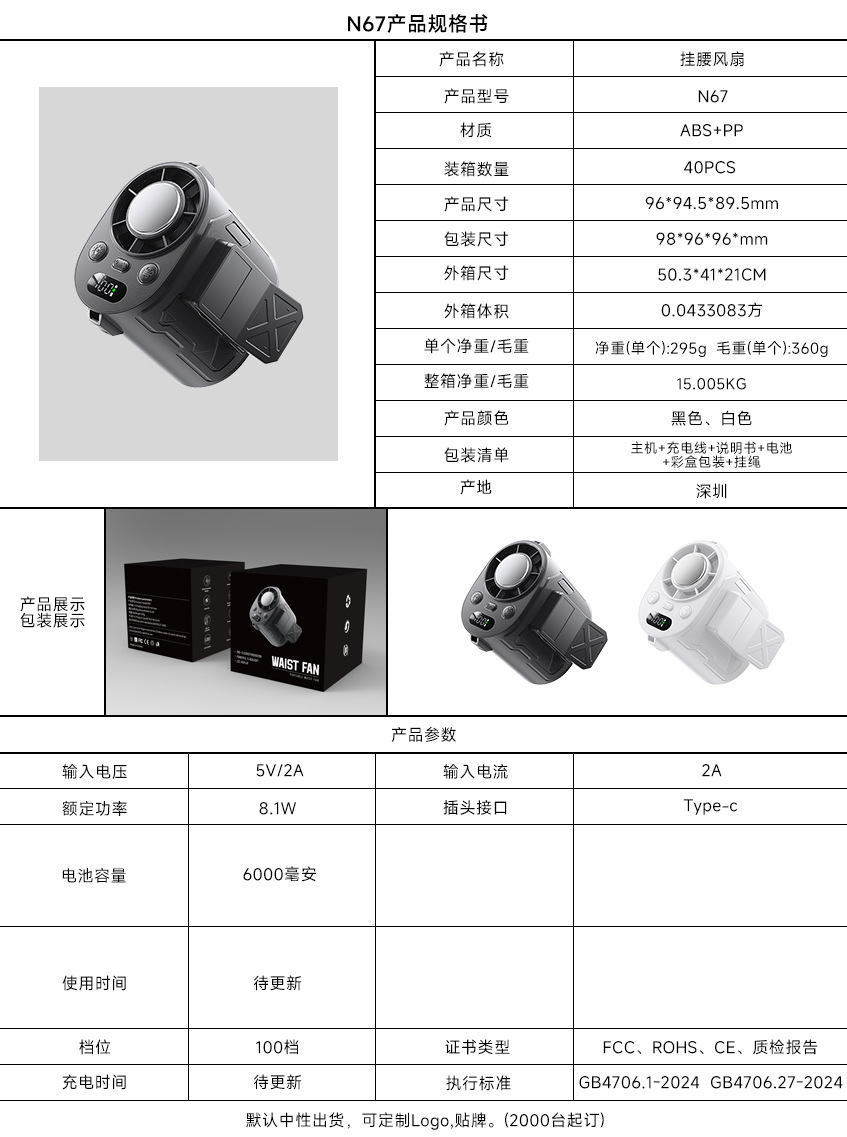 电源方式: USB 风扇分类: 挂腰风扇 续航时长: 8-12h(含) 风速档位: 无极调速 噪音: 36dB(A)-45dB(A)(含) 附加功能: 挂脖 规格: 5 额定电压: 3.7 额定功率: 8.1 品牌: 其他 适用面积: 5 操作方式: 普通按钮 是否支持充电: 支持 包装体积: 98*96*96*mm 颜色: 黑色,白色 货号: 67 主要销售地区: 日韩,韩国,日本,欧洲,南美,北美,欧美 有可授权的自有品牌: 否 是否跨境出口专供货源: 是 是否内置电池: 内置电池 重量: 0.274 kg/个