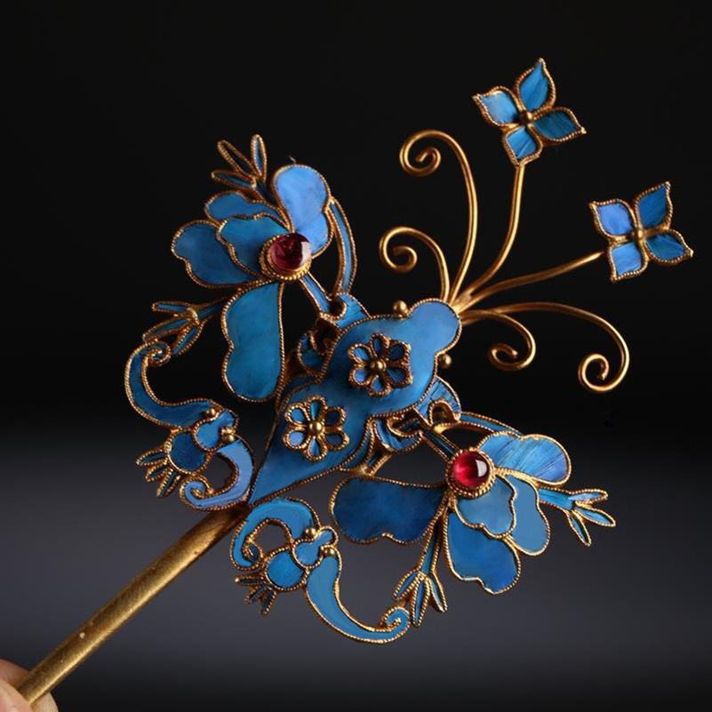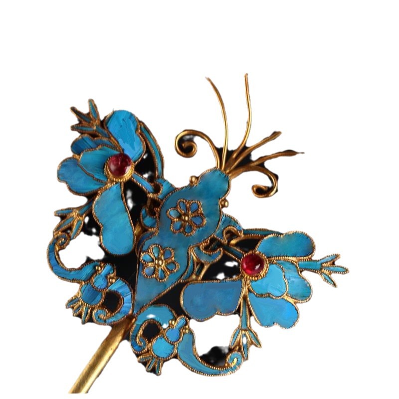 景泰蓝点翠蝴蝶发饰发簪银鎏金发钗复古风头饰中式新娘女簪子