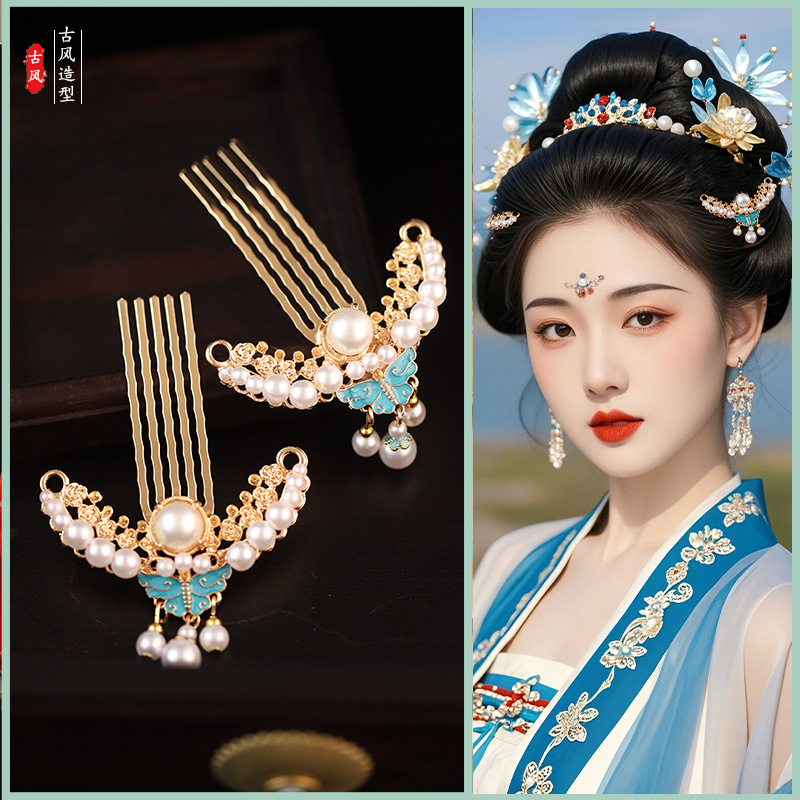 古风国风汉服旗袍明制发梳珍珠发钗简约气质步摇掩鬓发饰头饰