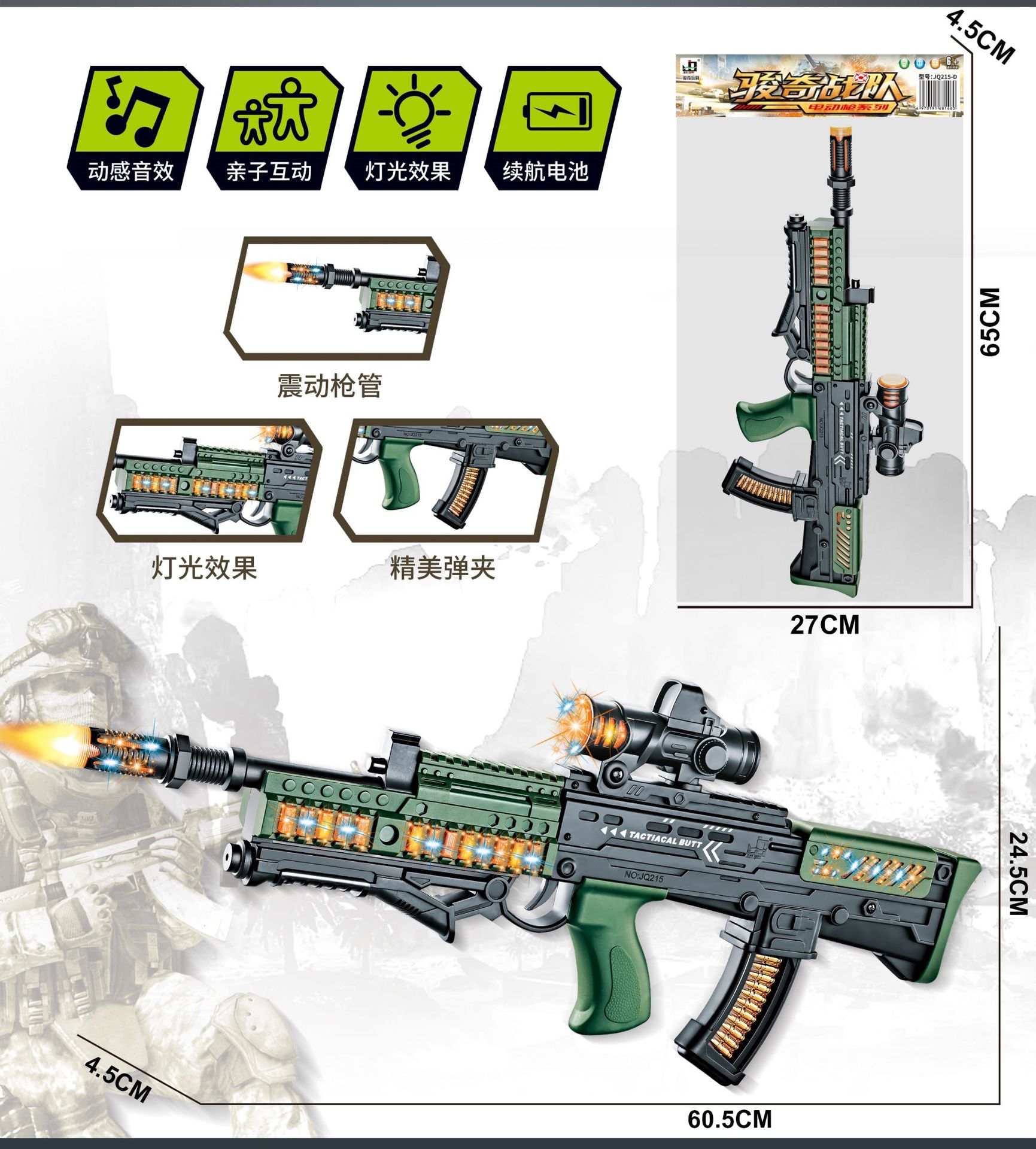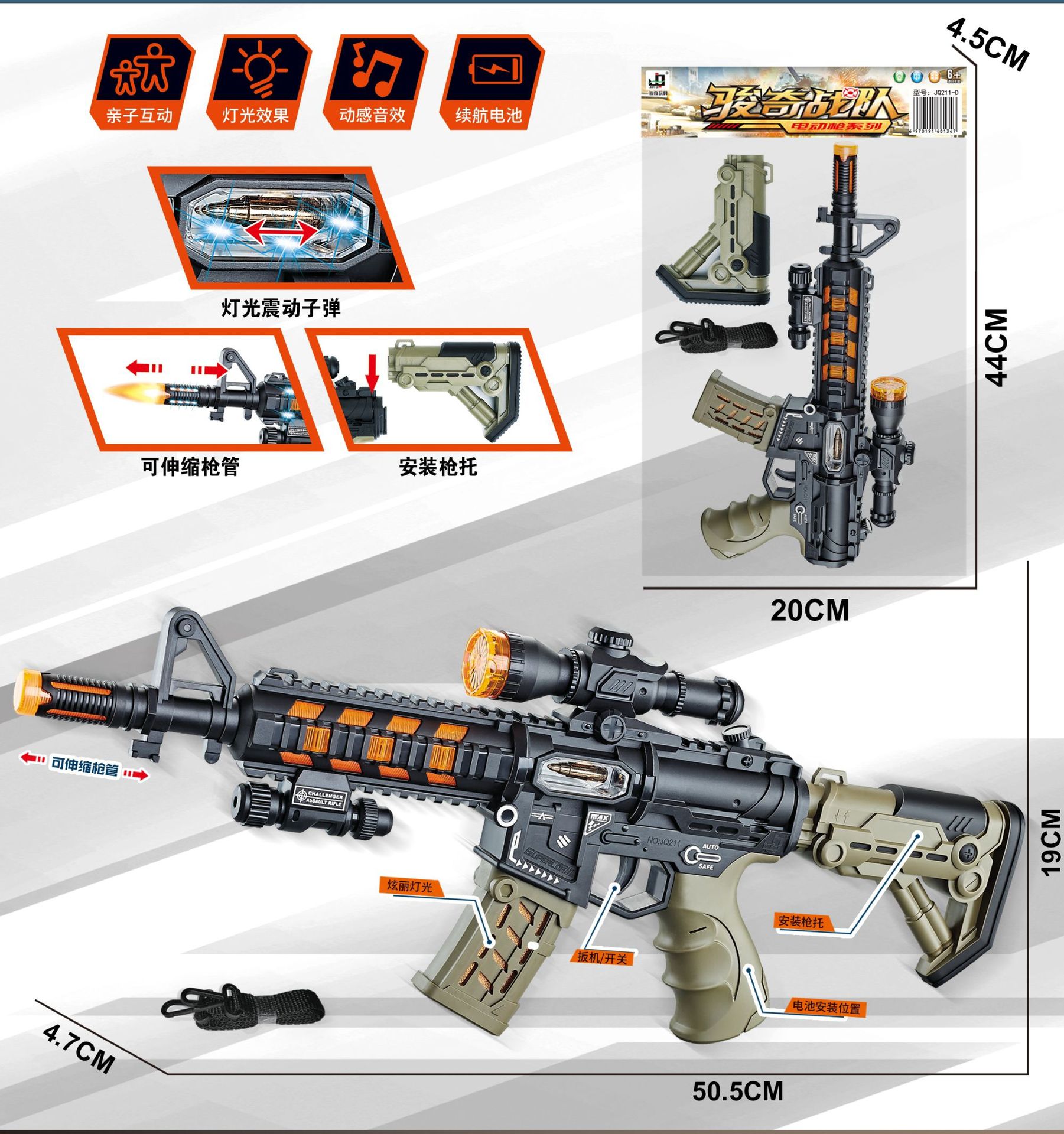 玩具材质: 塑胶 品牌: 其他 遥控方式: 声控 特色功能: 红外线 适用人群: 不限,女孩,男孩 适用年龄: 儿童(4-6岁) 原产地: 广东汕头 是否进口: 国产 包装: OPP袋 能力培养: 抓握,互动玩具,听觉,兴趣培养 是否有动漫形象: 否 货号: 215-D/211-D 是否有导购视频: 是 是否专供外贸: 否 3C配置类别: 14岁以下的塑胶玩具 商品3C认证码: 2018152202022368 颜色: 电动声光突击步枪-伸缩,M416突击冲锋 是否跨境出口专供货源: 否 规格: 标配(不含电池)),配普通电池三粒,配充