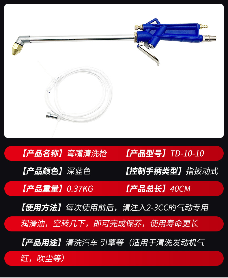 品牌: TN 是否跨境出口专供货源: 否 货号: 弯嘴清洗枪 适用范围: 汽车工业 系列: TD-10-10 产地: 浙江永康 是否进口: 否 用途: 清洗汽车 引擎等 订货号: 弯嘴清洗枪 胶管管长: 1m 重量: 0.05 kg/个