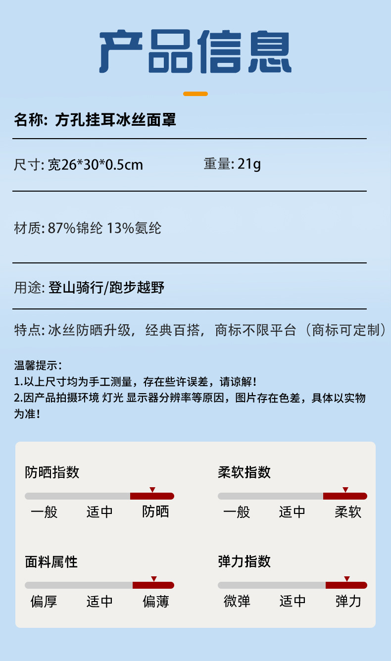 功能: 防紫外线,超轻,防风,遮阳,防尘,防虫 面料名称: 87%锦纶 13%氨纶 款式: 半遮面 品牌: 其他 货号: 方孔挂耳冰丝面罩 产地: 浙江 风格: 百搭,极简,休闲风,运动风,时尚OL,简 主要下游平台: ebay,PDD,亚马逊,wish,快手 主要销售地区: 南美,东南亚,北美,东北亚,中东 有可授权的自有品牌: 否 是否跨境出口专供货源: 是 颜色: 灰色,黑色,粉红色,藏青色,白色,宝蓝色 上市年份/季节: 2025年春季 风格分类: 时尚通勤 流行元素分类: 无 重量: 0.001 kg/条