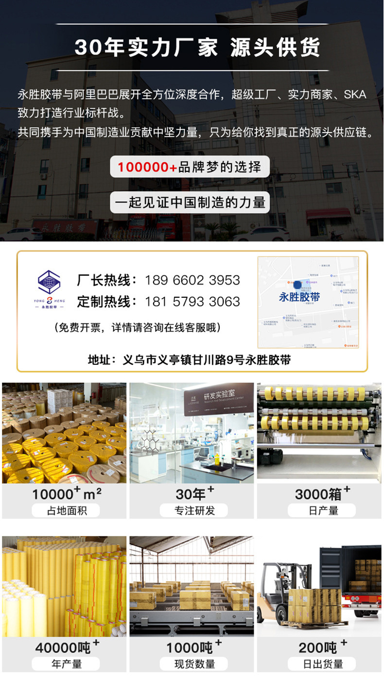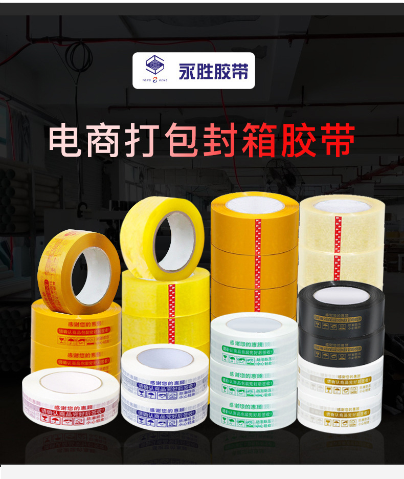 品牌: 永胜 主要下游平台: ebay 主要销售地区: 非洲 宽度: 42-60 是否跨境出口专供货源: 是 货号: ys025 原产国/地区: 中国 膜厚: 52u 胶系: 丁酯压敏胶 适用范围: 封箱打包 使用注意事项: 防火 纯肉厚: 1-3 特点: 其他 短期耐温性: 优 长期耐温性: 优 耐温性: 优 有可授权的自有品牌: 是 基材: BOPP薄膜 长度: 90-200 撕断方式: 借助切割工具 重量: 0.425 kg/卷