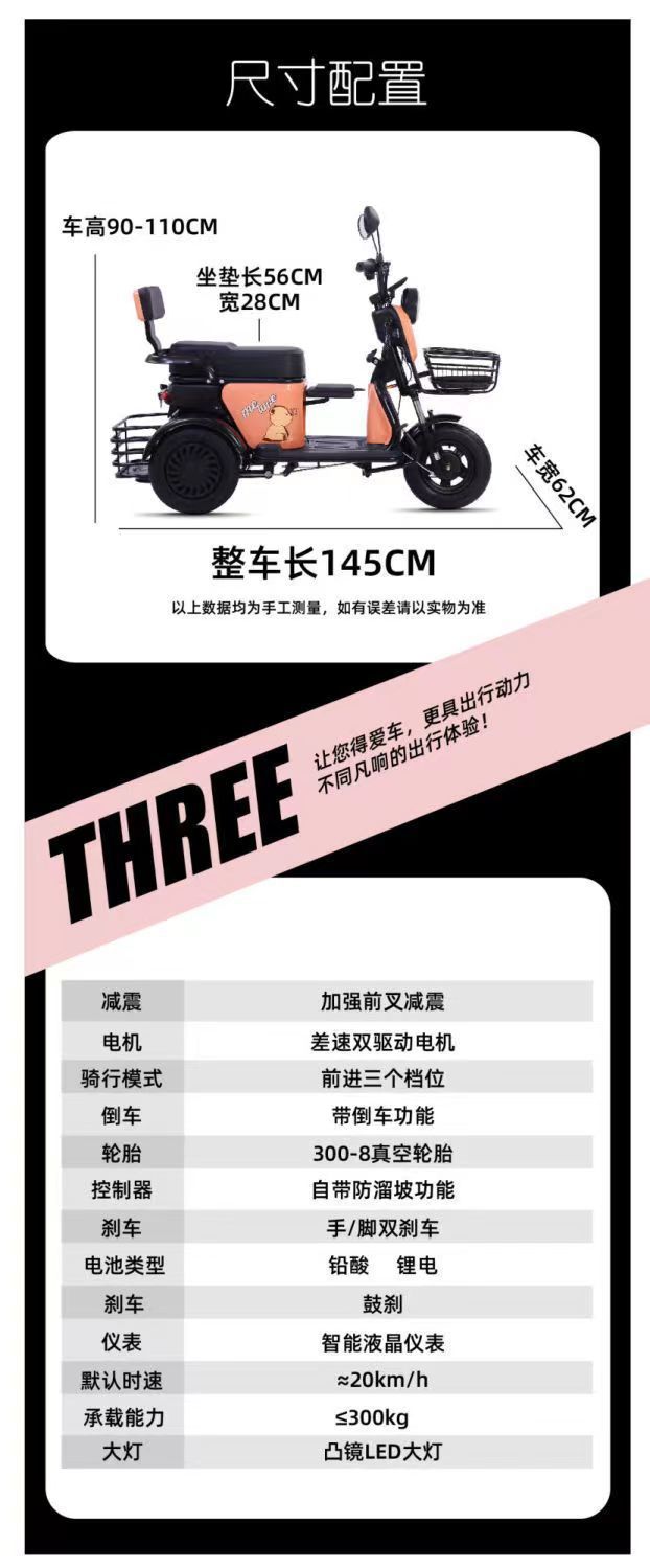 加工定制: 是 品牌: 优源 型号: 炫酷 电机类型: 差速电机 电机功率: 600W 电池容量: 48V 最高设计车速: 20km/h以上 续行里程: 30KM 爬坡能力: 强 装载重量: 300KG 整车重量: 70KG 车箱尺寸: 150×75×100 整车尺寸: 150×75×100 颜色: 红/白/橙/粉 货号: 炫酷 规格: 整车 最高设计车速是否高于20km/h: 是 3C证书编号: 2024091119002666 重量: 0.194 kg/辆