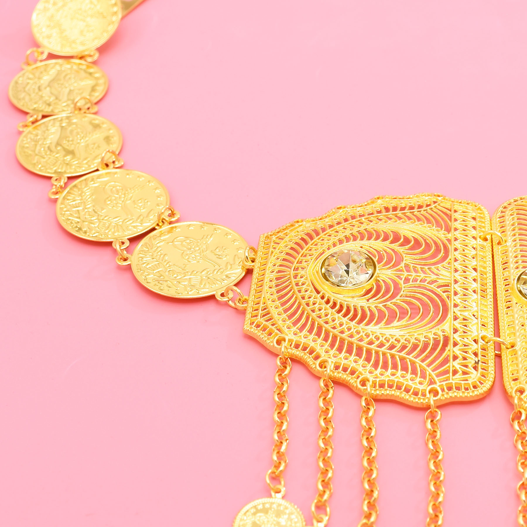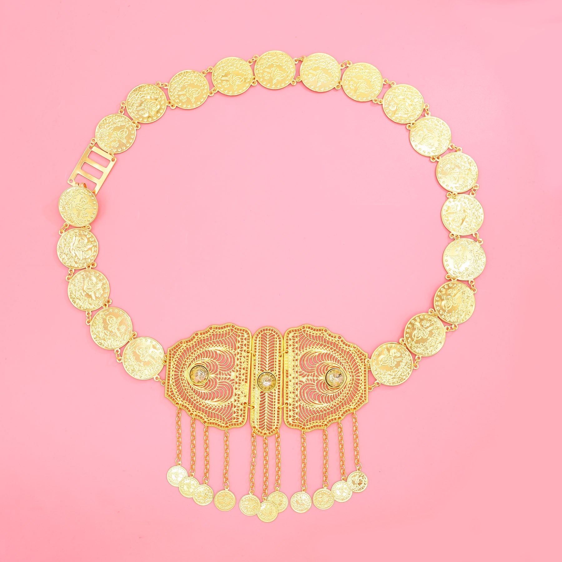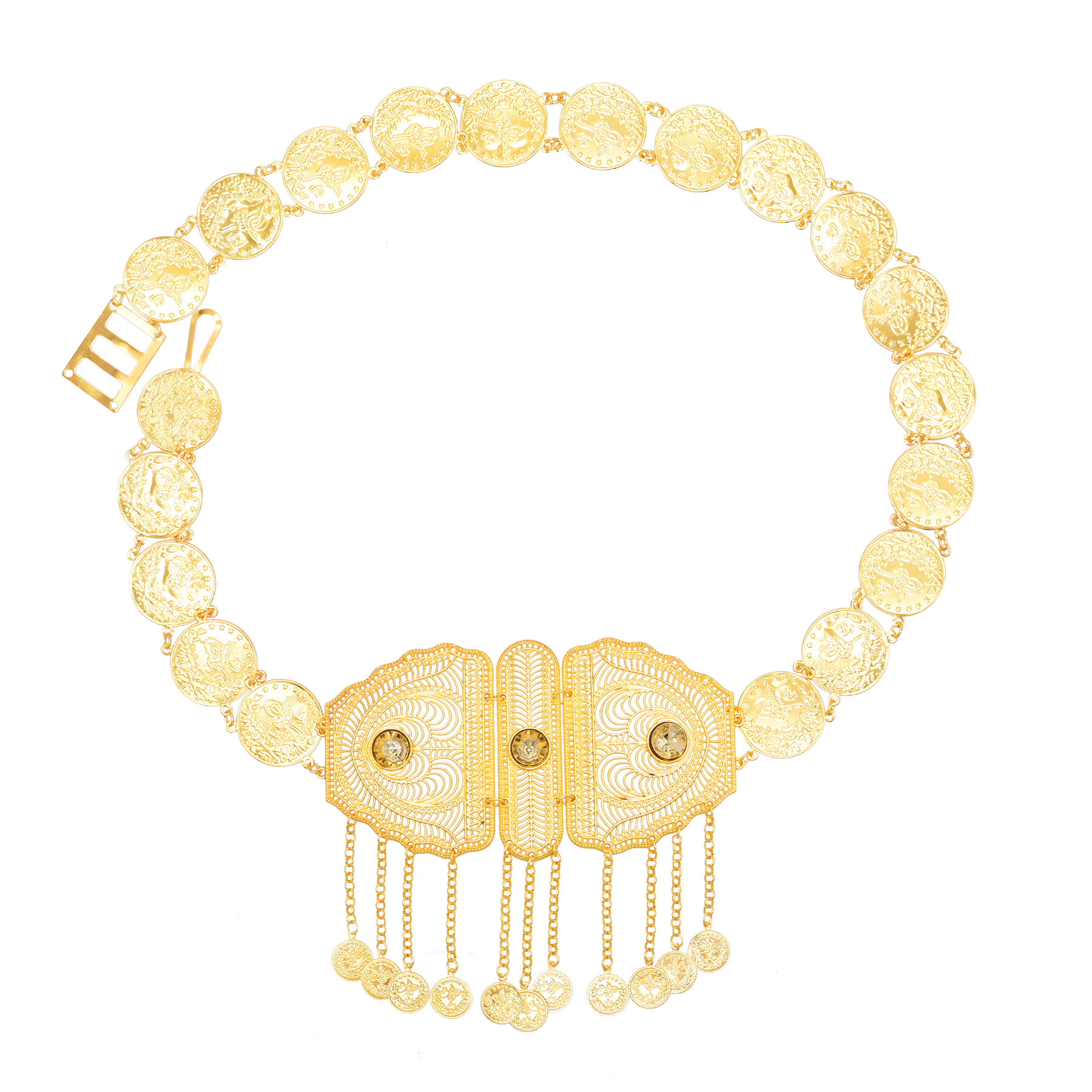 跨境中东新款腰部饰品时尚金色合金镂空雕花钱币流苏腰链服装配饰