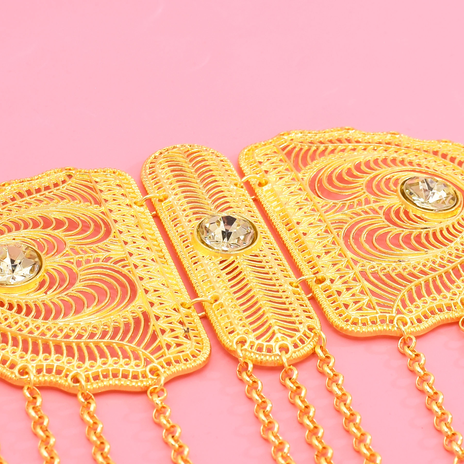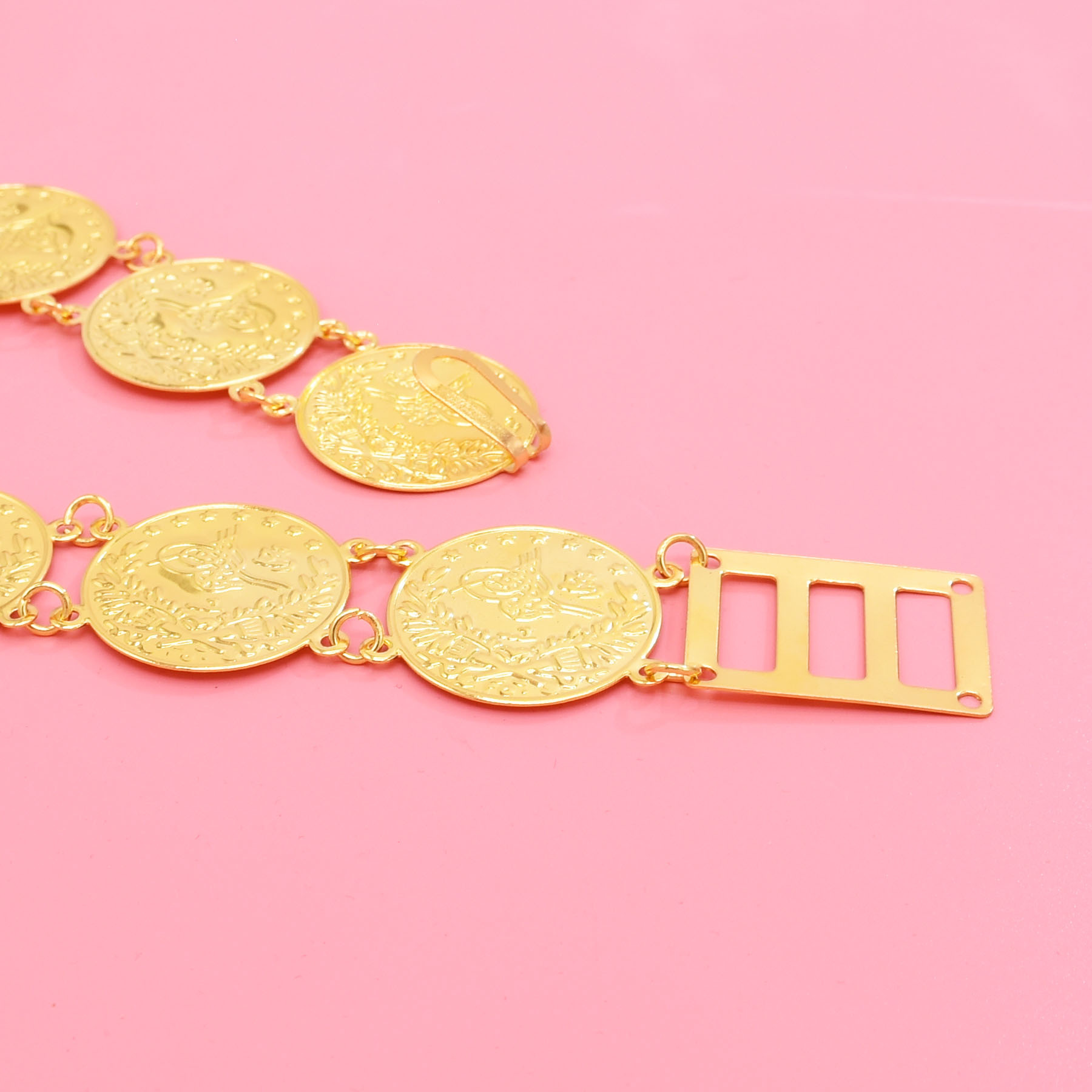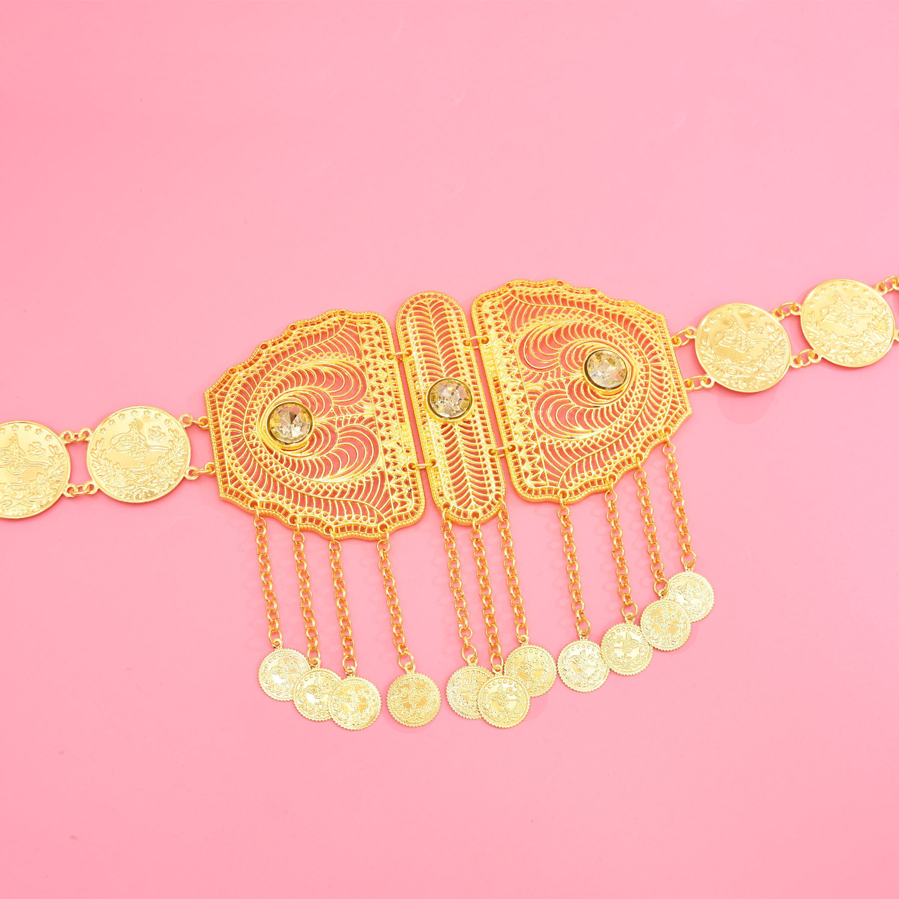 跨境中东新款腰部饰品时尚金色合金镂空雕花钱币流苏腰链服装配饰