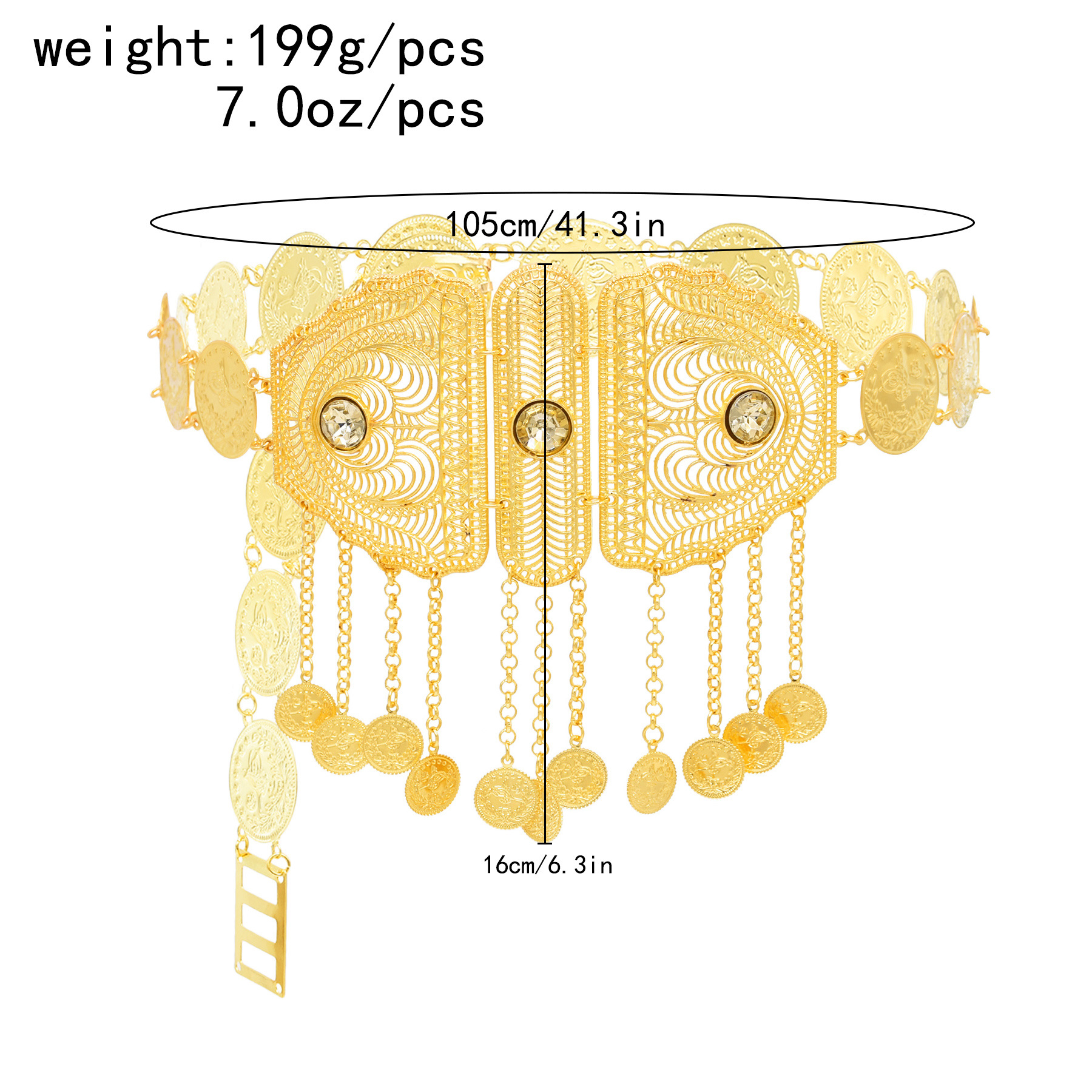 跨境中东新款腰部饰品时尚金色合金镂空雕花钱币流苏腰链服装配饰 投诉