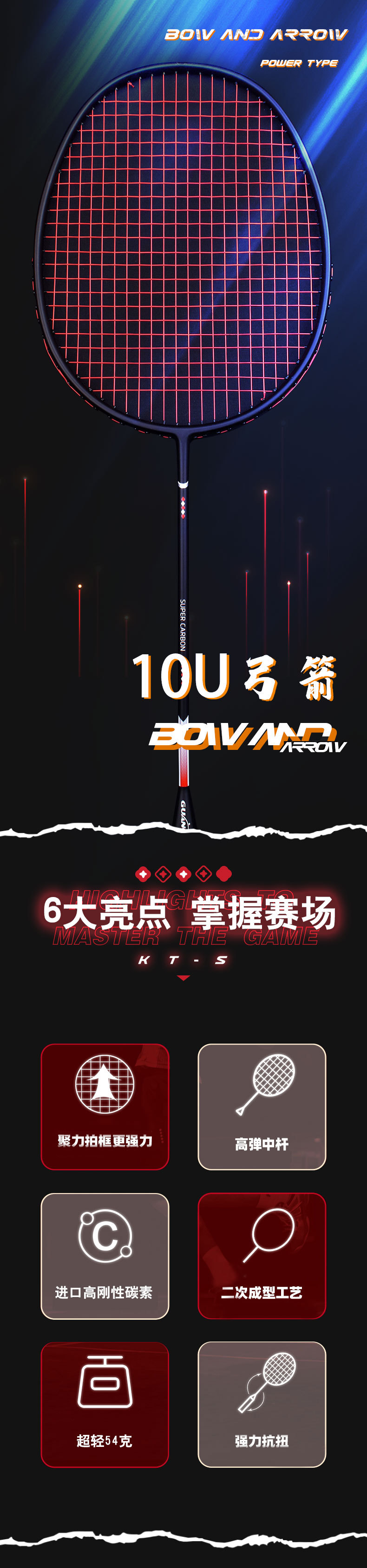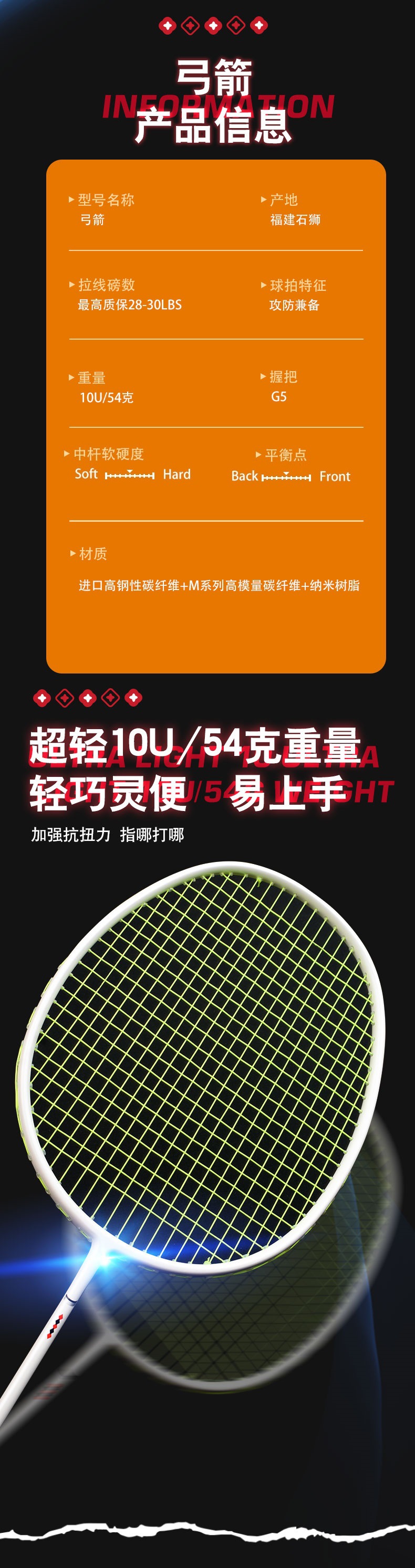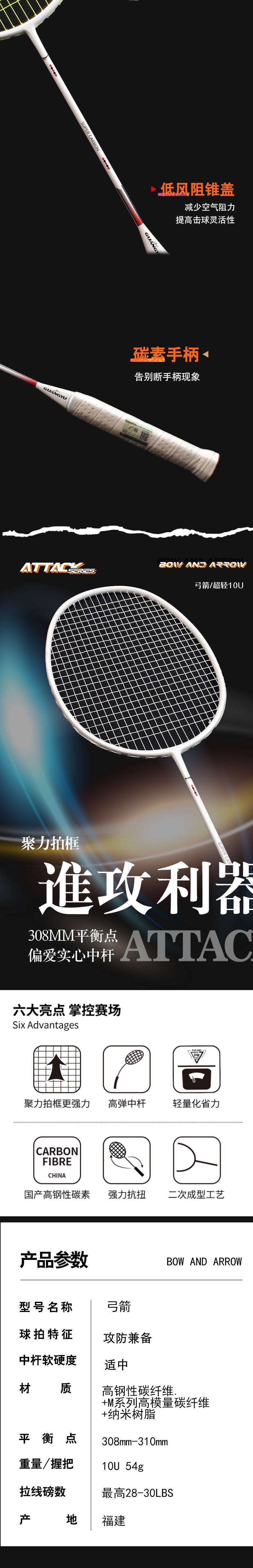超轻手感+快挥速两者的结合,从而缔造了广羽弓箭10U经典之作,简约而不简单。