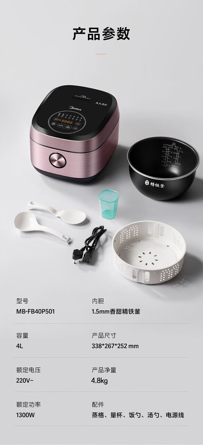 品牌: Midea/美的 内胆材质: 其它 容量: 5L 功能: 蛋糕,定时,煲仔饭,预约 加热方式: 底盘加热 操作方式: 触摸式 控制方式: 微电脑式 机身材质: 金属 型号: FB50P501/MB-FB40P501 货号: FB50P501/MB-FB40P501 额定电压: 220 额定频率: 50 额定功率: 1300 3C证书编号: 2022010718450490 液晶显示: 有 智能类型: 不支持智能 产品尺寸: 338*267*252mm 功率: 1001W(含)-2000W(含) 上市时间: 2020-09-02 售后服务: 全国联保 重量: 0.227 kg/件