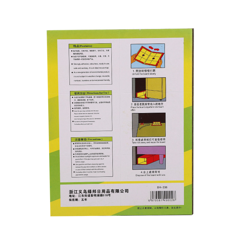 3、为防止粘捕到的老鼠挣扎拖动鼠板弄脏地面或墙面,可将粘鼠板固定到地面上或在其下面垫一张较大的纸张。