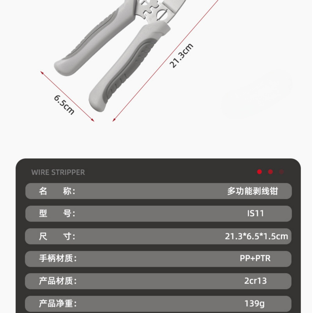 品牌: 璟威 规格: 尖嘴剥线钳 防滑手柄: 是 刃口材质: 铬钒钢Cr_V 形状: 直头 剥线范围: 多功能 重量: 0.154 3: 电线钳 1: 电工剪 2: 尖嘴钳 重量: 0.05 kg/把