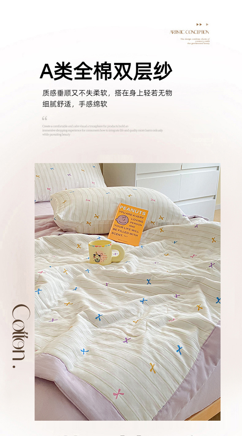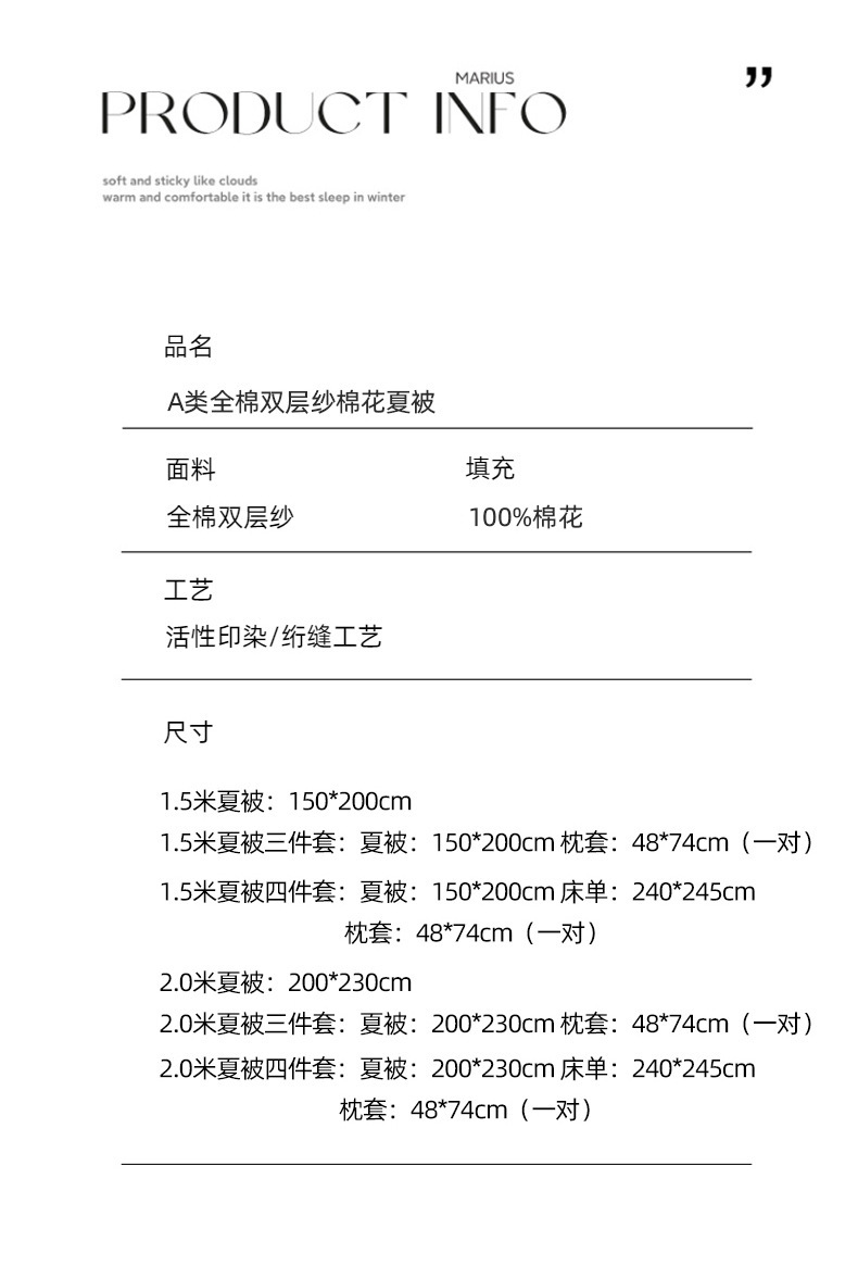 | 200*230cm夏被四件套:夏被200*230cm 床单240*245cm 枕 | ¥18400 | 100床可售 |