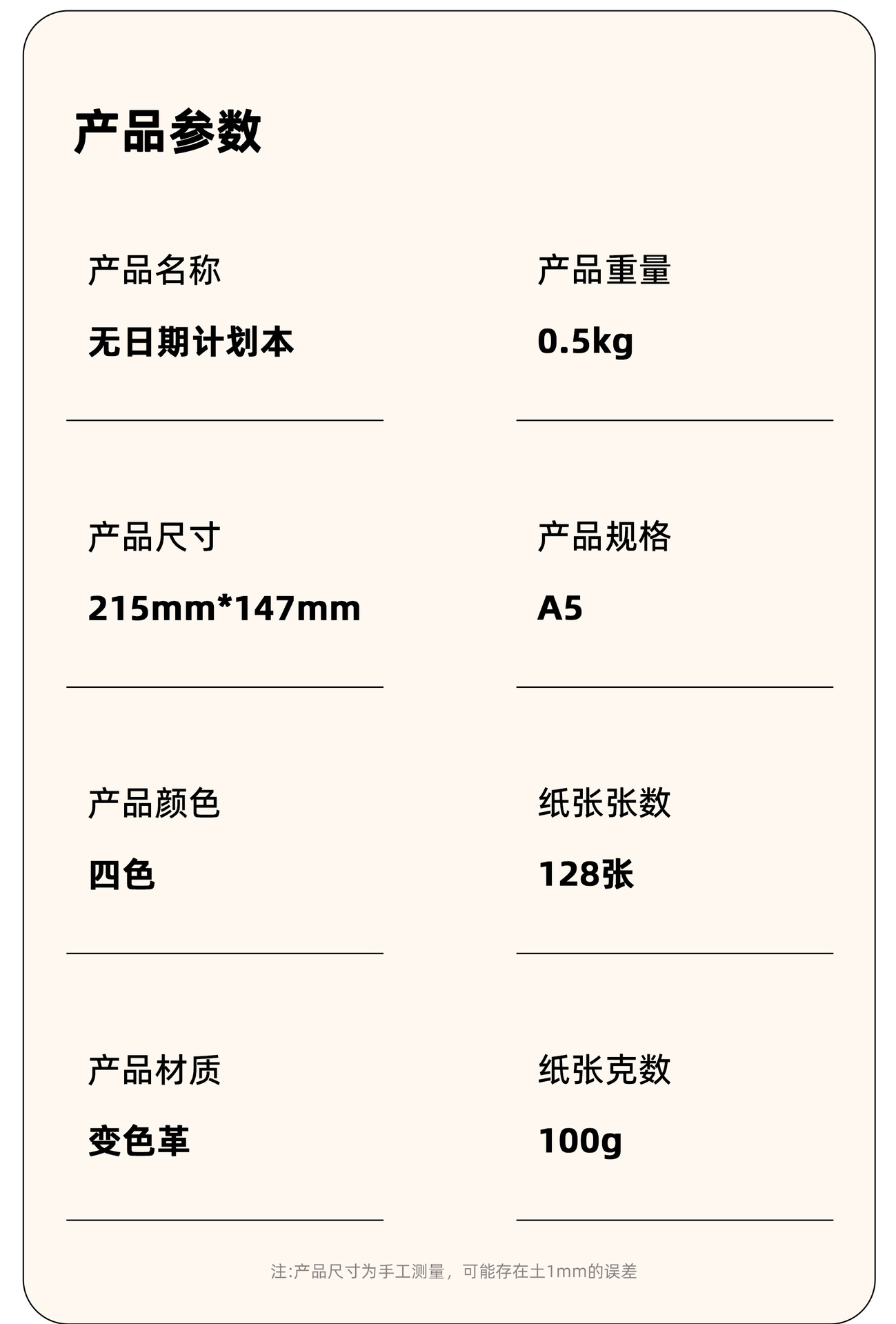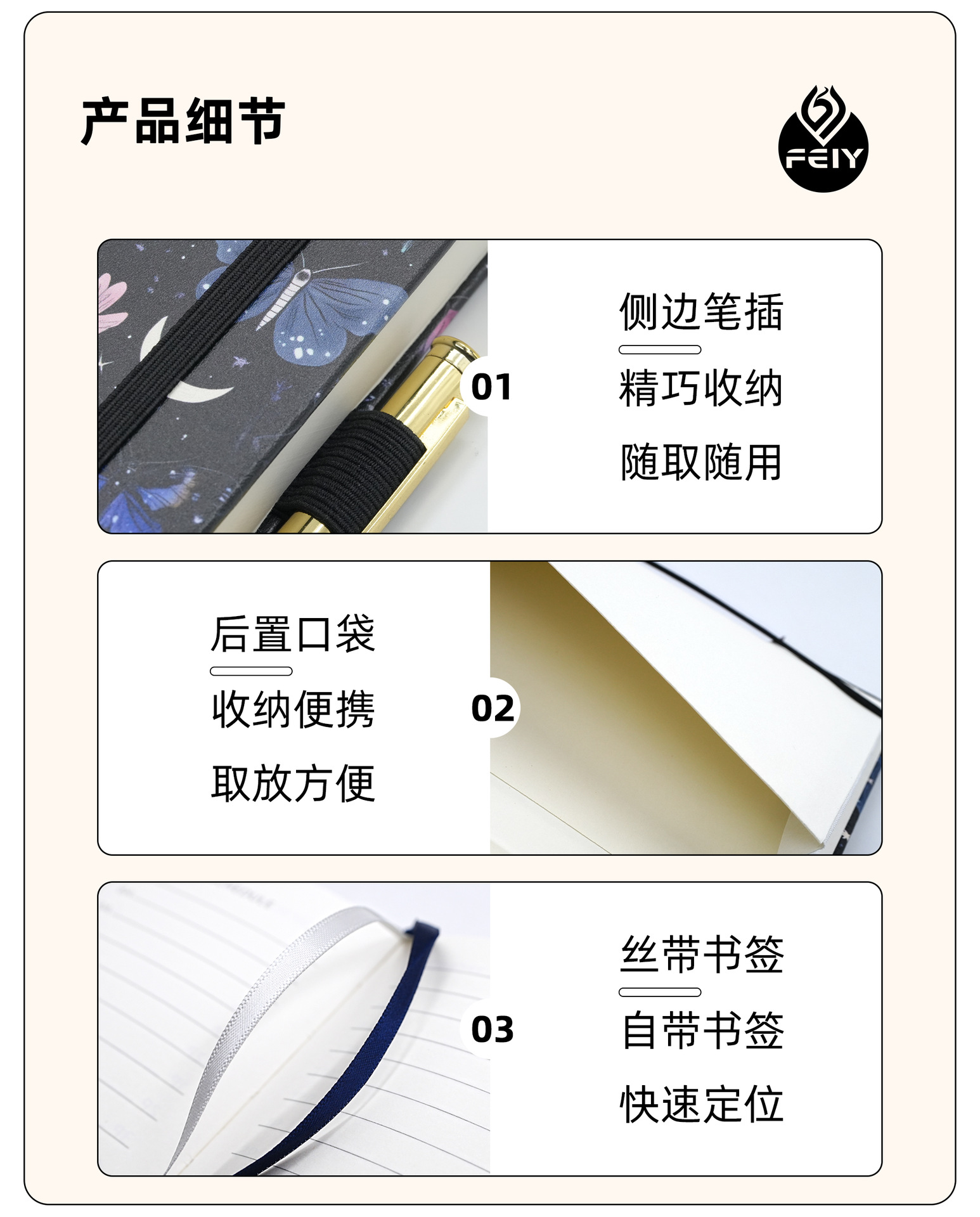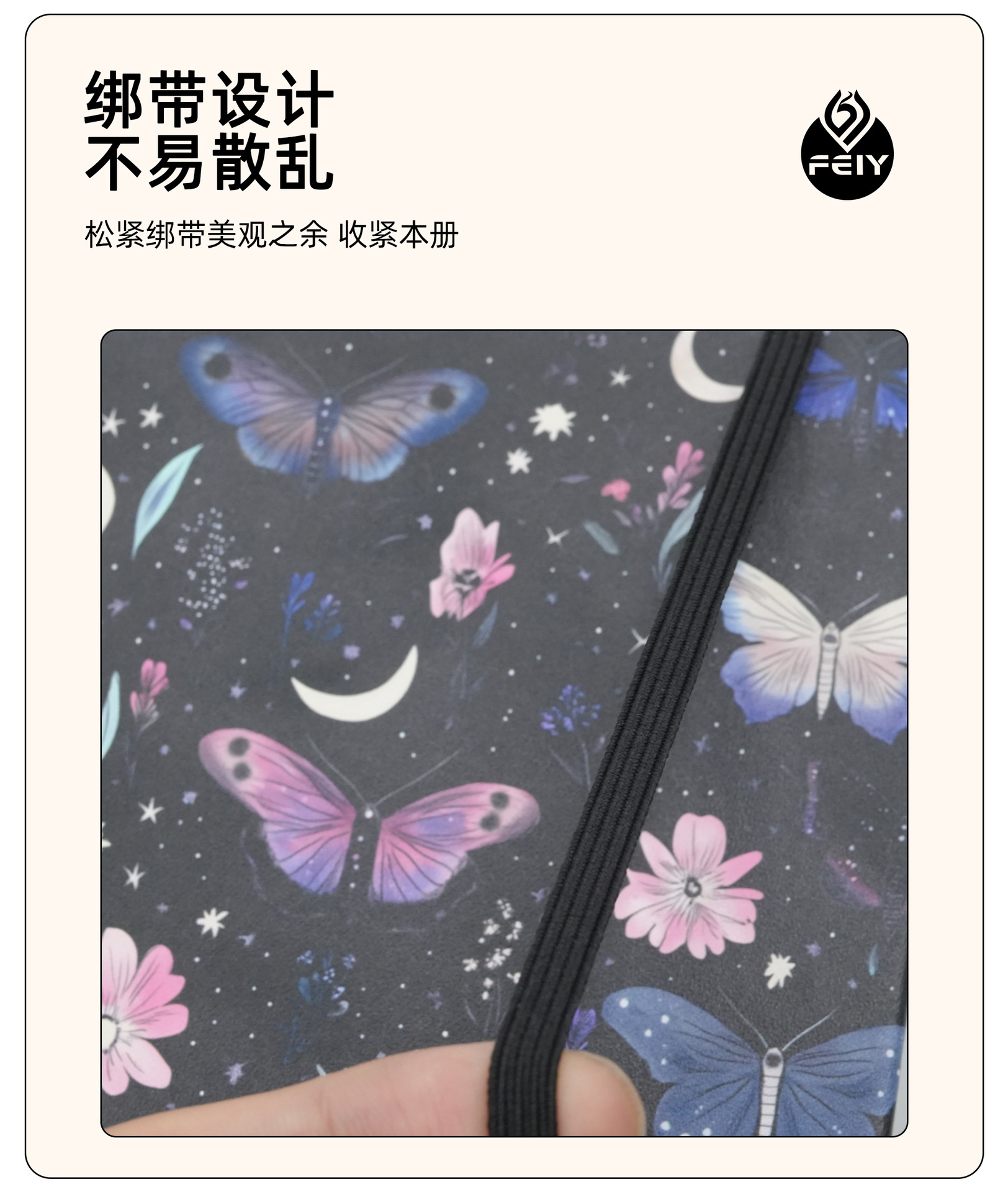 封面材质: 仿皮 品牌: 飞宇 产品类别: 笔记本 装订: 无线胶装 内文纸张克重: 100 内文纸张页数: 200页-300页(含) 内文材质: 本白纸 封面颜色: 春日花漾,星夜蝶语,月下蝶舞,蓝调花境 货号: / 规格: A5 重量: 0.426 kg/本