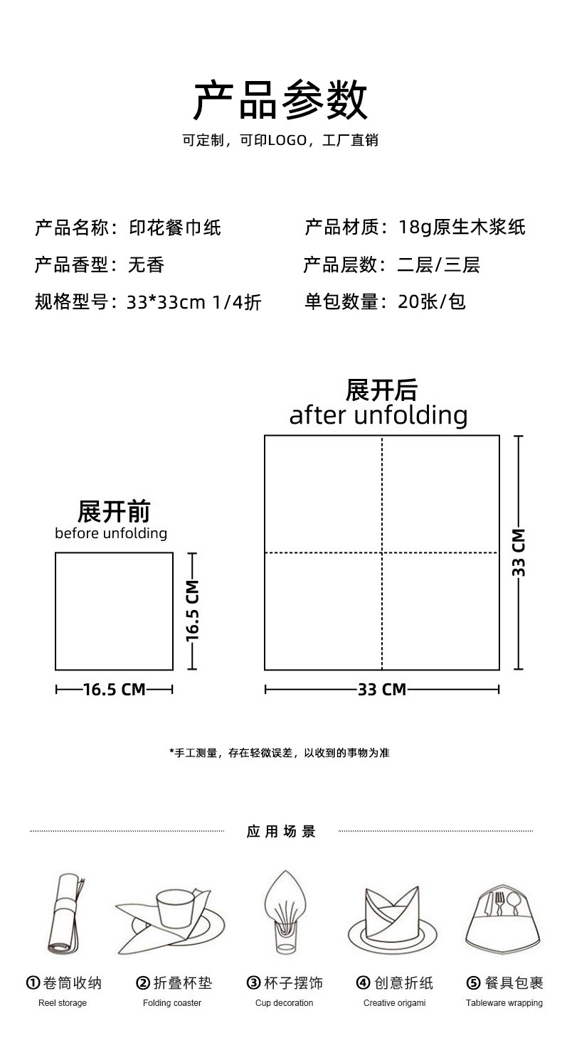 材质: 原生木浆 层数: 二层 品牌: 无 张数: 20 纸品等级: 优等品 包装规格: 16.5*16.5 克重: 80 是否进口: 否 型号: 330 产品规格: 33*33 加工定制: 是 保质期: 3年 加印LOGO: 可以 香型: 无香 货号: C02 是否跨境出口专供货源: 否 重量: 0.157 kg/包