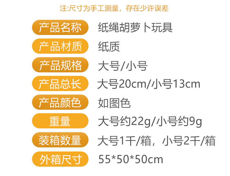 材质: 纸质 品牌: 漫上 产品类别: 啃咬玩具 箱装数量: 1000 产地: 浙江 是否进口: 否 货号: B008115 重量: 22g 是否专利货源: 否 颜色: 小号萝卜,大号萝卜 规格: 如图 有可授权的自有品牌: 是 是否跨境出口专供货源: 是 是否属于礼品: 否 是否IP授权: 否 重量: 0.254 kg/个