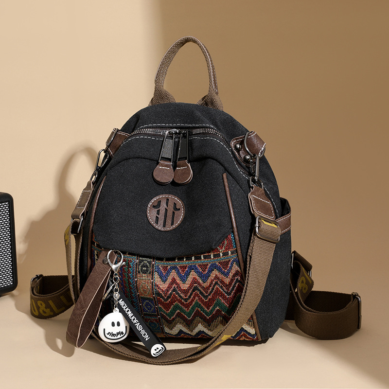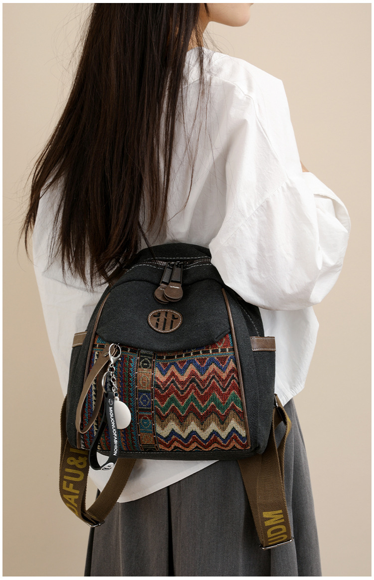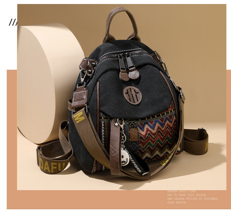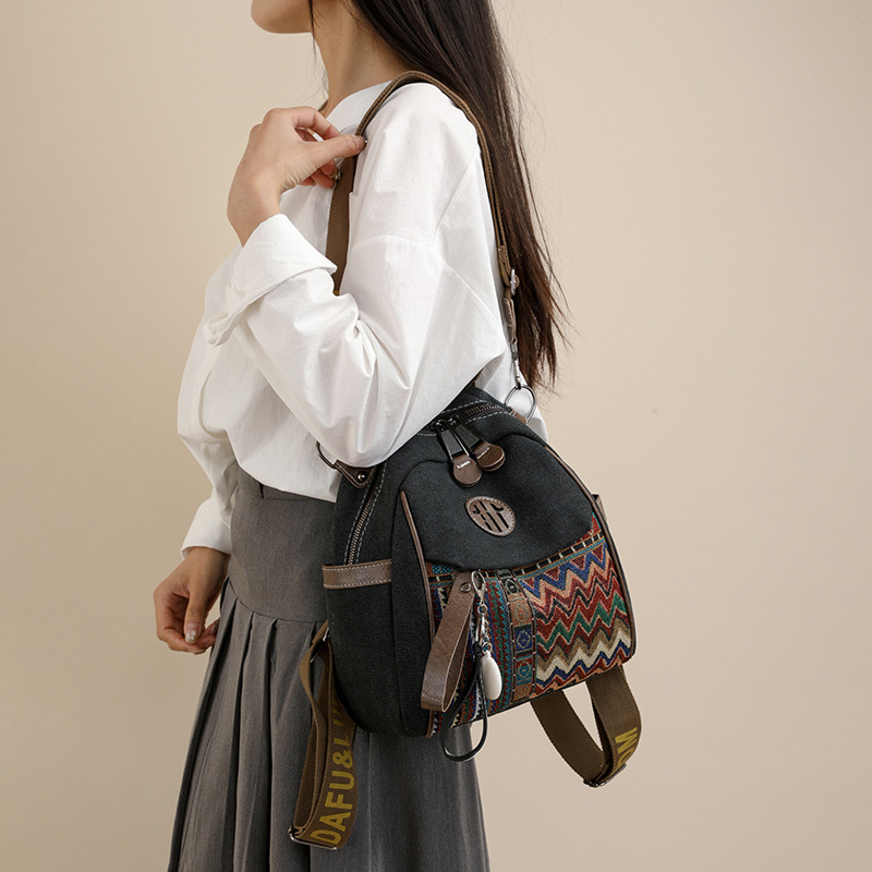 高级牛仔布民族风刺绣双肩包女2025新款撞色大容量背包多用斜挎包