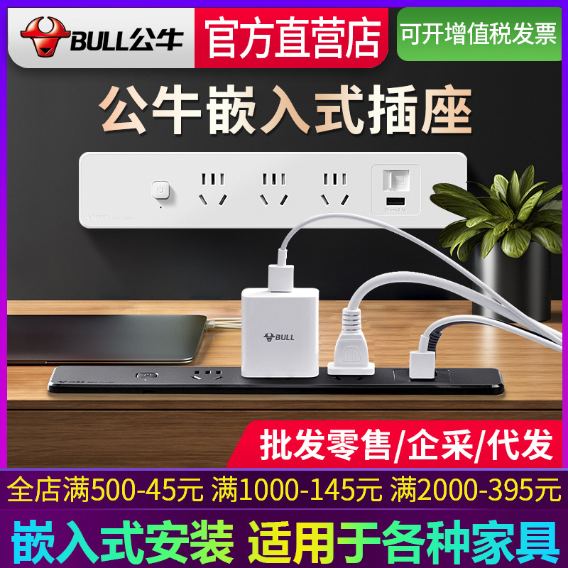 公牛桌面嵌入式插座办公会议桌usb插排超薄隐形餐边柜岛台插线板