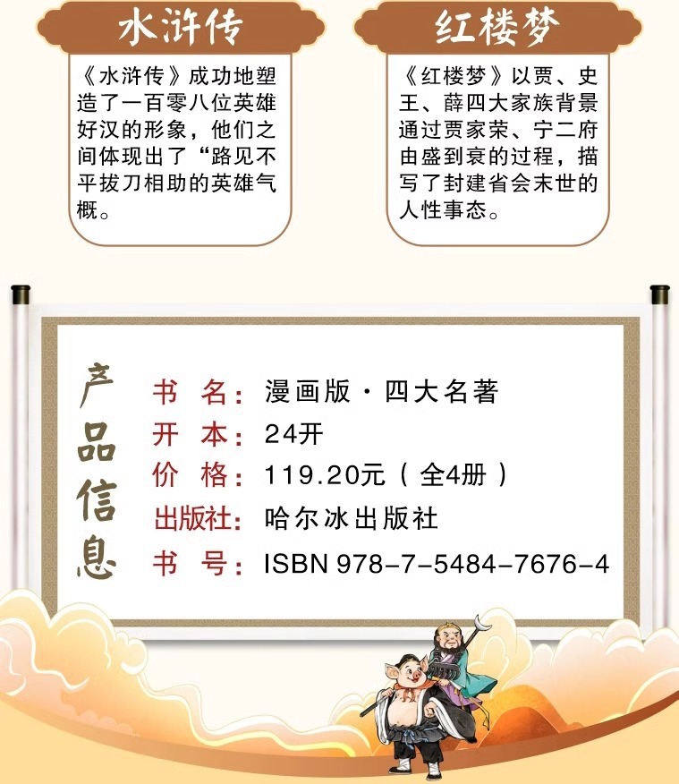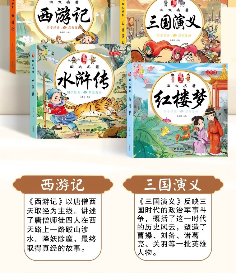 品牌: 其他 出版社: 哈尔滨出版社 适合阅读年龄: 适合4-8岁 开本: 24开 正文语种: 中文 货号: 9787548476764 书号: 9787548476764 颜色: 三国演义,水浒传,西游记,红楼梦 重量: 0.277 kg/本