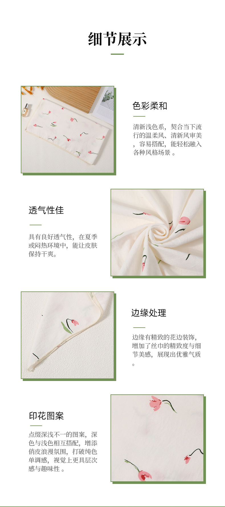 主面料成分: 涤纶(聚酯纤维) 款式: 方巾 功能: 遮阳 面料名称: 涤纶 尺寸: 70*70cm 处理工艺: 印花 适合季节: 春秋季 品牌: 晨明服饰 编织方法: 平纹 流行元素: 草莓 货号: LM70-008 产地: 义乌 颜色: 淡粉色郁金香印花 长度(CM): 70 主要下游平台: ebay,亚马逊,wish,速卖通,独立 有可授权的自有品牌: 是 是否跨境出口专供货源: 是 上市年份/季节: 2025夏季 主面料成分含量: 100% 风格: 日韩,卡通,自然,可爱,甜美,公主,度假