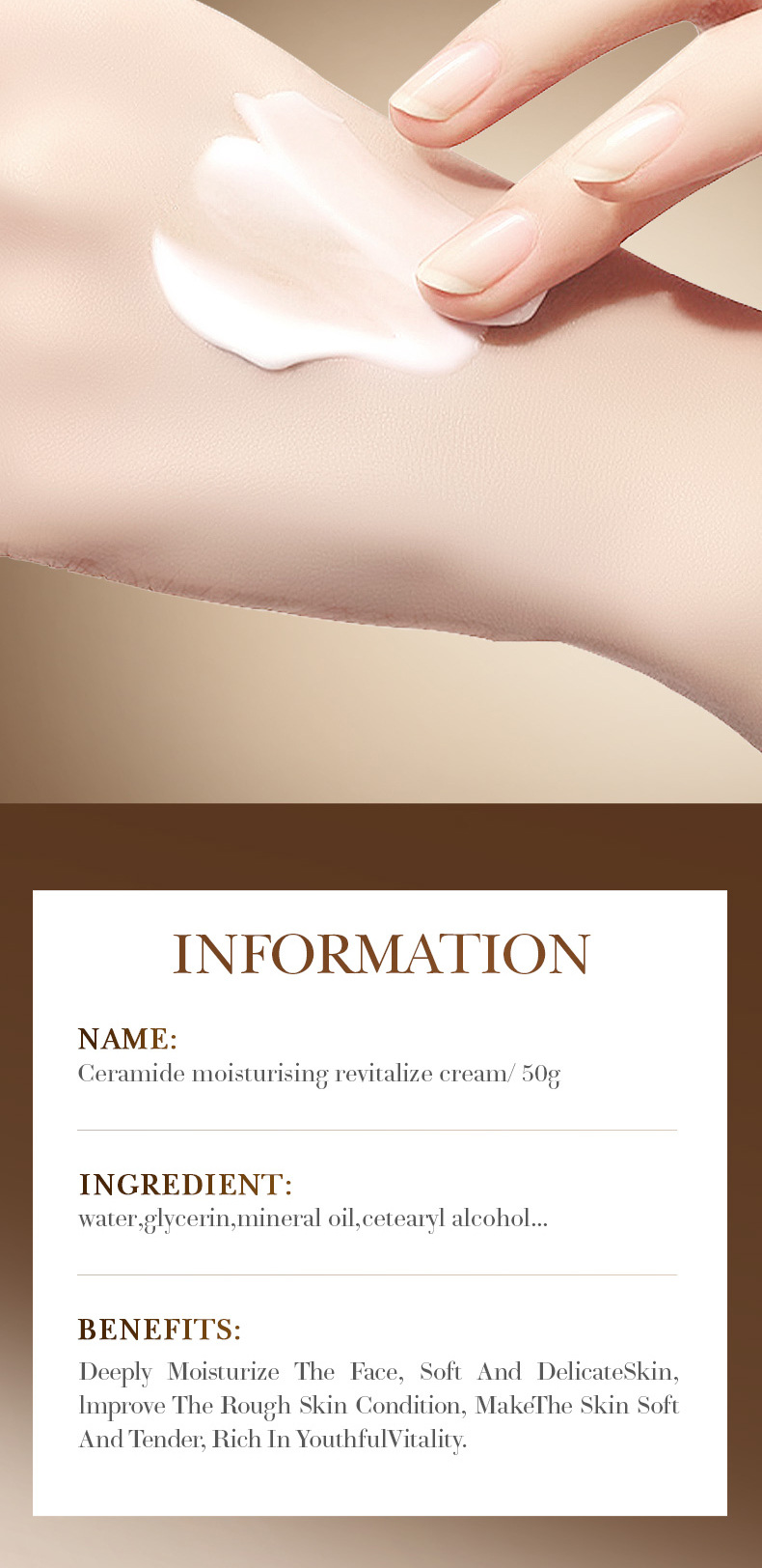 品牌: SADOER 规格: 正常规格 化妆品功效: 滋润 净含量: 50g 保质期: 3年 适用肤质: 通用 是否进口: 否 品牌类型: 国货品牌 产品名称: SADOER神经酰胺保湿活肤面霜(外文版 适用人群: 通用 货号: NO.SD50724 产地: 广州 主要下游平台: ebay,wish,速卖通,独立站,LA 有可授权的自有品牌: 是 是否跨境出口专供货源: 是 产品规格: 面霜50g[仅供外贸出口售,禁国内销售, 非特化妆品备案证号: 粤G妆网备字2024353618 特殊用途化妆品: 否 主要销售地区: 欧洲,南美,北美,东北亚,中东,其他