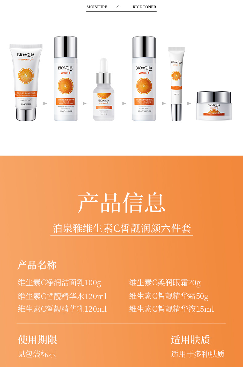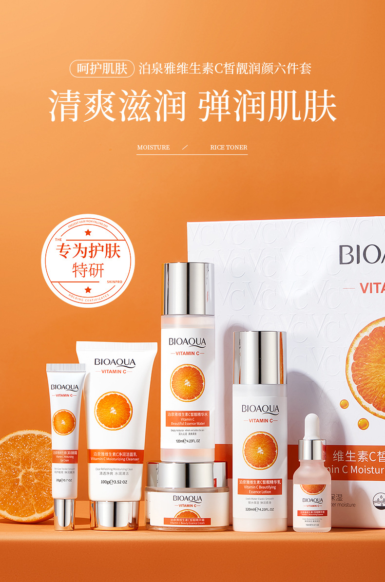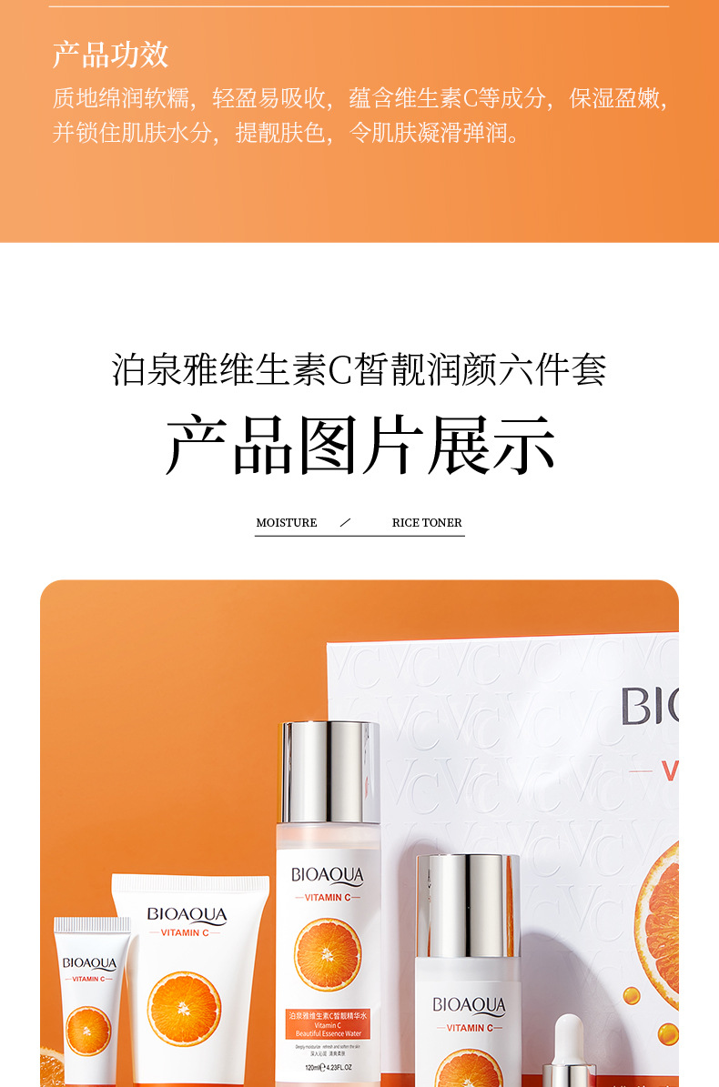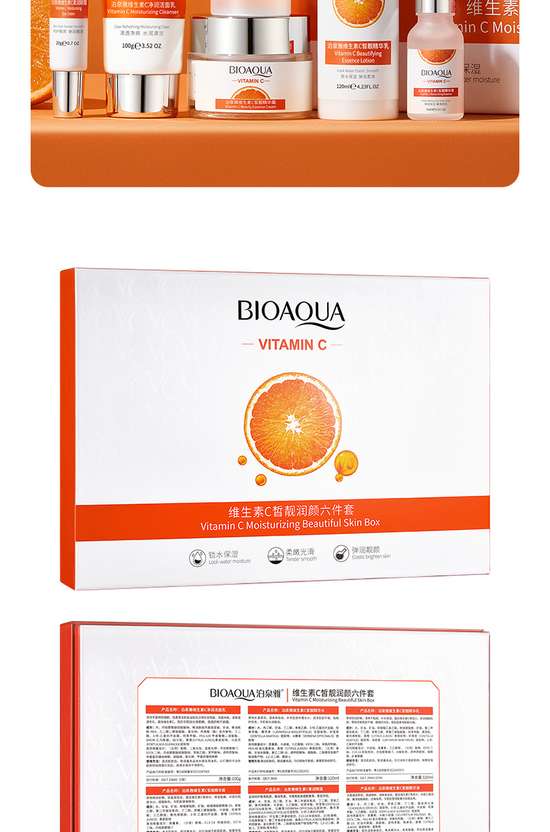 品牌: BIOAQUA 规格: 正常规格 化妆品功效: 补水保湿 适用肤质: 通用 净含量: 100g+120ml+120ml+20g 特殊用途化妆品: 否 是否进口: 否 品牌类型: 国货品牌 产品名称: 泊泉雅维生素C皙润靓颜六件套 适用人群: 通用 货号: NO.BQY97168 41081 保质期: 3年 主要下游平台: 亚马逊,速卖通 有可授权的自有品牌: 是 是否跨境出口专供货源: 是 产地: 广州 产品规格: 维生素C六件套 非特化妆品备案证号: 粤G妆网备字2024214830 主要销售地区: 东南亚