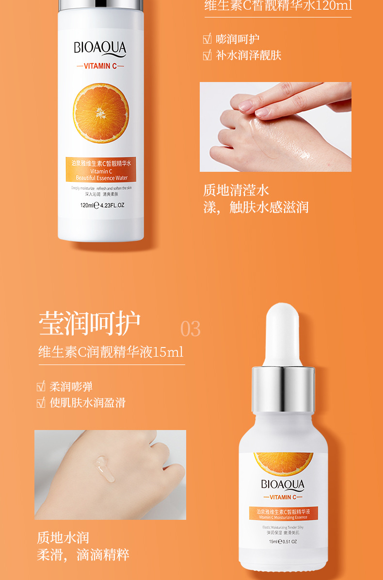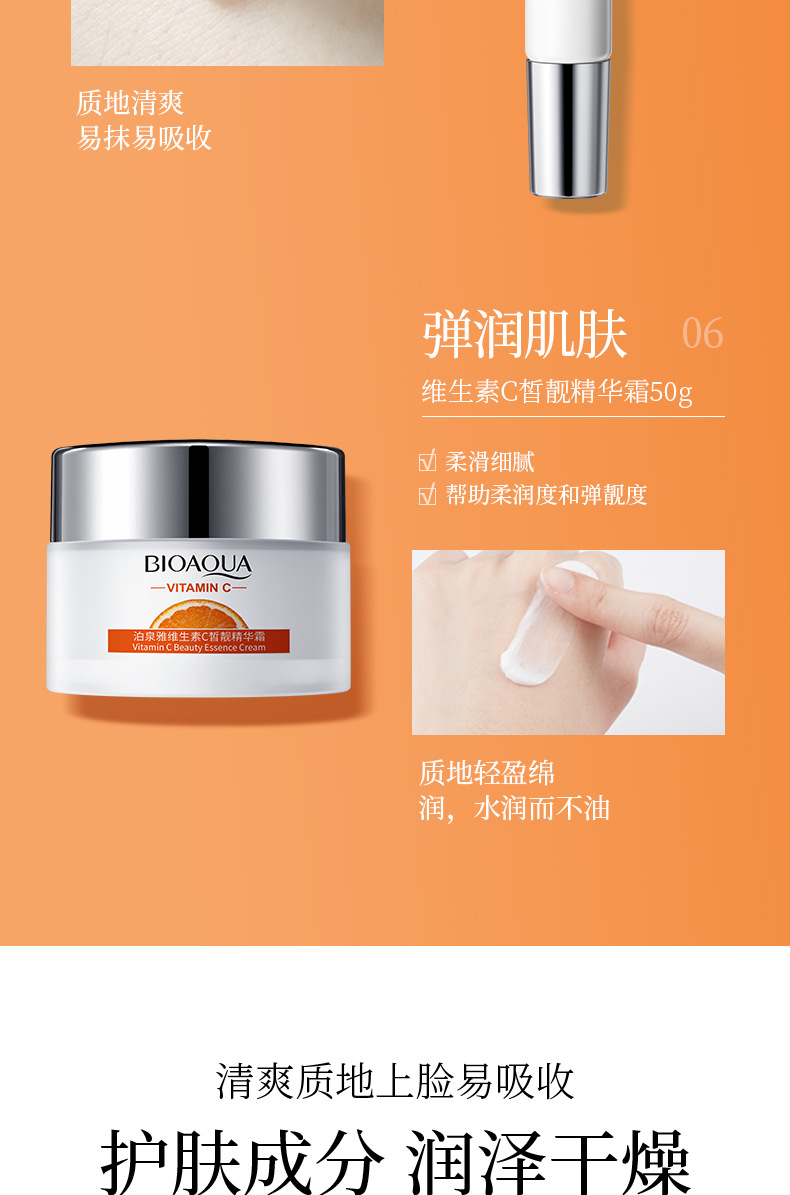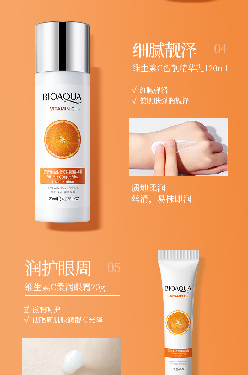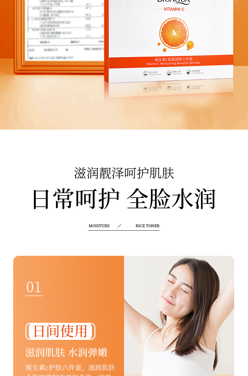 品牌: BIOAQUA 规格: 正常规格 化妆品功效: 补水保湿 适用肤质: 通用 净含量: 100g+120ml+120ml+20g 特殊用途化妆品: 否 是否进口: 否 品牌类型: 国货品牌 产品名称: 泊泉雅维生素C皙润靓颜六件套 适用人群: 通用 货号: NO.BQY97168 41081 保质期: 3年 主要下游平台: 亚马逊,速卖通 有可授权的自有品牌: 是 是否跨境出口专供货源: 是 产地: 广州 产品规格: 维生素C六件套 非特化妆品备案证号: 粤G妆网备字2024214830 主要销售地区: 东南亚