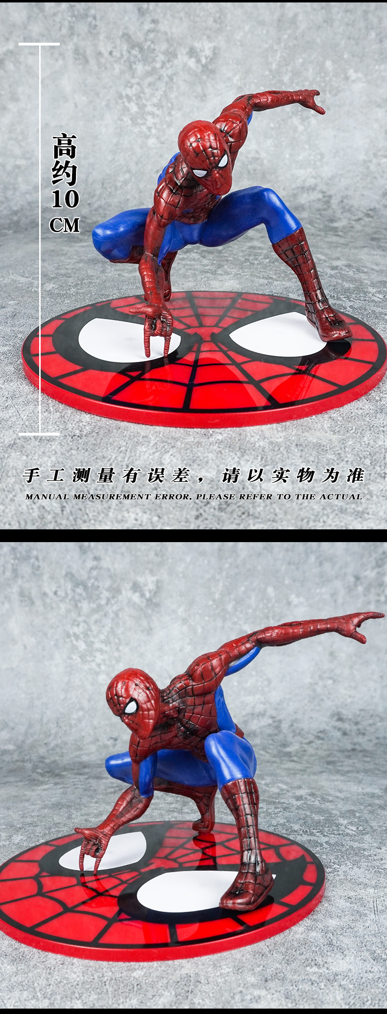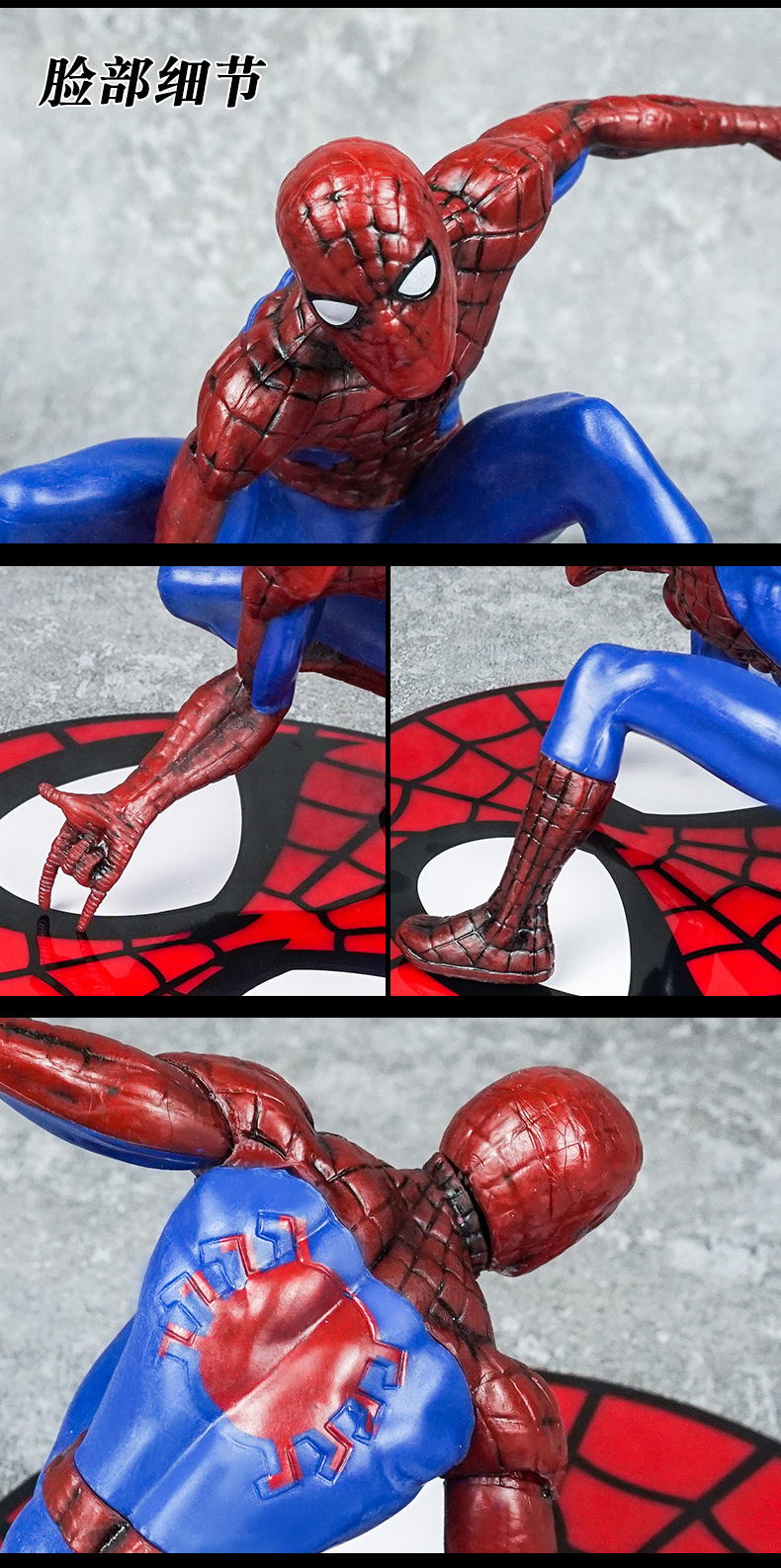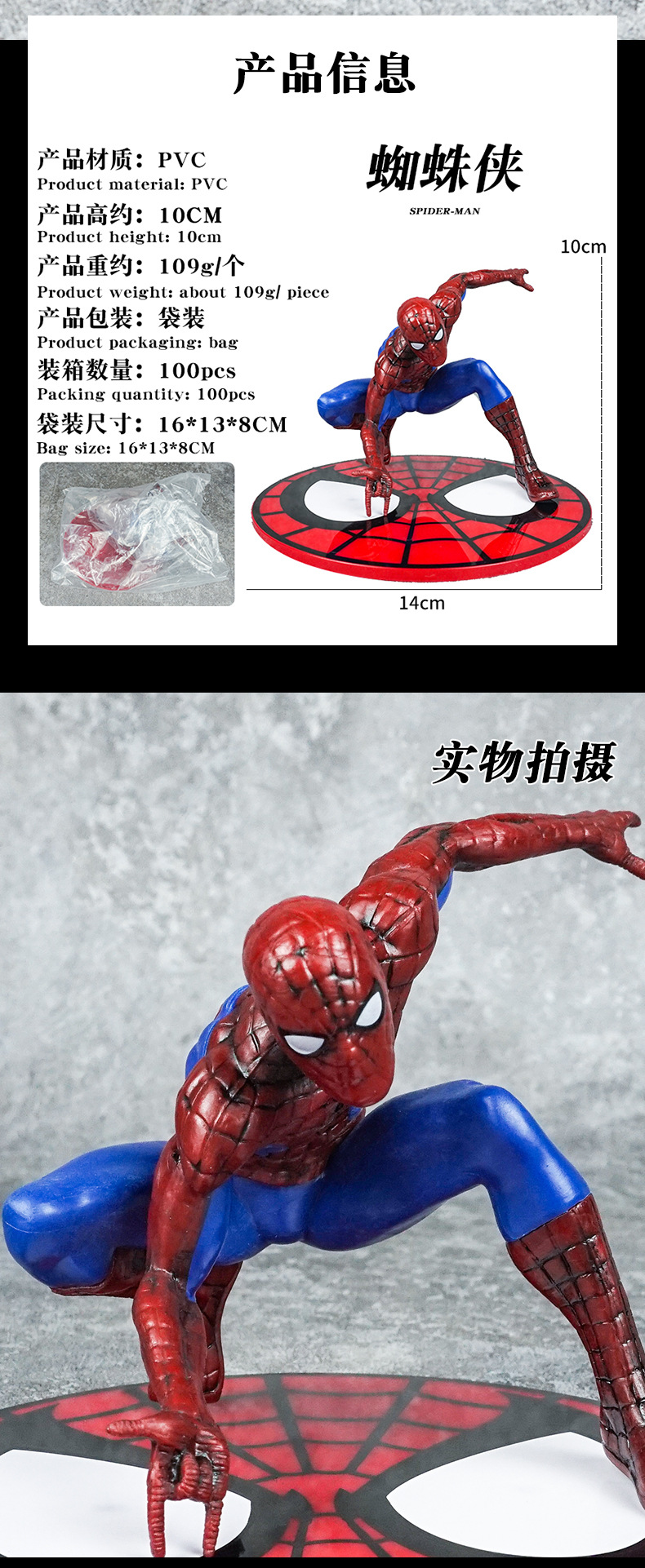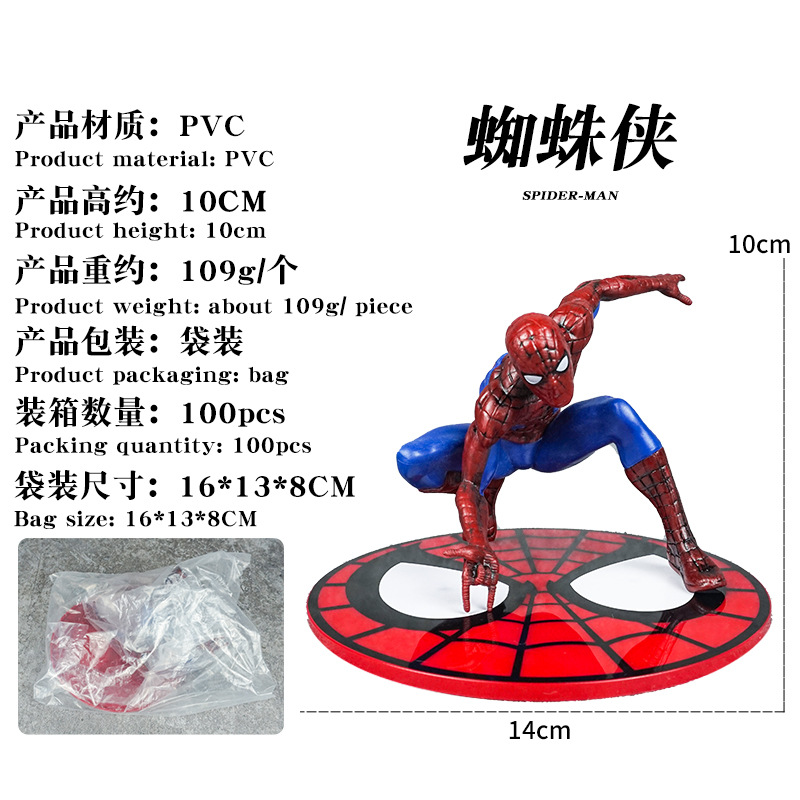 材质: PVC 品牌: 童年 动漫角色: 蜘蛛侠 包装方式: 彩盒,网袋 规格: 袋装/盒装,产品高度约10CM 适用年龄: 少年(7-14岁) 产地: 大陆 是否有动漫形象: 是 货号: ZZX 是否有导购视频: 是 是否拼装: 是 是否专供外贸: 否 3C配置类别: 14岁以上的玩具 颜色: 蜘蛛摆件【袋装】 主要销售地区: 南美,东南亚,北美,东北亚,中东,其他 是否跨境出口专供货源: 是 重量: 0.5 kg/个