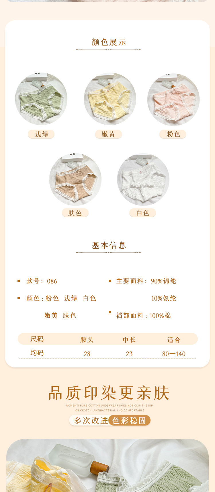 面料名称: 锦纶/尼龙 裆部里料成分: 棉 品牌: 泰兰雅莉 功能: 无痕,速干,透气,收腹,防走光 腰型: 中腰 适用人群类别: 女士 货号: 086 织法: 针织 包装形式: 散装 是否支持代工: 不支持 产地: 汕头 是否无缝: 是 图案: 纯色 颜色: 粉色,淡黄,绿色,浅咖,奶白 尺码: F(80-140斤) 是否进口: 否 是否跨境出口专供货源: 否 适合季节: 春季 裆部里料成分含量: 90%(含)-95%(不含) 上市时间: 2023年春季 重量: 0.5 kg/条