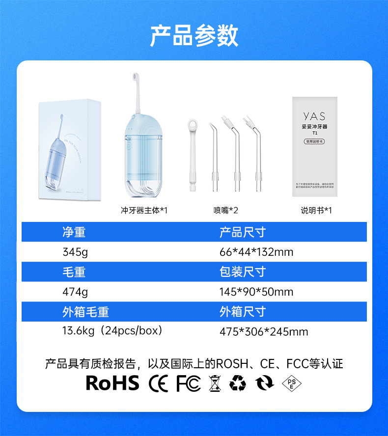 款式: 便携 品牌: yas/牙喜 内置蓄电池容量: 1200mAh-2000mAh(含) 防水等级: IPX7 续航时长: 15天以上 是否内置电池: 内置电池 适用人群: 成人 容量: 300mL以下 泵类型: 活塞泵 颜色: 白色,浅蓝色 重量: 0.5 kg/件