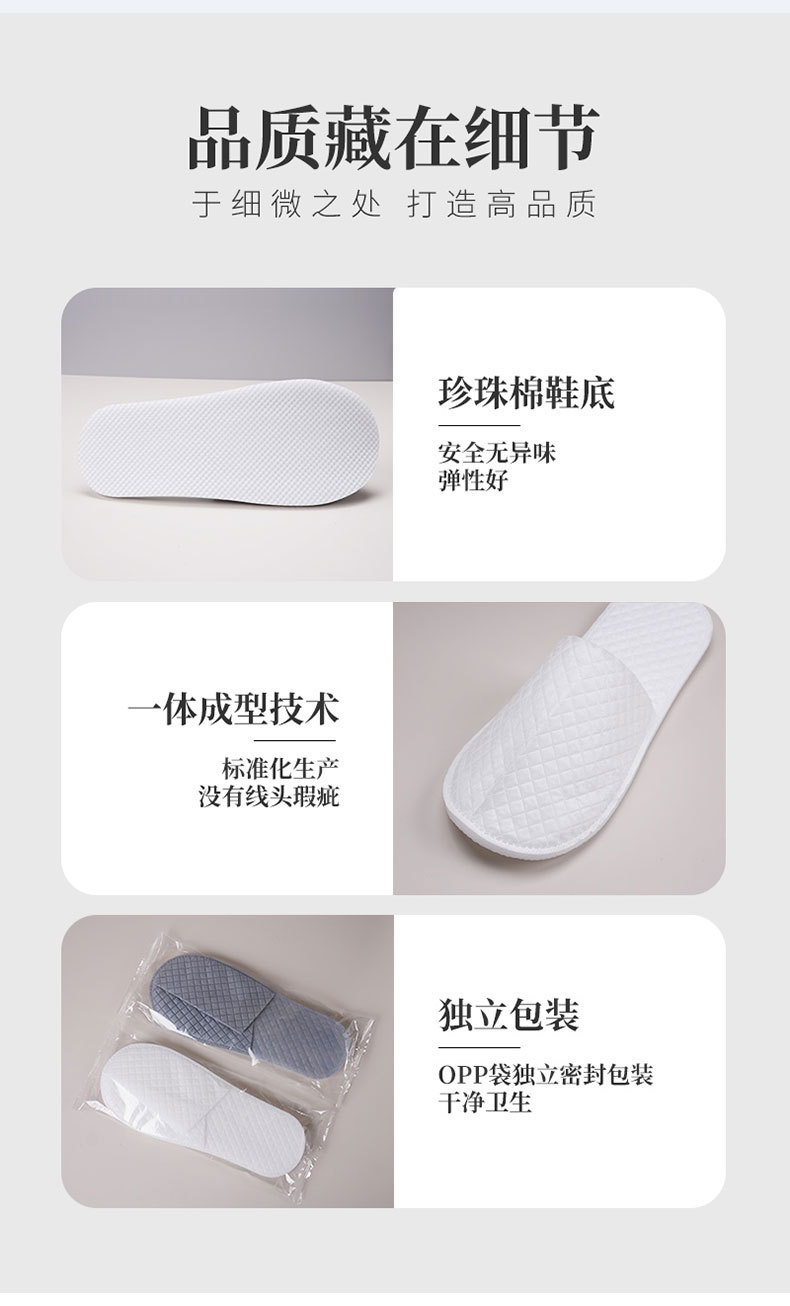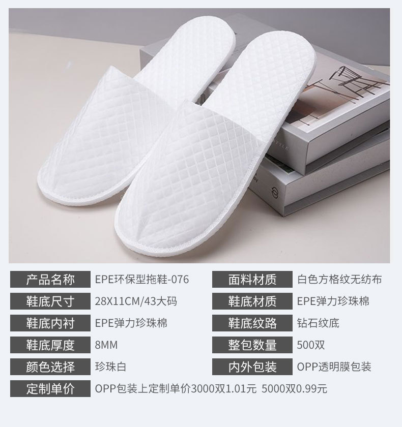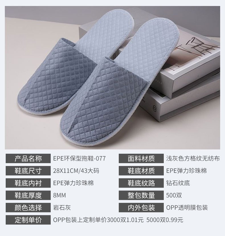 材质: 布 功能: 防滑 厚度: 8mm 品牌: 汇美洁 适用对象: 通用 尺码: 44码 是否进口: 否 加印LOGO: 可以 加工定制: 是 货号: 一次性拖鞋2 产地(国内): 安徽省 箱装数量: 700双 价格段: 0.8-1.1 毛重: 150克/100克 只数: 2只/包 规格: 【EPE环保鞋底】43码-44码 是否跨境出口专供货源: 是 是否有专利: 否 风格: 日式,简约,轻奢 重量: 0.335 kg/双