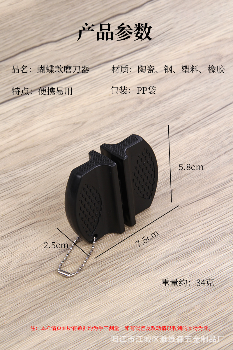 材质: 陶瓷 功能: 磨刀 是否进口: 否 货号: 迷你蝴蝶磨刀器 产地: 阳江 加印LOGO: 可以 产品上市时间: 2020年秋 价格段: 5元以内 加工定制: 否 是否有专利: 无 规格: 黑色,红色,黄色,绿色 主要下游平台: 亚马逊 主要销售地区: 欧洲,东南亚,北美,中东 有可授权的自有品牌: 否 是否跨境出口专供货源: 是 风格: 现代简约 重量: 0.5 kg/个