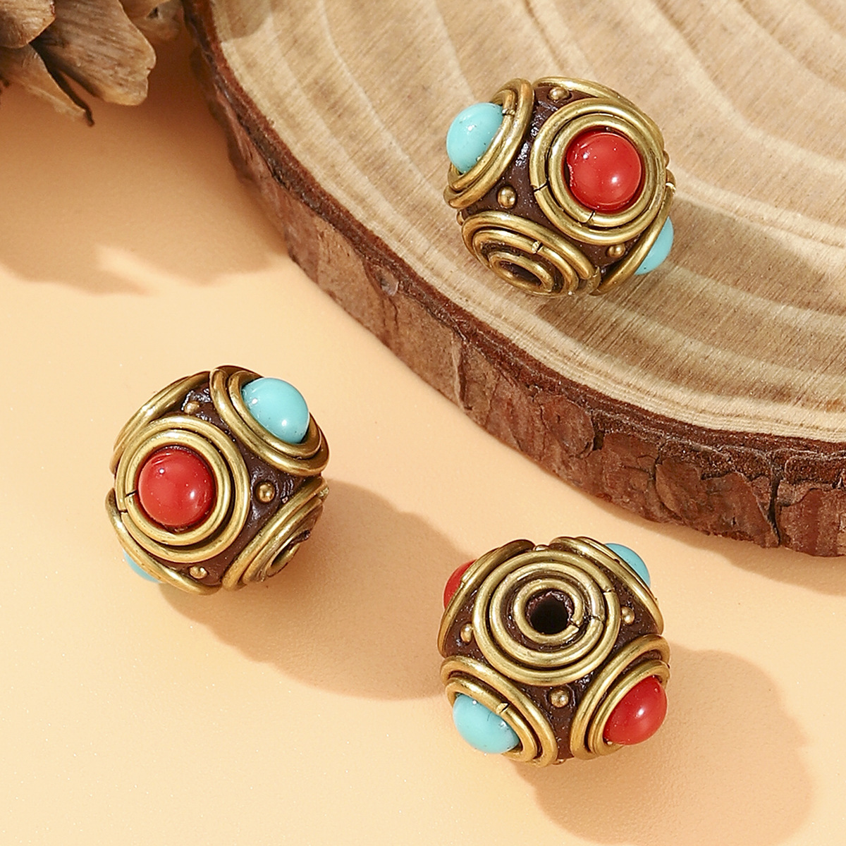 藏式尼泊尔复古桶珠镶嵌红蓝松石DIY手工饰品配件隔珠黄铜圆珠
