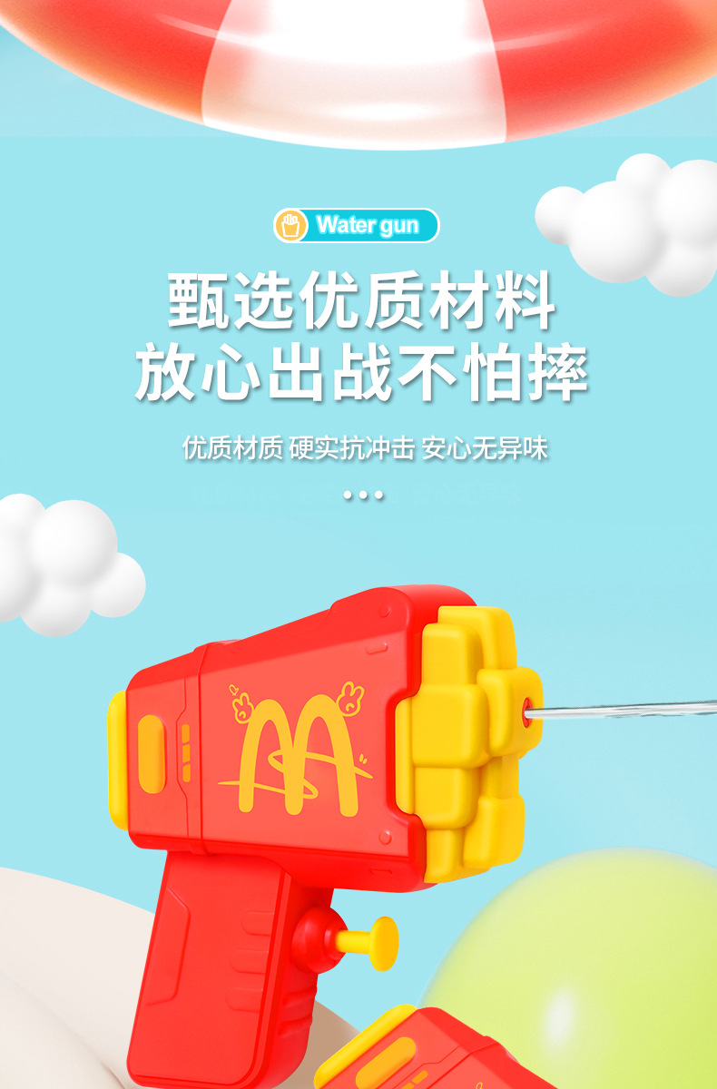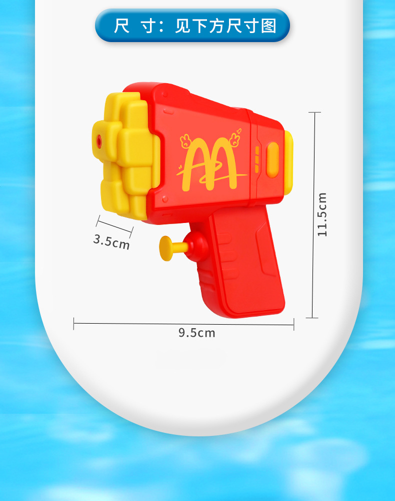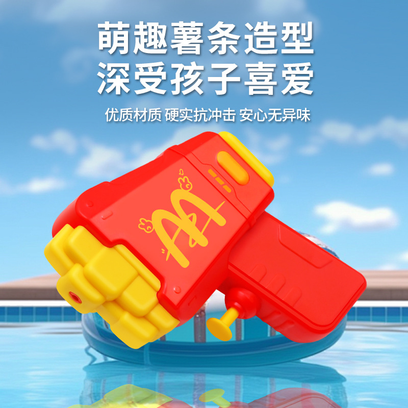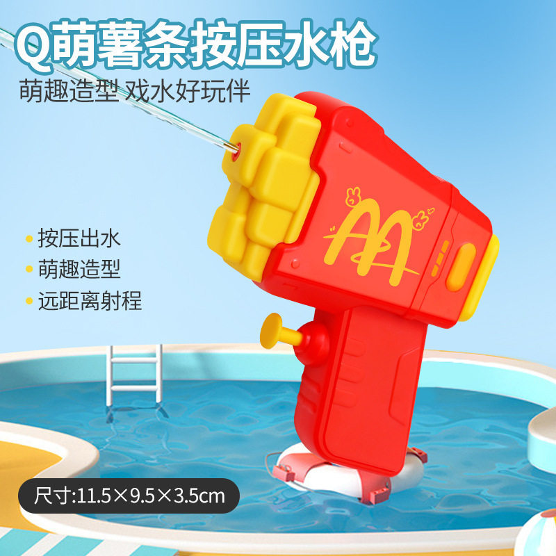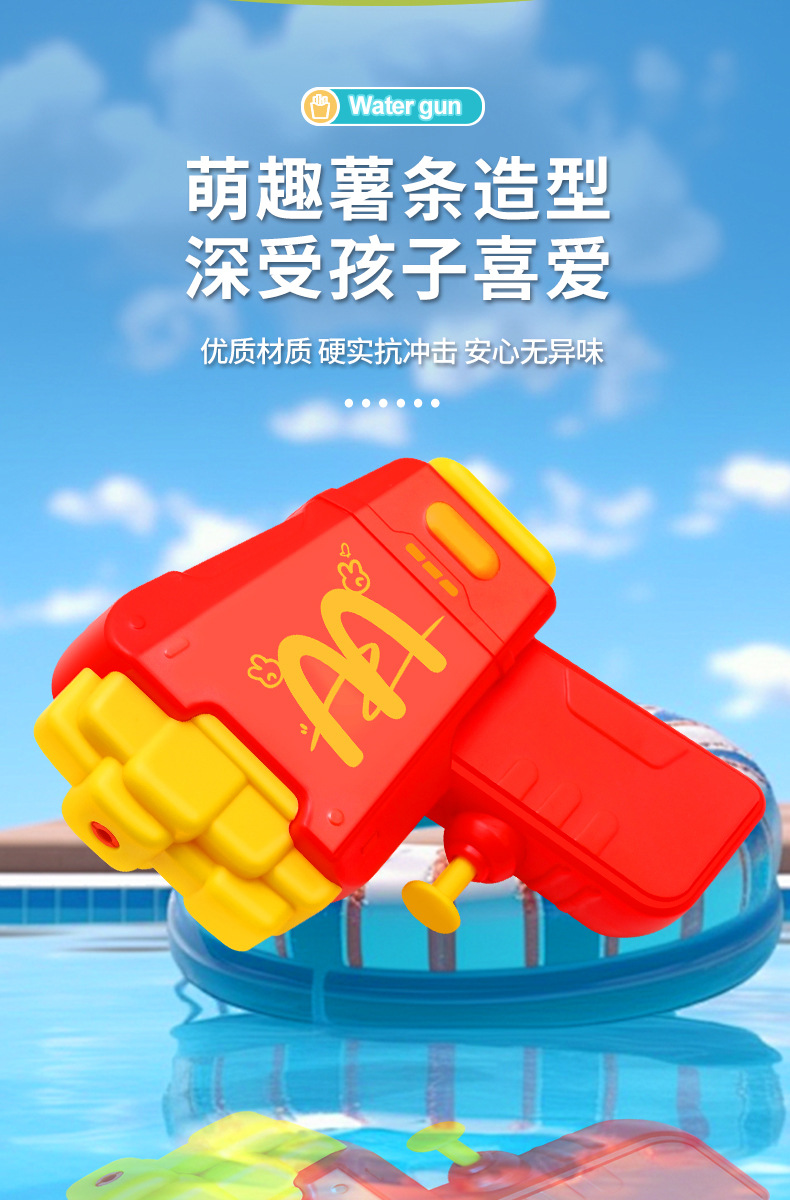 材质: 塑料/塑胶 功能: 出水,滋水,射水,按压喷水 品牌: 其他 规格: 9.5*3.5*11.5cm 包装方式: OPP袋 戏水玩具类别: 戏水水枪 适用年龄: 儿童(4-6岁) 产地: cn 货号: 81007 能力培养: 动手动脑,抓握,亲子交流 是否有动漫形象: 否 专利及著作权申请时间: 无 是否有导购视频: 是 产品类别: 戏水玩具 类别: 水枪 是否专供外贸: 否 3C配置类别: 14岁以下的塑胶玩具 商品3C认证码: 2024152202054897 颜色: 薯条按压水枪81007 是否跨境出口专供货源: 否