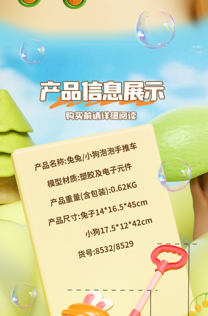 材质: 塑料/塑胶 功能: 多孔出泡 品牌: 其他 包装方式: 其它 适用年龄: 儿童(4-6岁) 商品3C认证码: 2024152202051698 是否有导购视频: 是 产地: 中国大陆 规格: 个 货号: 8532 能力培养: 视觉,抓握,感官,手眼协调,互动玩具,听 是否有动漫形象: 否 是否专供外贸: 否 3C配置类别: 14岁以下的塑胶玩具 颜色: 8532萝卜兔泡泡推车【充电款】,852 是否跨境出口专供货源: 否 适用性别: 男女通用 包装: 电商盒 玩具类型: 塑胶玩具