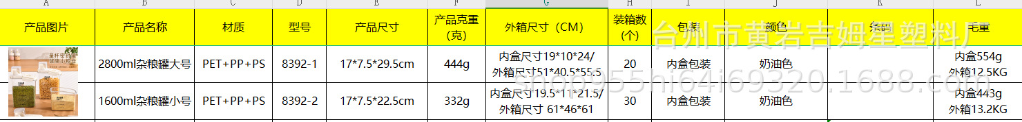 材质: PET+PP+PS 品牌: 吉姆星 形状: 方形 容量: 2.1-3L 是否一次性: 否 产品质量等级: 优等品 微波炉: 不可用 是否进口: 否 货号: jmx-8392 产地: 台州 风格: 现代简约 加印LOGO: 可以 贸易属性: 内贸+外贸 箱装数量: 小号30 大号20 产品上市时间: 2024 价格段: 5-10元 加工定制: 是 盒子层数: 1 是否有专利: 无 颜色: 奶油色小号1600ml,奶油色大号280