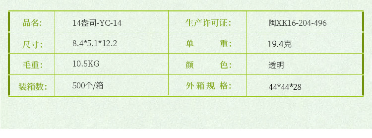 材质: PS 品牌: 金五缘 加印LOGO: 可以 尺寸: 84*51*122 容量: 420ML 用途: 31045258708 形状: 圆形 进口: 否 产地(国内): 福建省 图案: 纯色 塑料: PS/聚苯乙烯 全国工业生产许可证编号: 闽XK16-204-00496 是否可降解: 否 加工定制: 是 保质期: 36 毛重: 22g 货号: YC-14直筒杯 箱装数量: 50个/箱 只数: 20个 价格段: 见标注