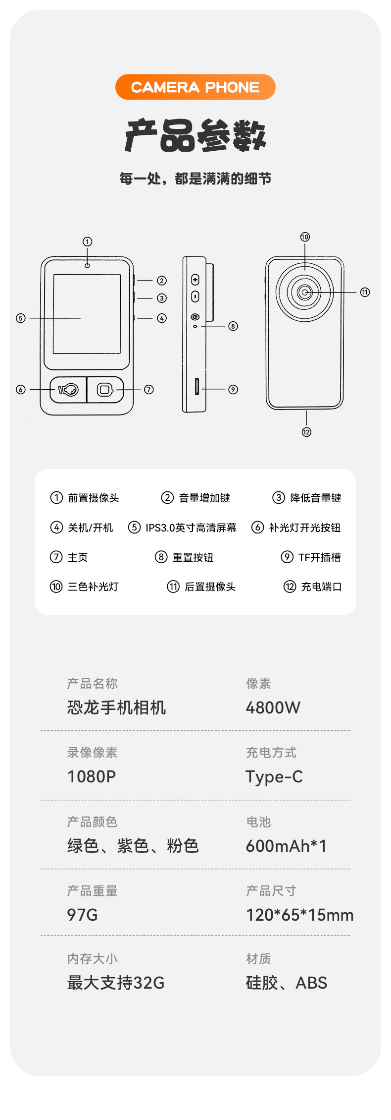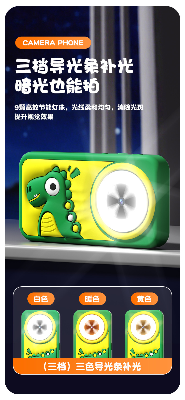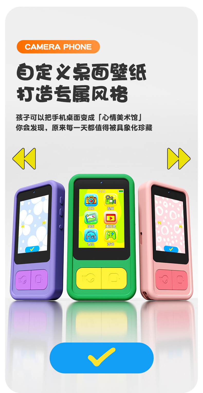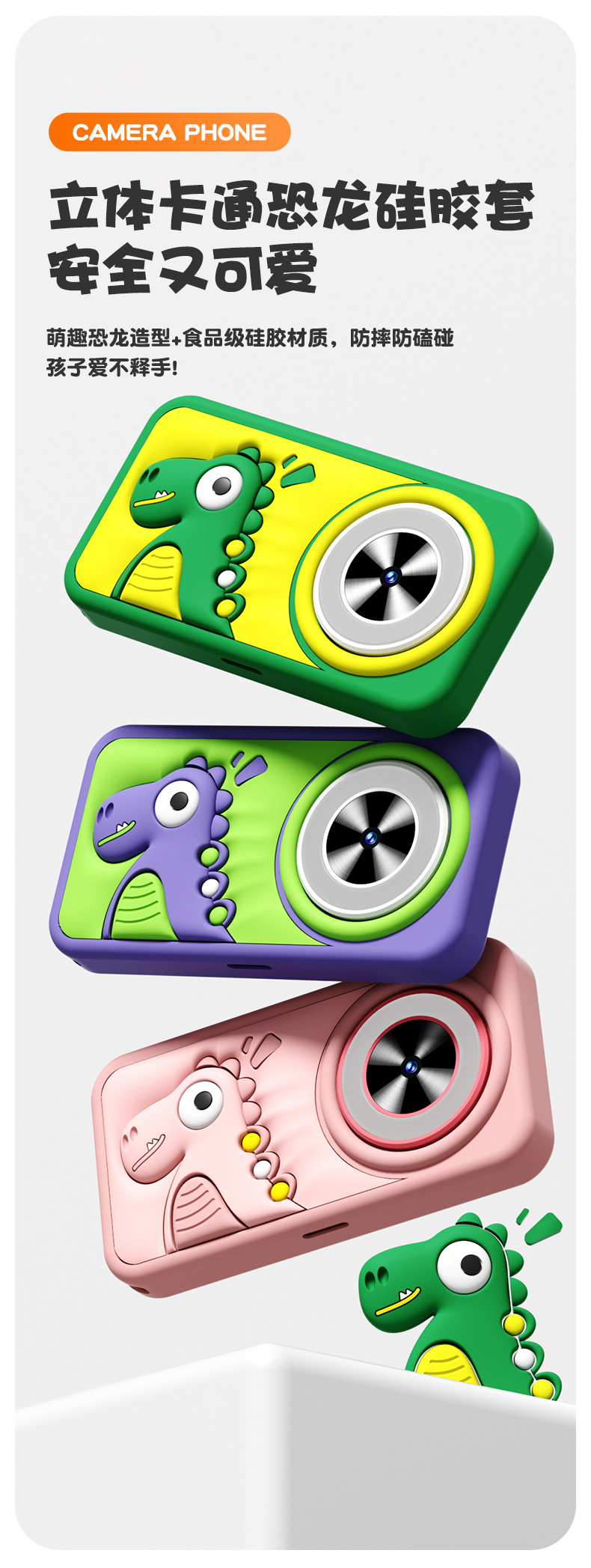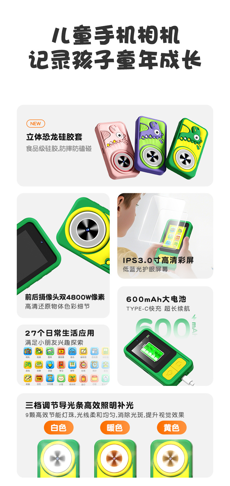 全贴合总成,全点触控,操作流畅灵敏,前后双摄真实100万像素,插值4800万,9颗灯珠导光条三档有效照明补光,还原物体真实色彩,24M内置运行内存远超同行,内置20+小游戏。经典恐龙精致高品质立体硅胶套,真实IPS高清屏(同行大多用TN屏 像素偏黄)拍照录像20倍变焦(同行8倍)