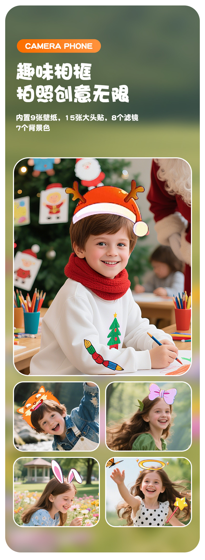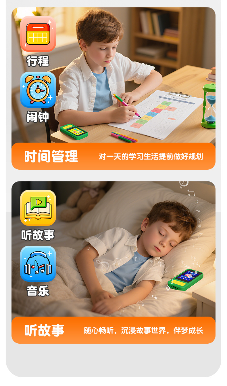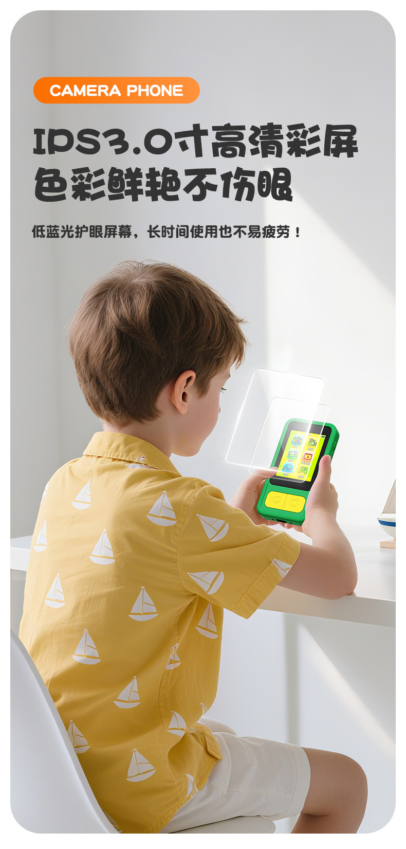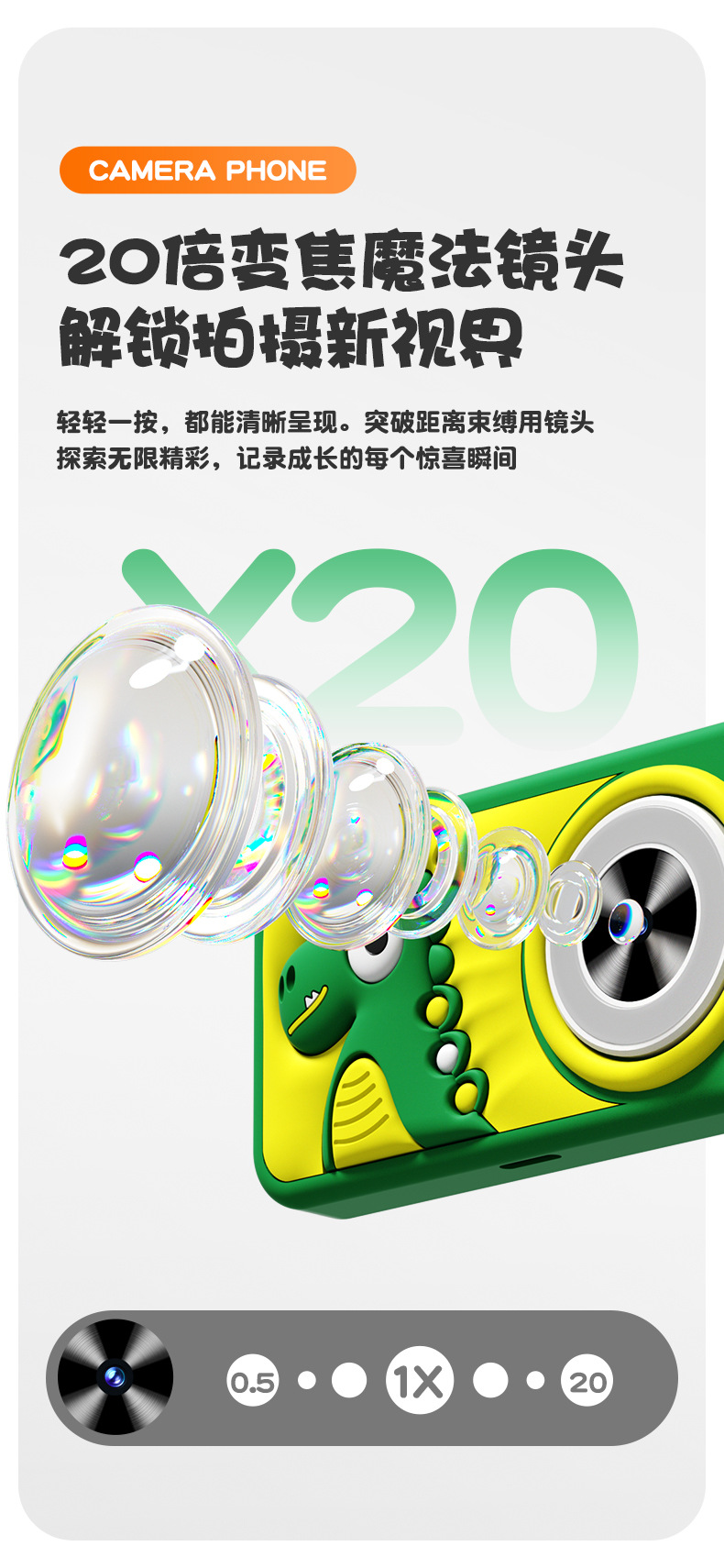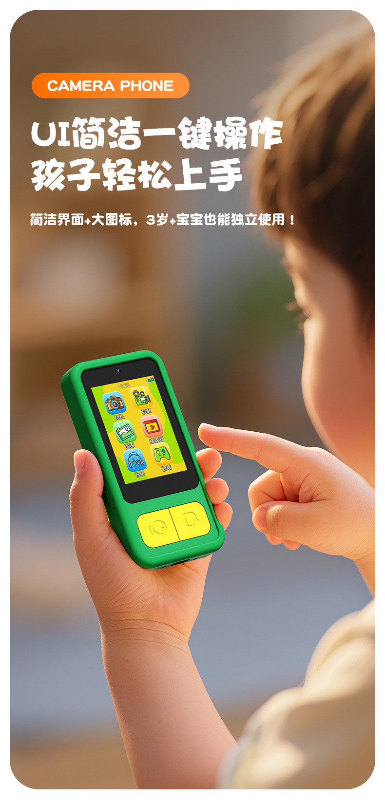全贴合总成,全点触控,操作流畅灵敏,前后双摄真实100万像素,插值4800万,9颗灯珠导光条三档有效照明补光,还原物体真实色彩,24M内置运行内存远超同行,内置20+小游戏。经典恐龙精致高品质立体硅胶套,真实IPS高清屏(同行大多用TN屏 像素偏黄)拍照录像20倍变焦(同行8倍)