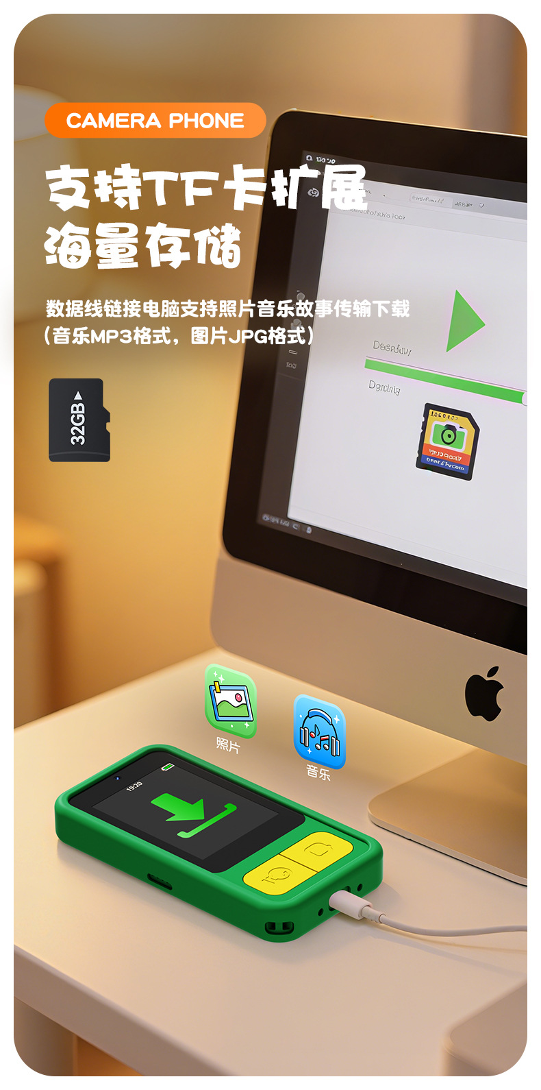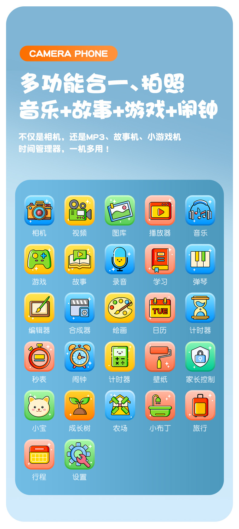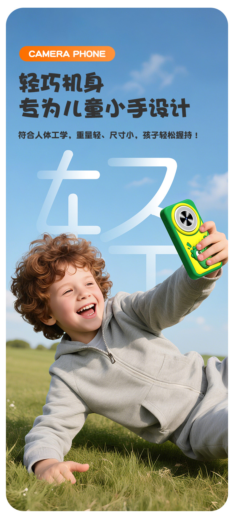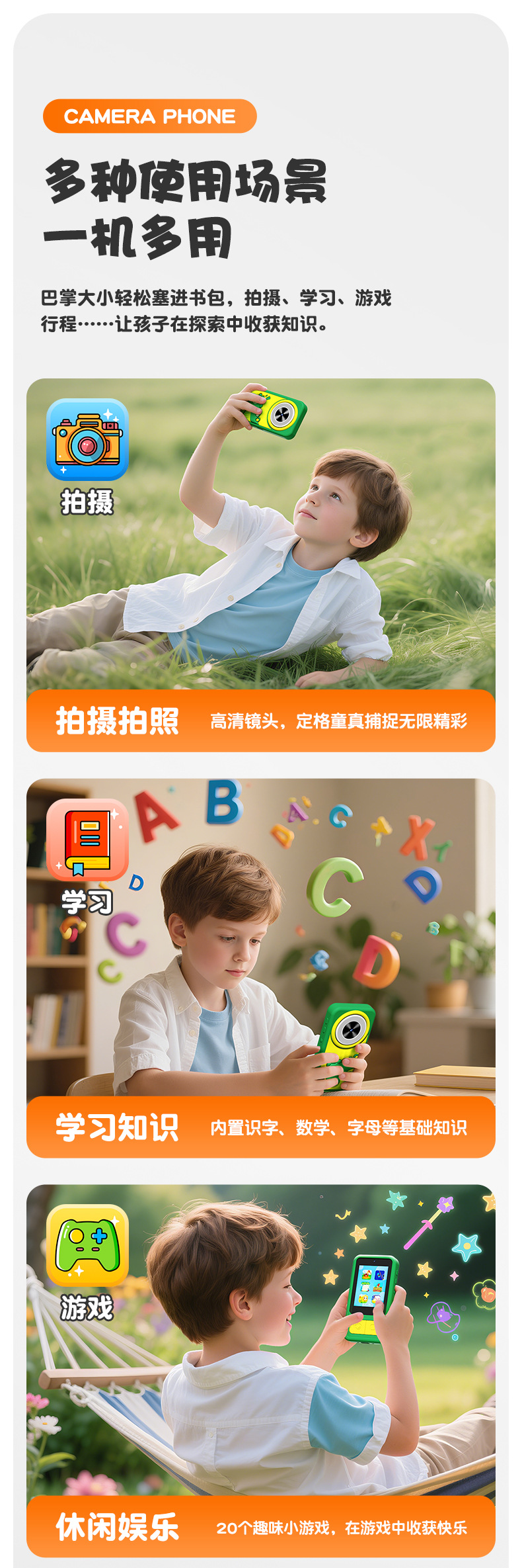 全贴合总成,全点触控,操作流畅灵敏,前后双摄真实100万像素,插值4800万,9颗灯珠导光条三档有效照明补光,还原物体真实色彩,24M内置运行内存远超同行,内置20+小游戏。经典恐龙精致高品质立体硅胶套,真实IPS高清屏(同行大多用TN屏 像素偏黄)拍照录像20倍变焦(同行8倍)