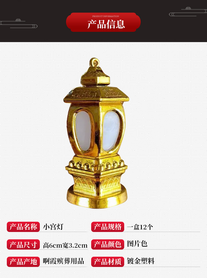 材质: 镀金塑料 种类: 殡葬用品 工艺: 手工 品牌: 1 货号: 小宫灯 加工定制: 是 产品编号: 1 是否专利货源: 否 是否进口: 否 是否跨境出口专供货源: 否 重量: 0.222 kg/个