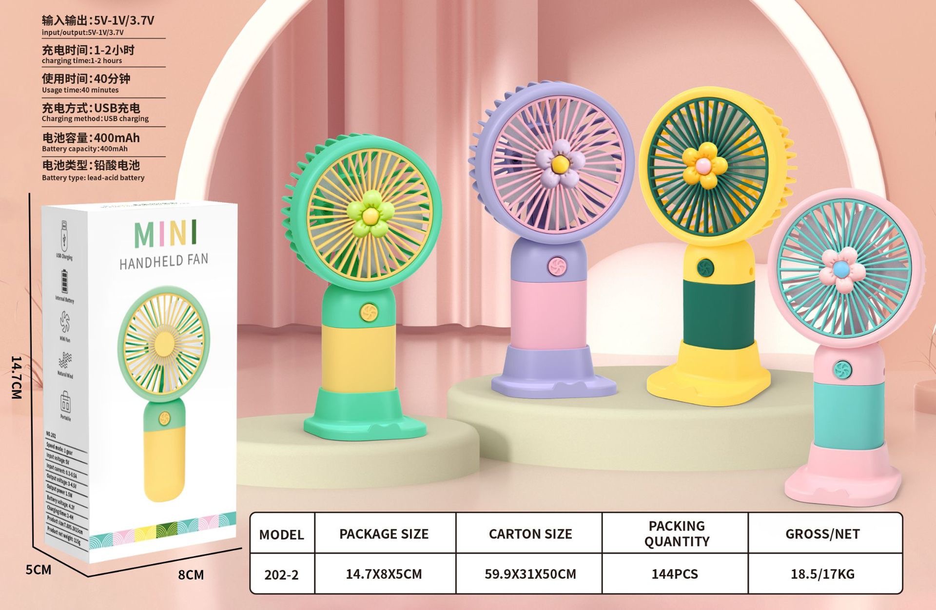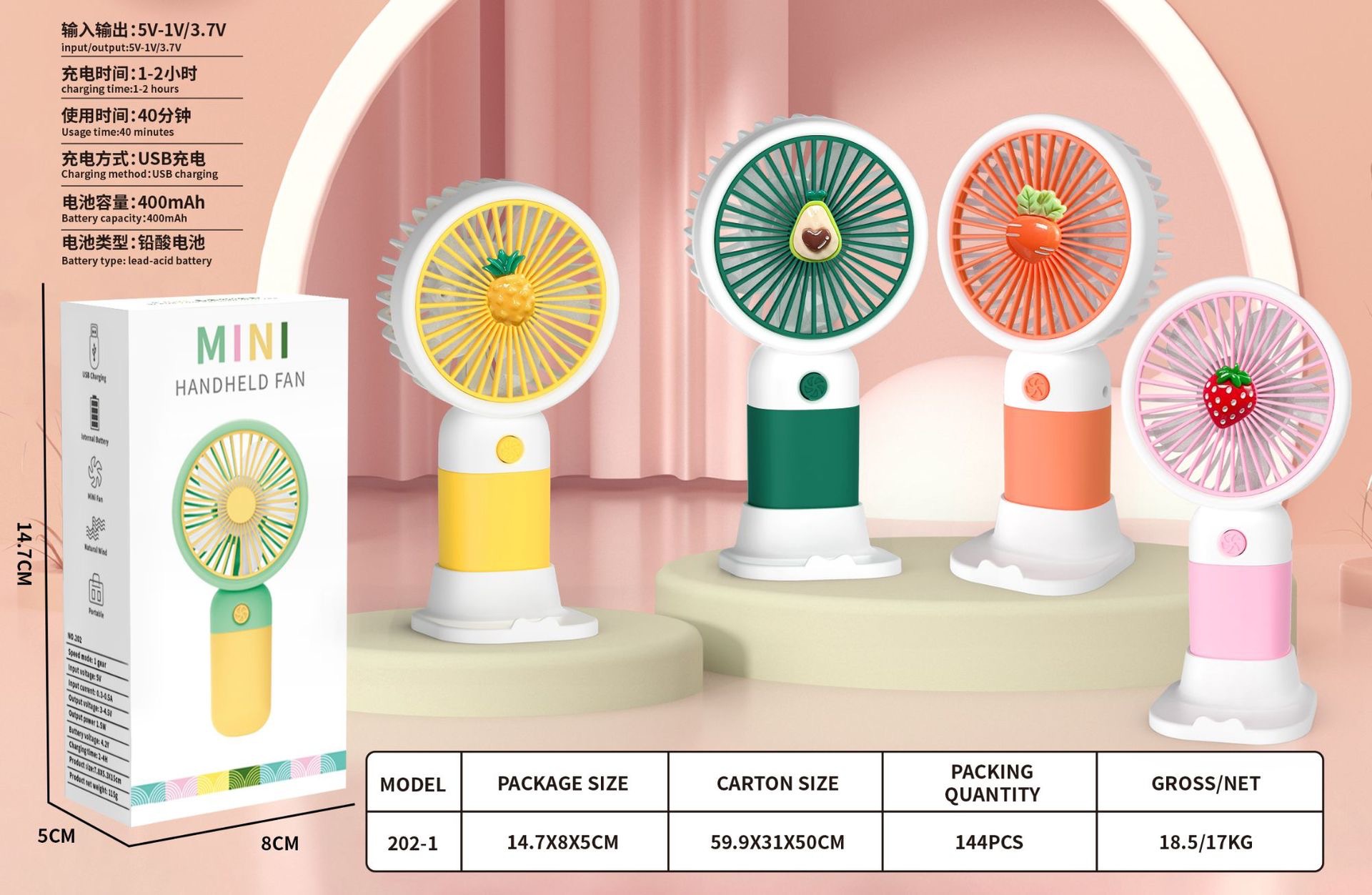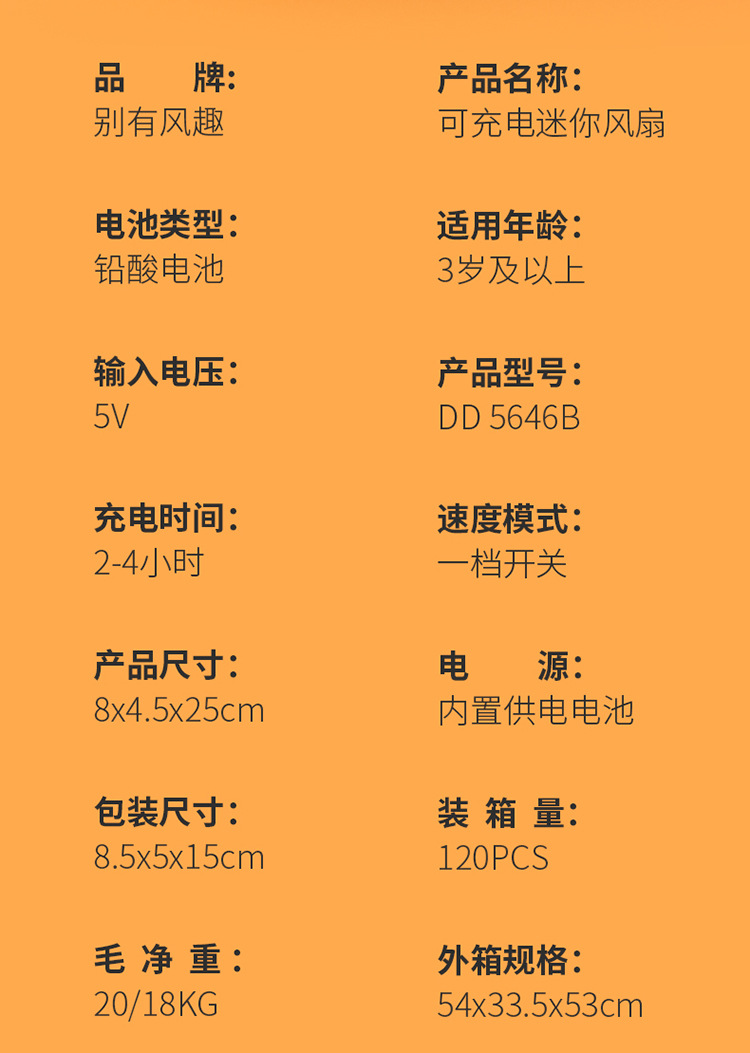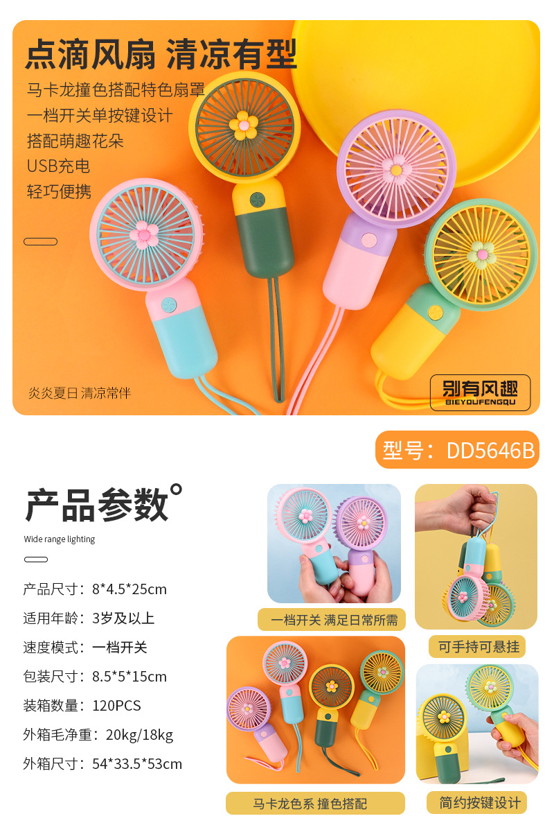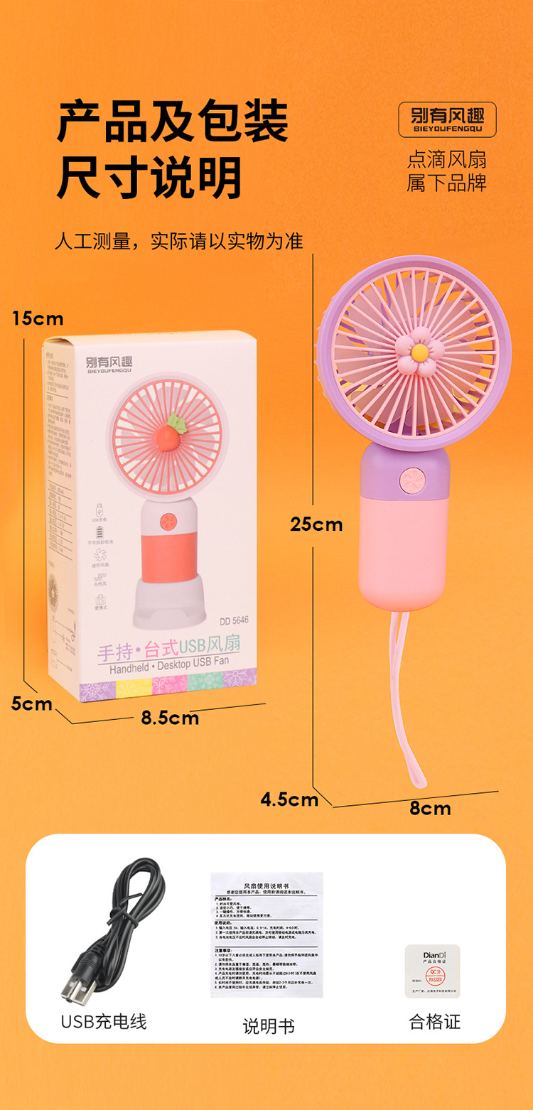 电源方式: USB 风扇分类: 手持风扇 续航时长: 1-3h(含) 风速档位: 1档 噪音: 36dB(A)以下 附加功能: 3226293 规格: 1 品牌: 其他 适用面积: 1 操作方式: 普通按钮 是否支持充电: 不支持 包装体积: 正常规格 扇叶直径: 水果随机【英文彩盒】带底座,花朵随机【英 货号: 031 主要下游平台: 亚马逊,wish,速卖通,独立站 主要销售地区: 欧洲,东南亚,欧美,其他 有可授权的自有品牌: 否 是否跨境出口专供货源: 是 是否内置电池: 内置电池 内置蓄电池容量: 300mAh-500mAh(含)