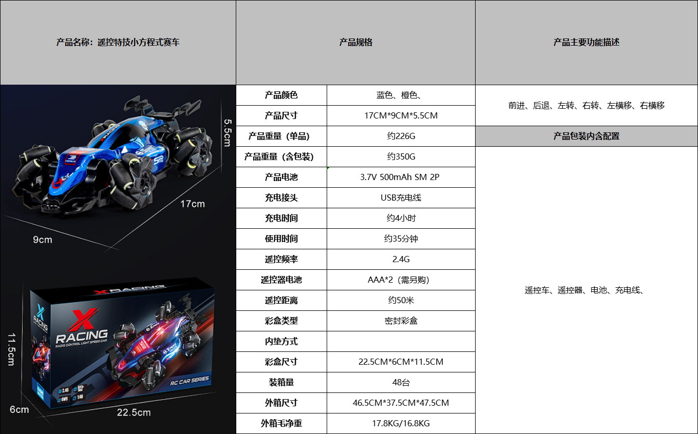 玩具材质: 塑料 品牌: JJRC 类型: 充电 遥控方式: 手柄 特色功能: 灯光,防撞 适用人群: 不限,女孩,男孩 适用年龄: 少年(7-14岁) 原产地: 广东汕头澄海 是否进口: 国产 包装: 彩盒 能力培养: 视觉,抓握,感官,手眼协调,其他能力培养 车型品牌: 方程式赛车 是否有动漫形象: 否 货号: Q239 是否有导购视频: 是 是否专供外贸: 是(本商品仅供外贸用途,可能不符合境内产 颜色: 蓝色(英文版),橙色(英文版) 主要下游平台: ebay,亚马逊,wish,速卖通,其他 主要销售地区: 欧洲,南美,东南亚,北美,其他 有可授权的自有品牌: 是